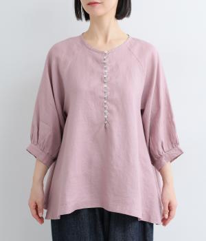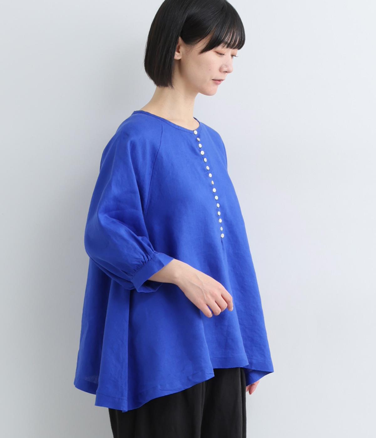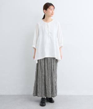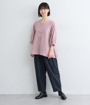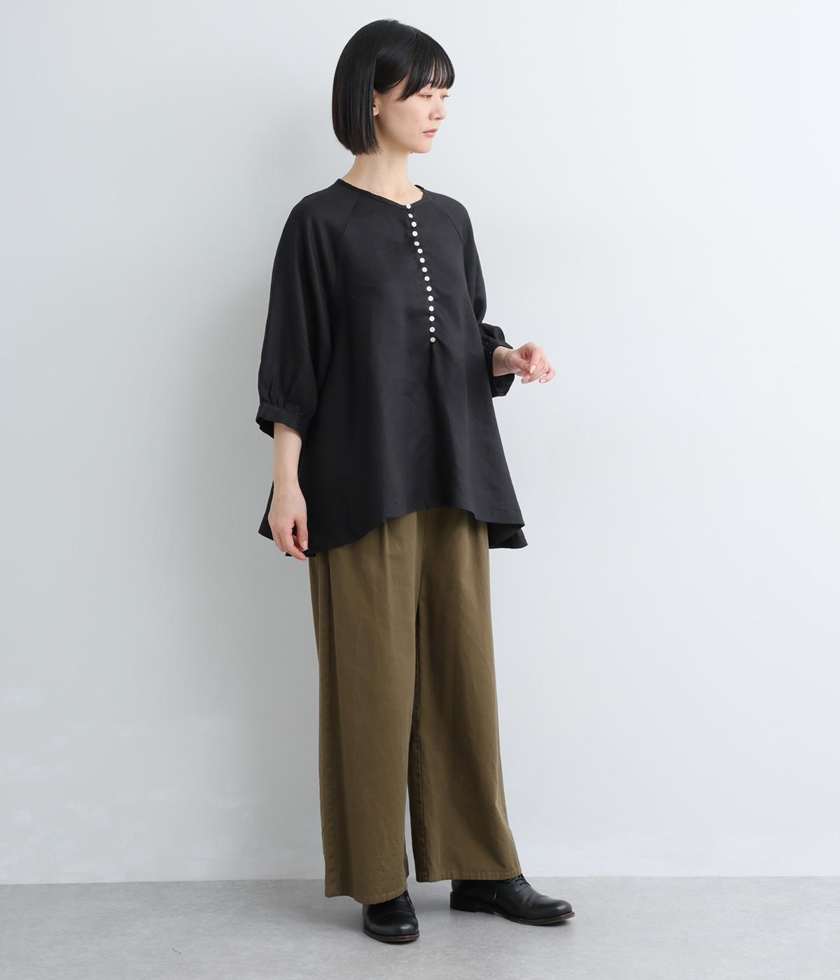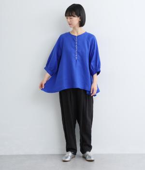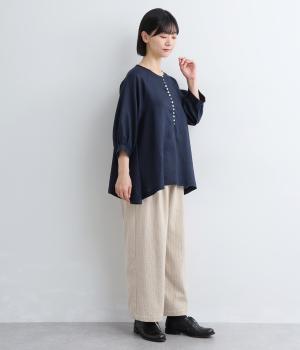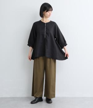 多ボタンがクラシカルな雰囲気のブラウスをノーカラーと7分袖ですっきりと仕立てました。サイドに長さを持たせた裾が優雅なラインをつくります。一枚ではもちろん、タートルニットなどと重ねても◎。シーズン通して着まわせるアイテムです。