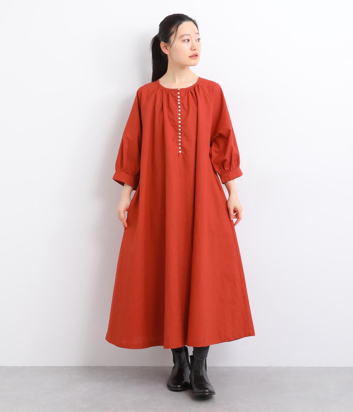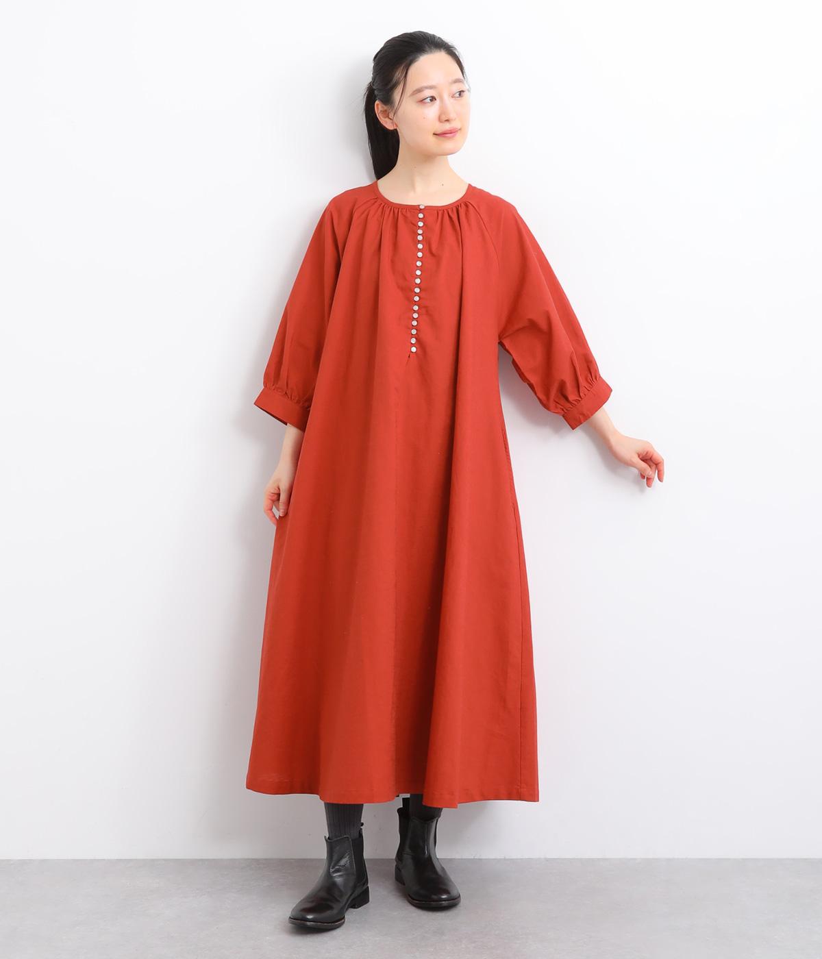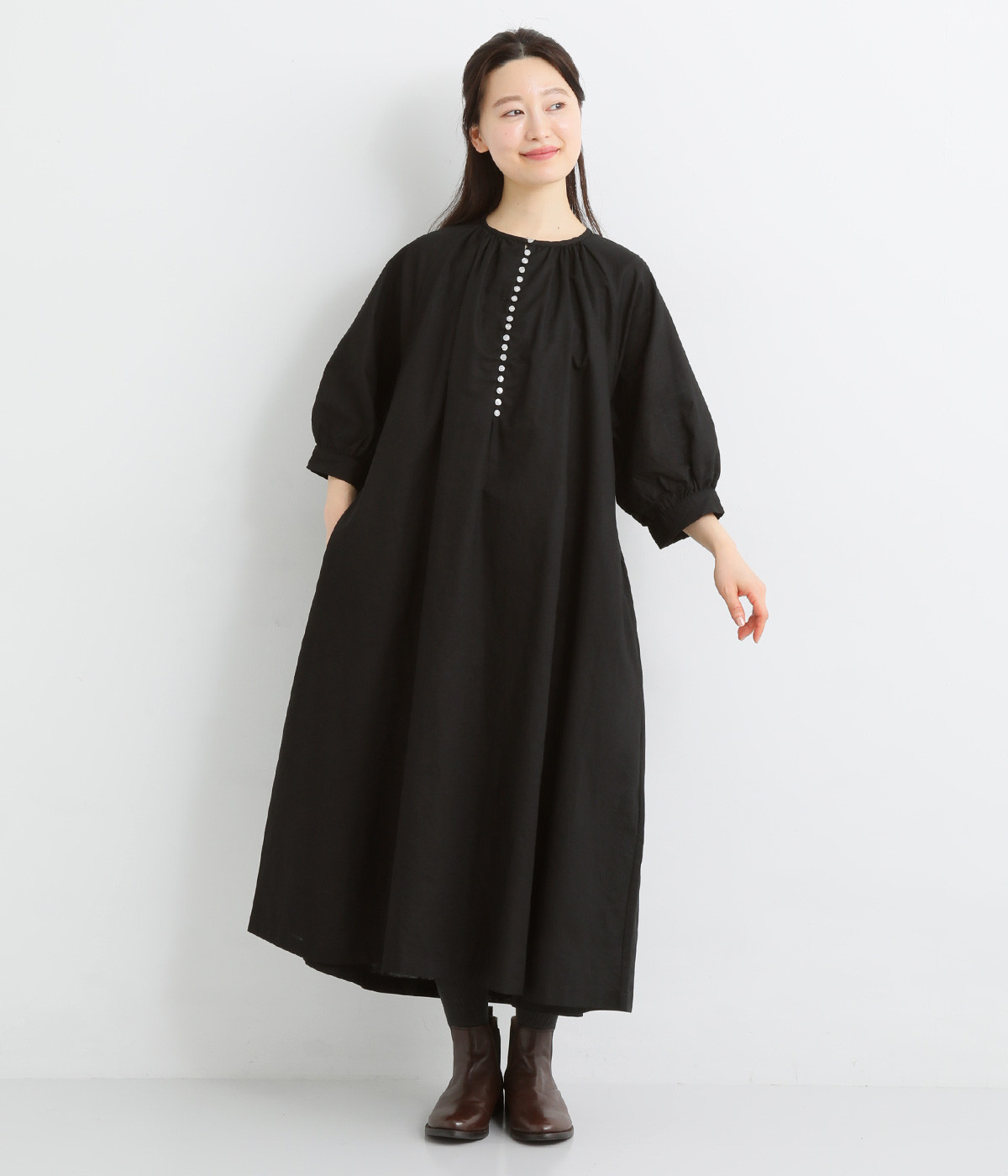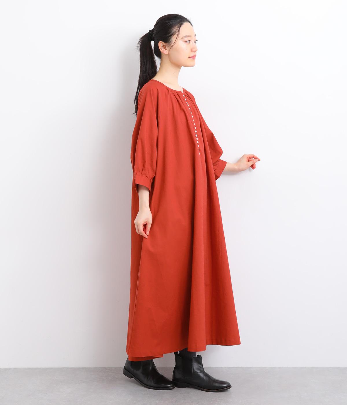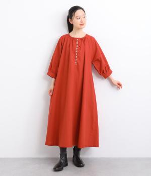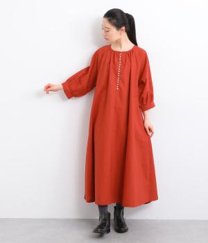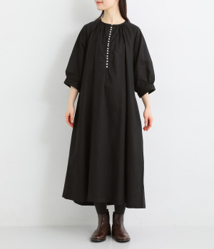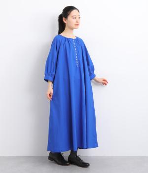 フロントに並んだたくさんのボタンが、シンプルなシルエットに表情を添えるワンピース。前後のネックまわりには細かなギャザーを施し、ふんわりとした立体感を生み出しています。五分丈のボリューム袖は気になる部分をさりげなくカバーし、レイヤードスタイルも映えるデザインです。
