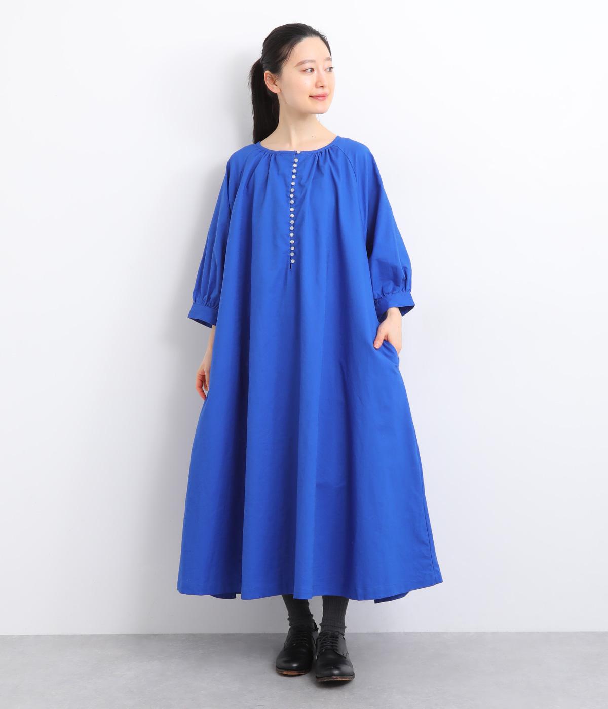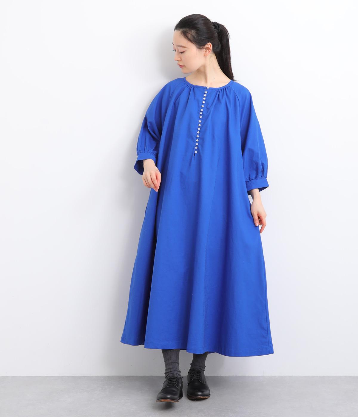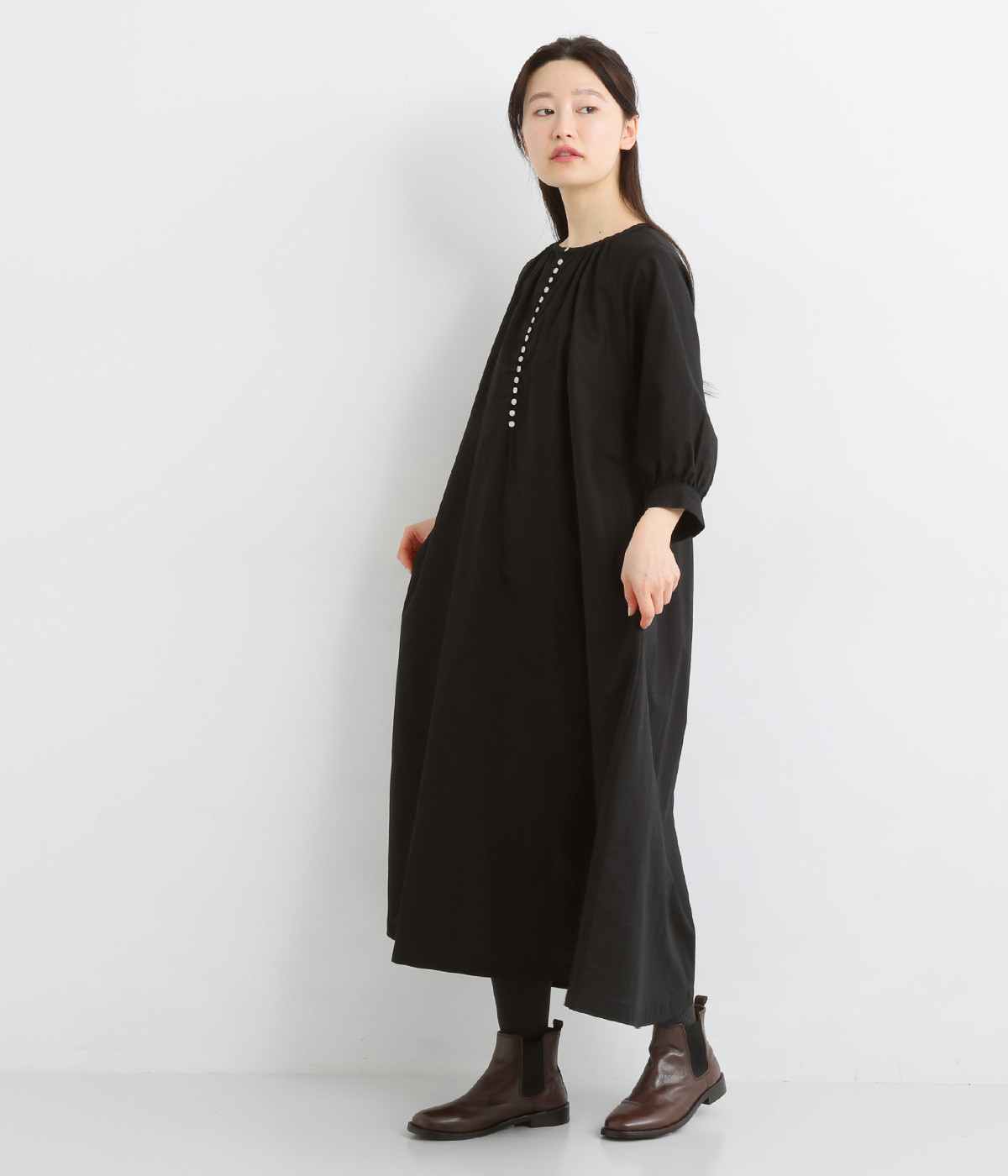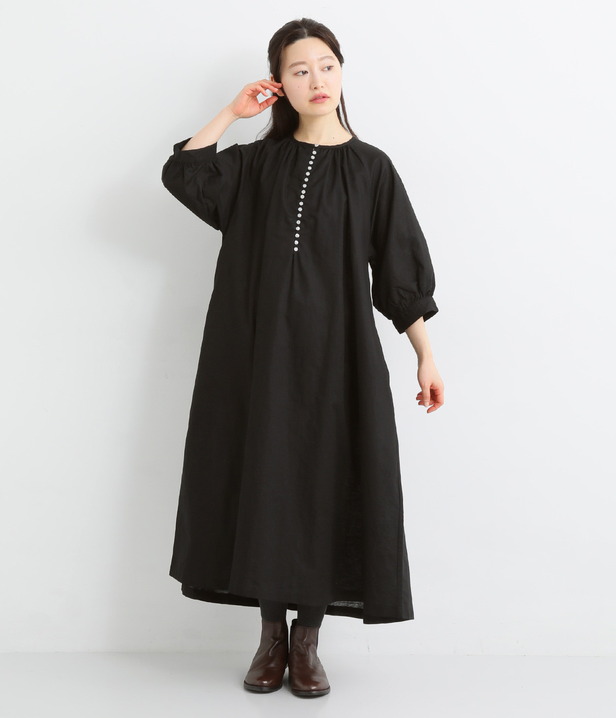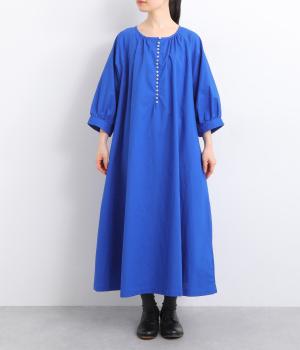 フロントに並んだたくさんのボタンが、シンプルなシルエットに表情を添えるワンピース。前後のネックまわりには細かなギャザーを施し、ふんわりとした立体感を生み出しています。五分丈のボリューム袖は気になる部分をさりげなくカバーし、レイヤードスタイルも映えるデザインです。