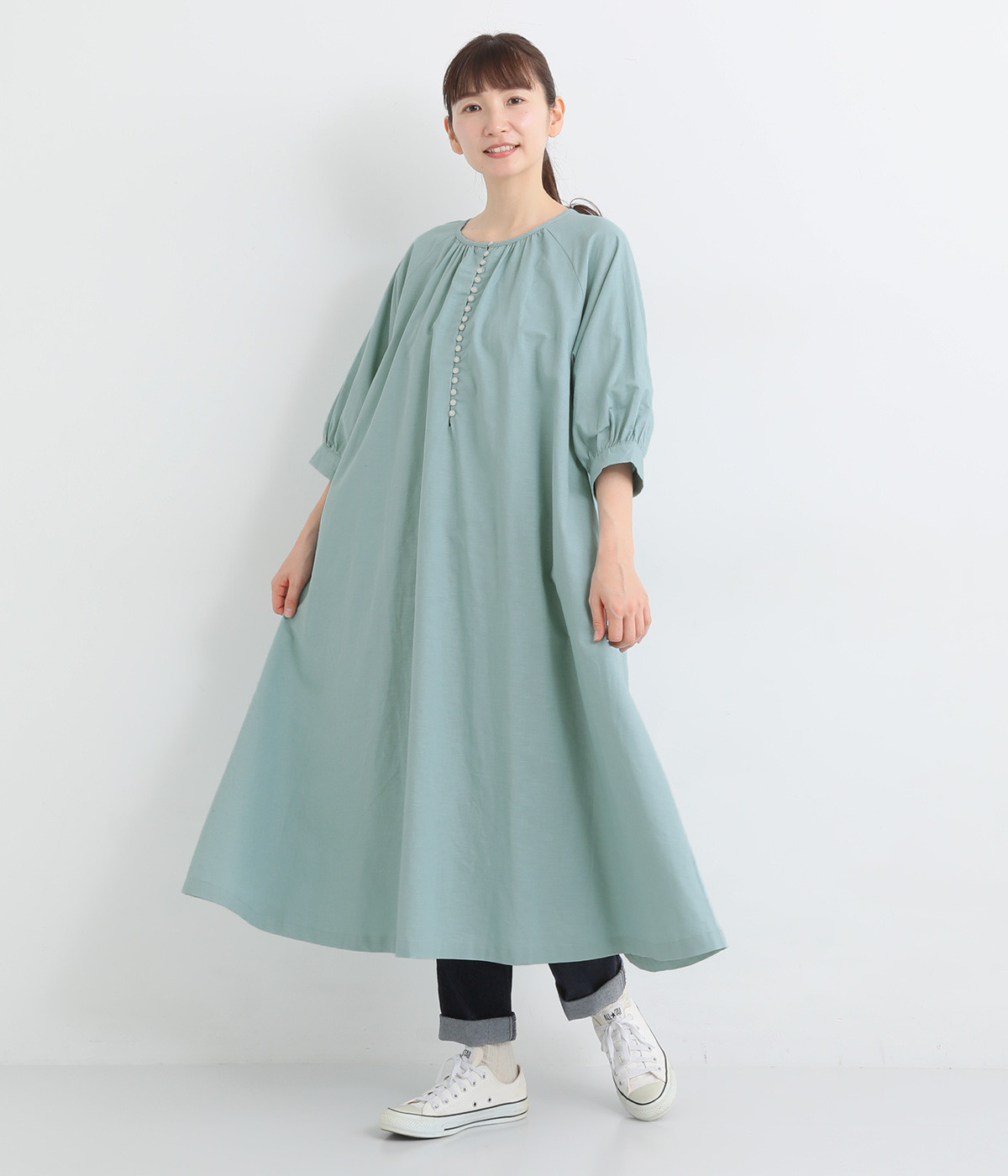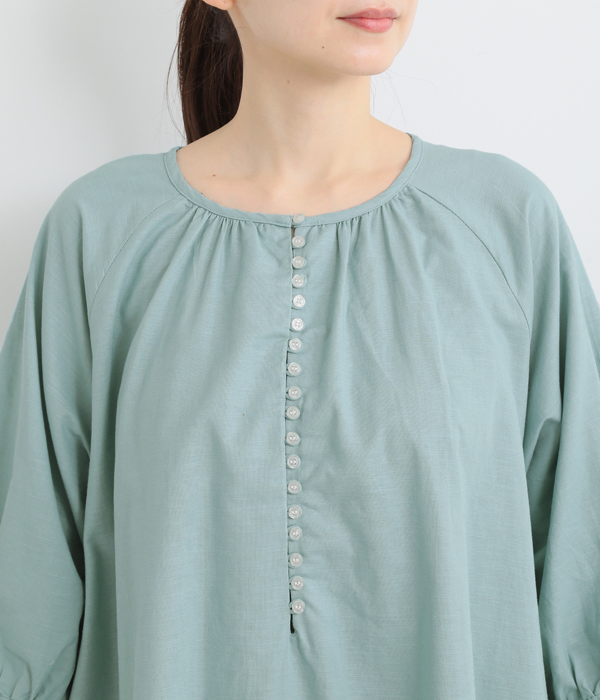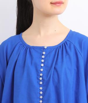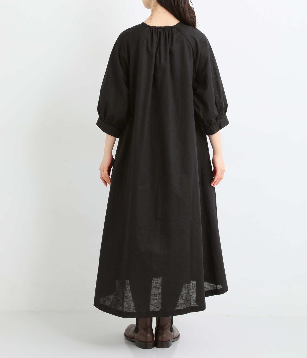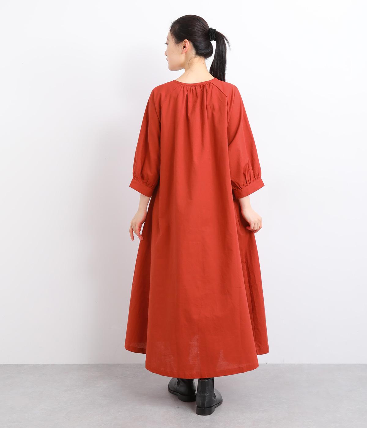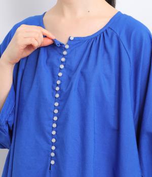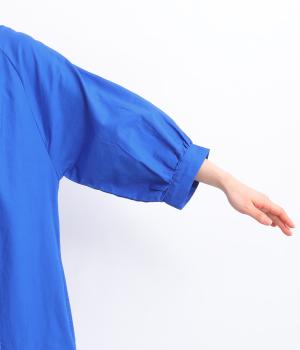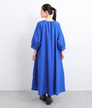 フロントに並んだたくさんのボタンが、シンプルなシルエットに表情を添えるワンピース。前後のネックまわりには細かなギャザーを施し、ふんわりとした立体感を生み出しています。五分丈のボリューム袖は気になる部分をさりげなくカバーし、レイヤードスタイルも映えるデザインです。
