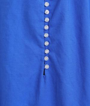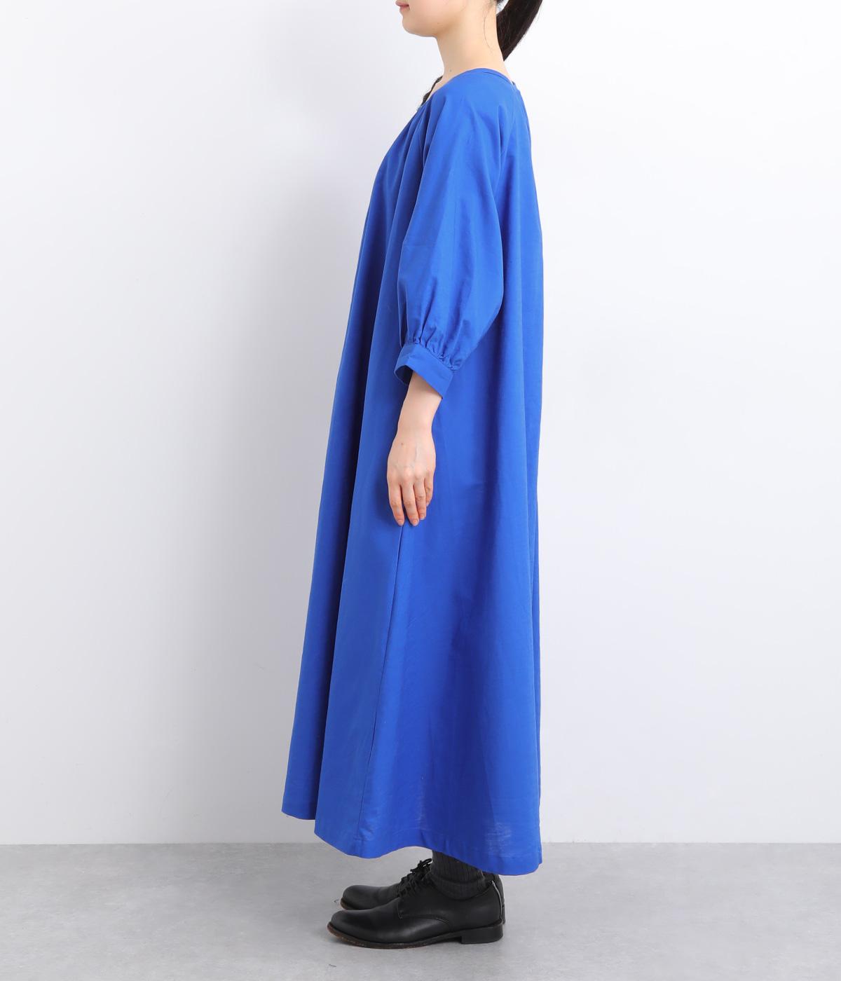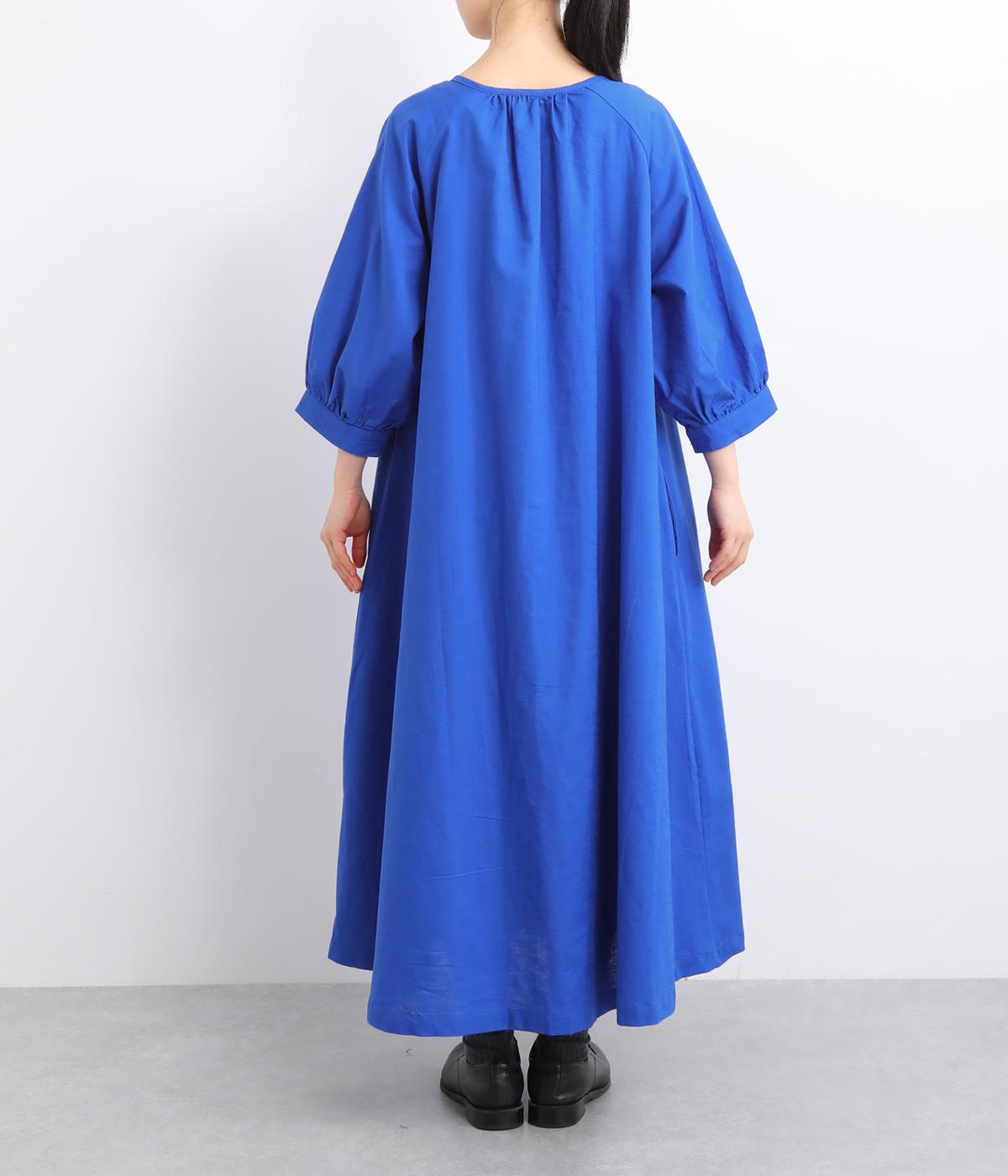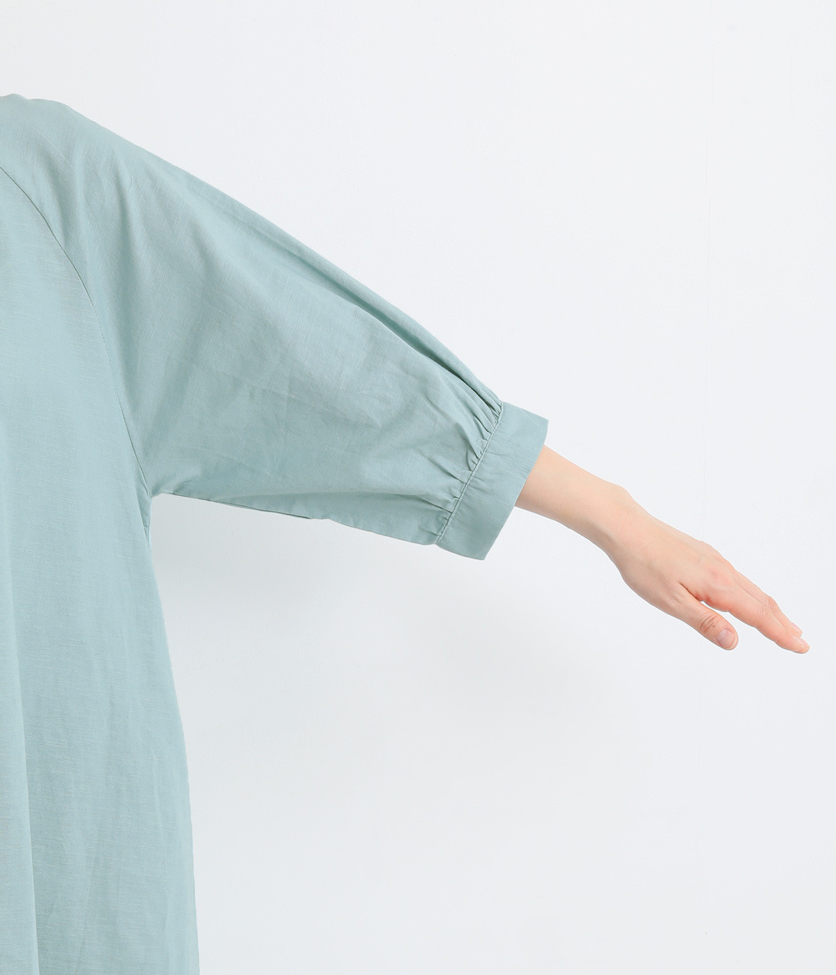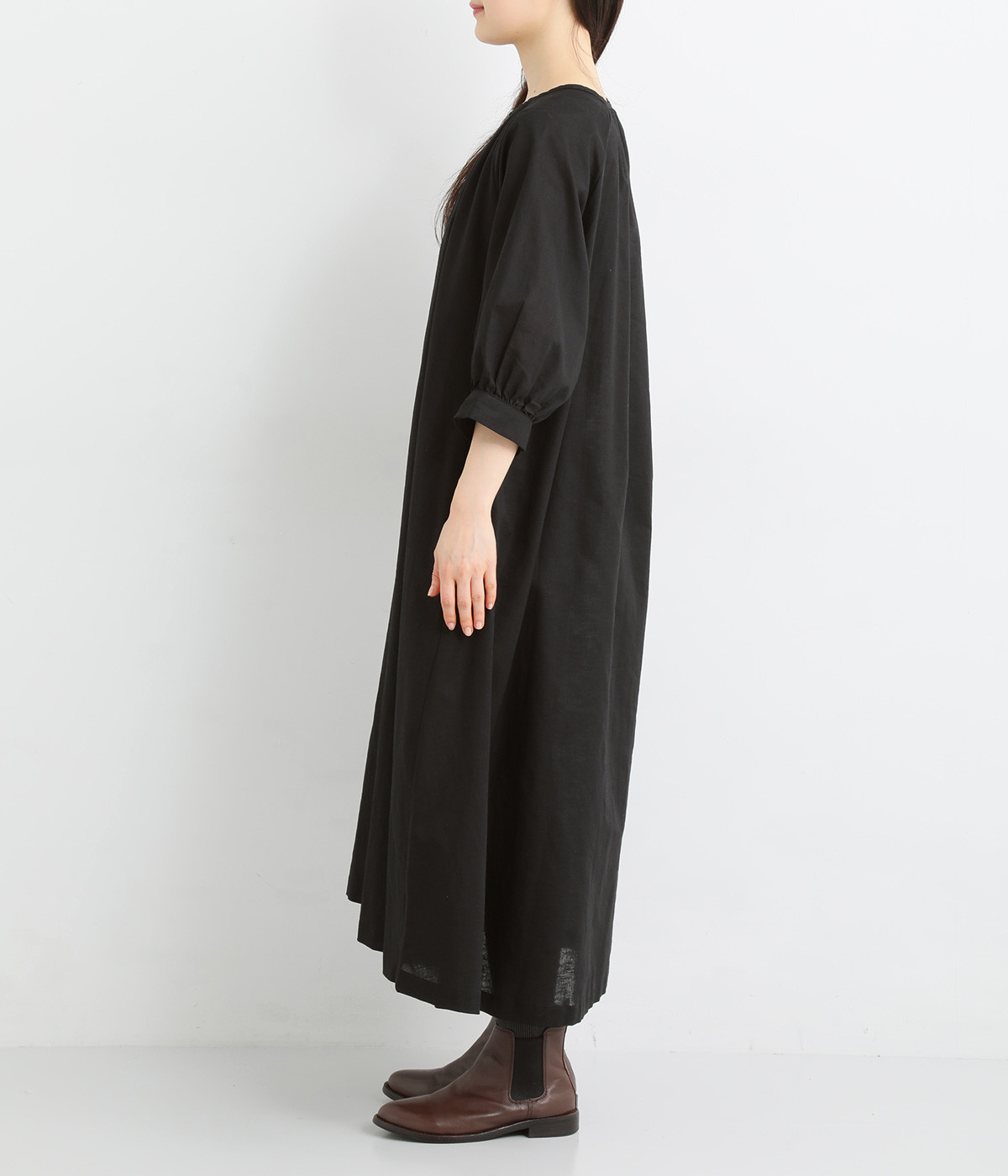 フロントに並んだたくさんのボタンが、シンプルなシルエットに表情を添えるワンピース。前後のネックまわりには細かなギャザーを施し、ふんわりとした立体感を生み出しています。五分丈のボリューム袖は気になる部分をさりげなくカバーし、レイヤードスタイルも映えるデザインです。