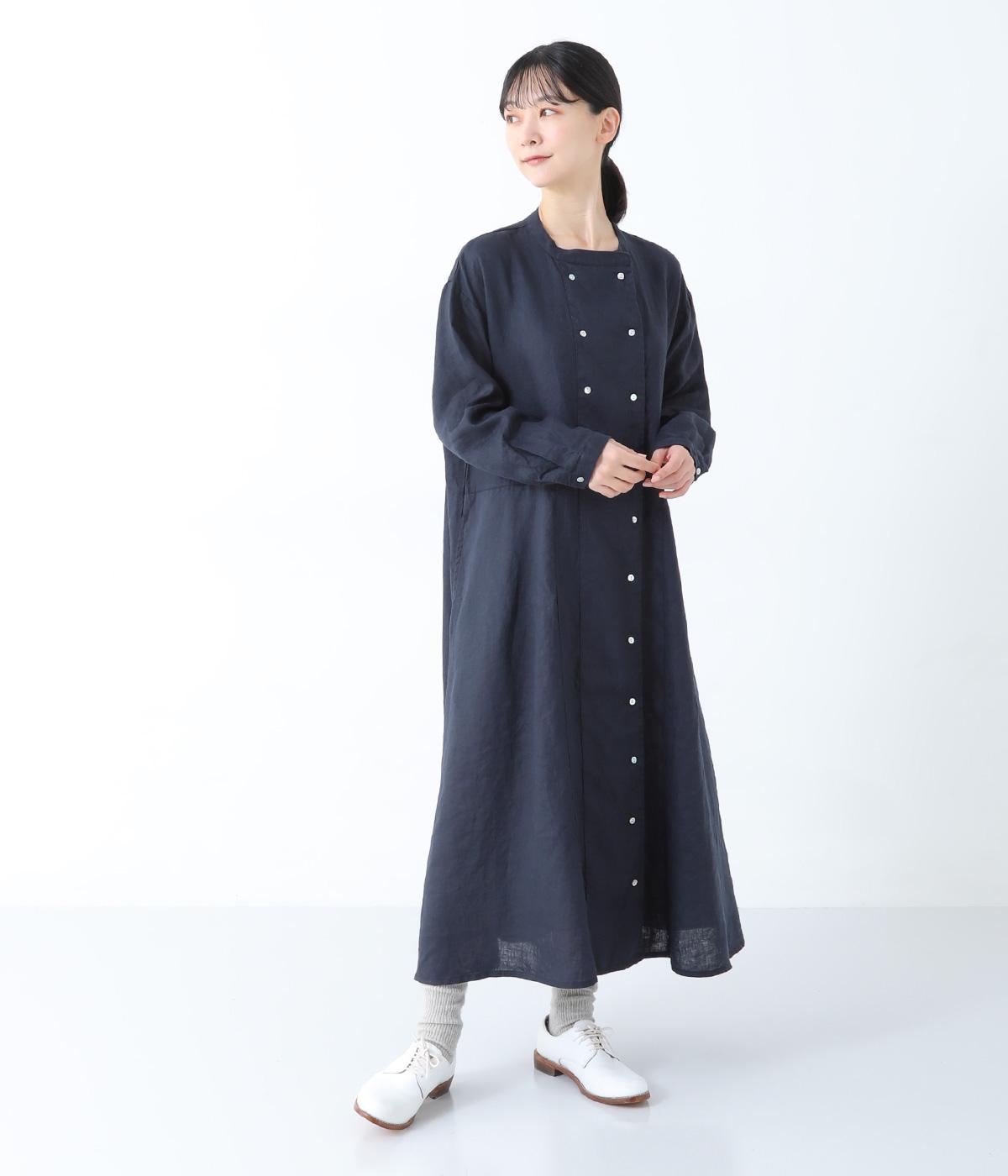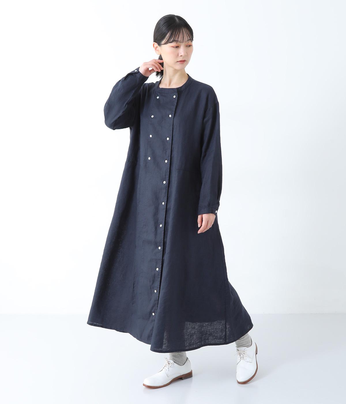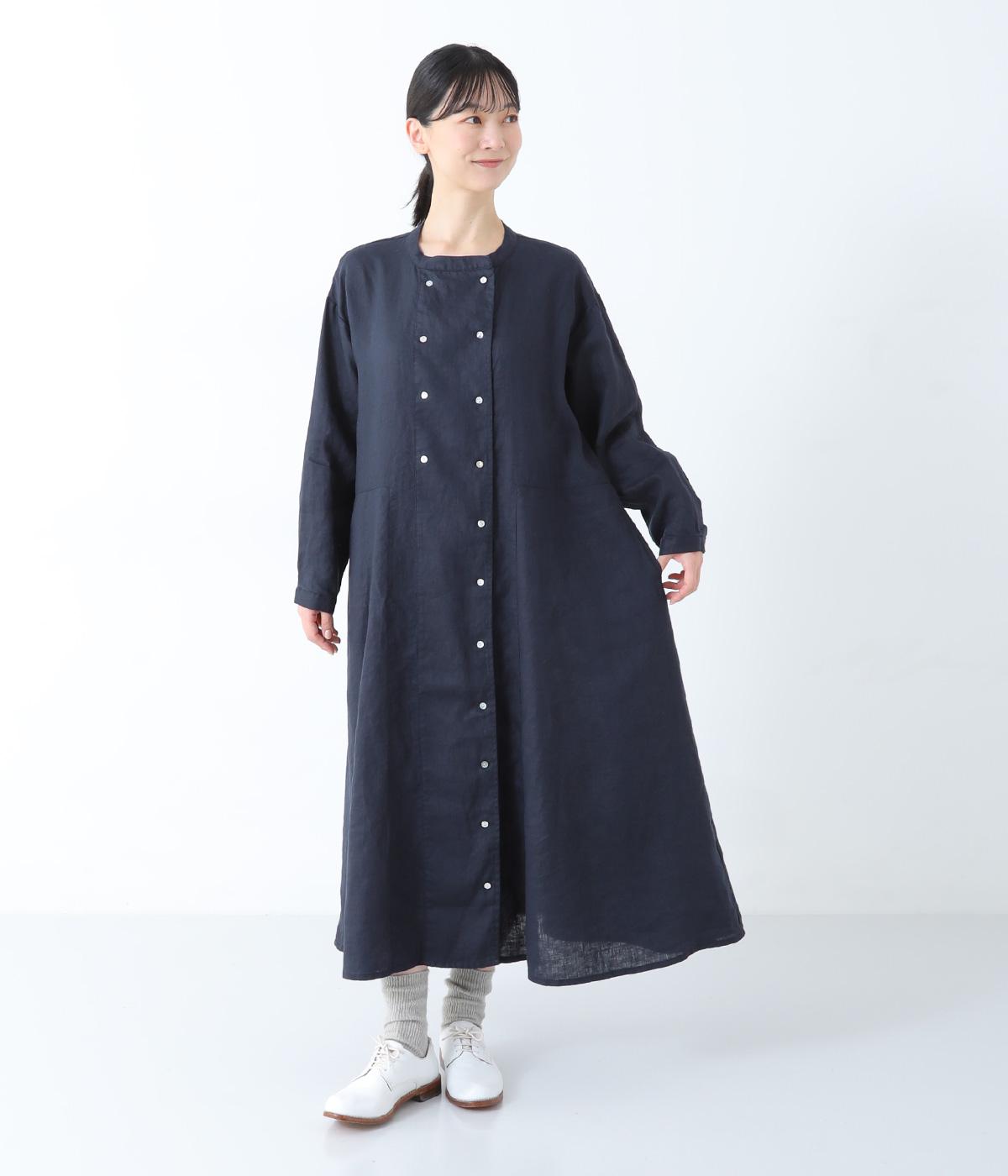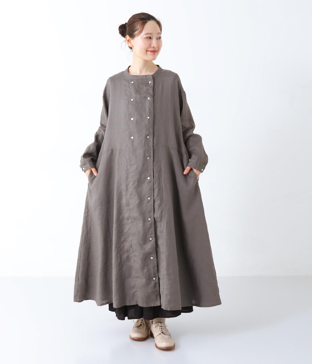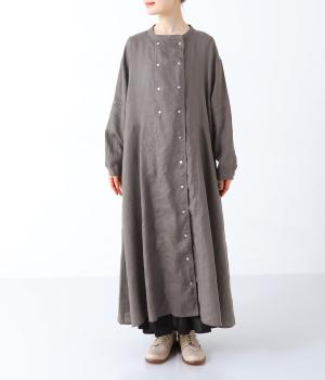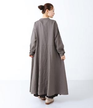 きちんと感と洒落感を演出するダブルボタン仕立てのワンピース。動きに合わせてドレープが揺れる、優雅なフレアシルエットに仕上げました。両サイドには便利なポケットつき。前を開けてロングアウターのように着こなすのも素敵です。