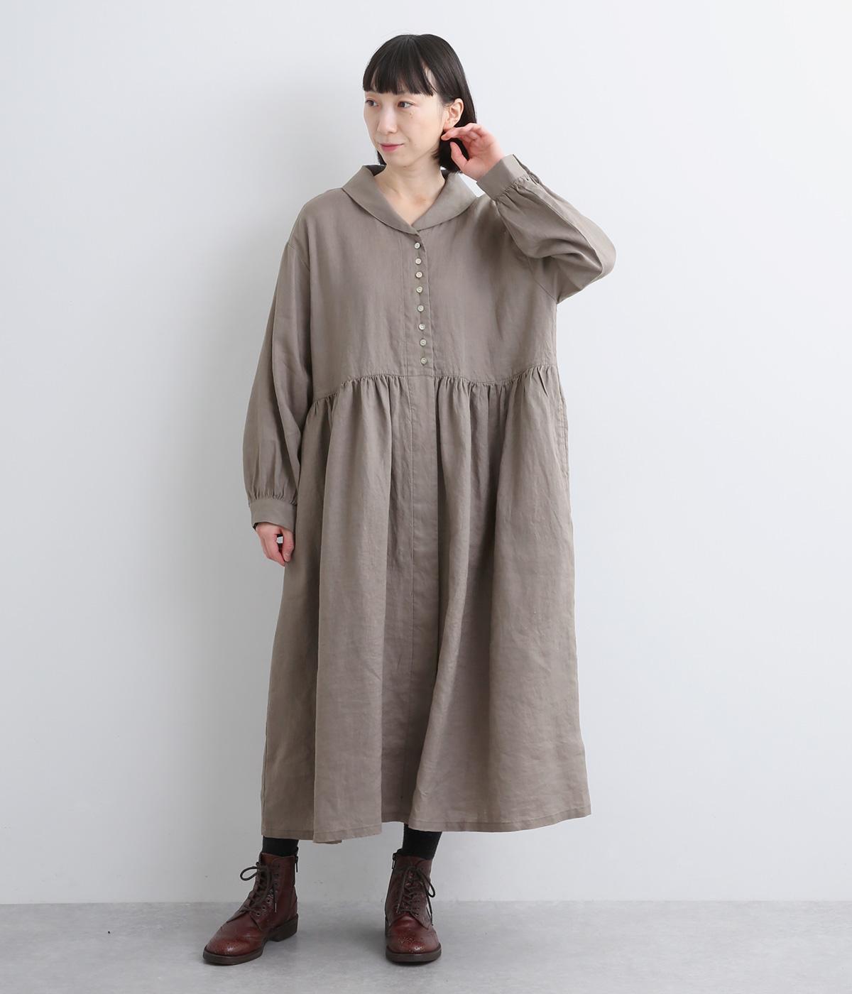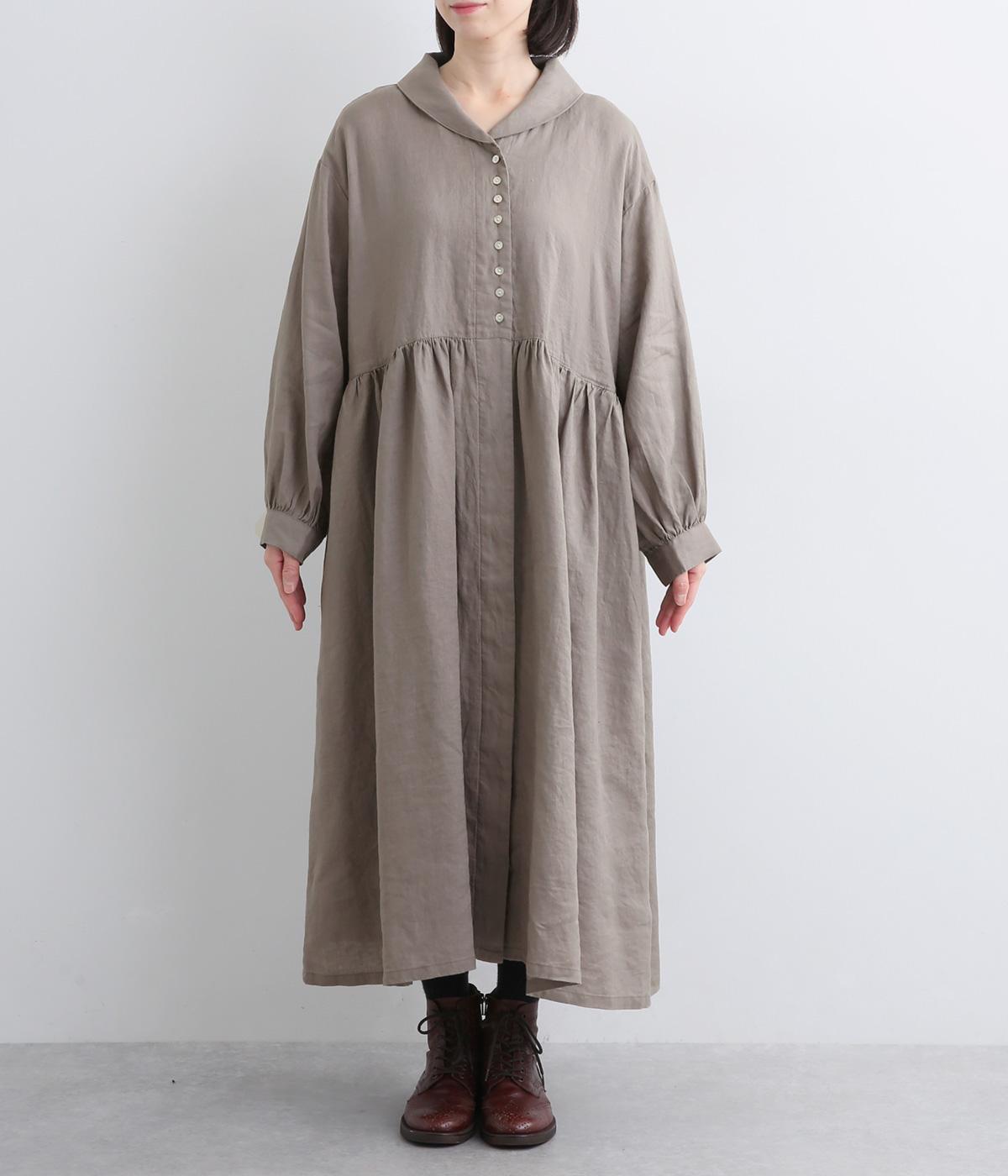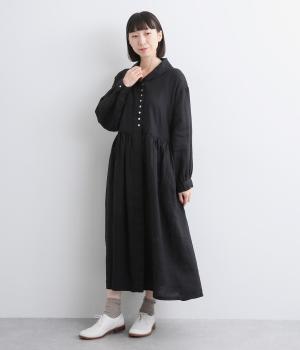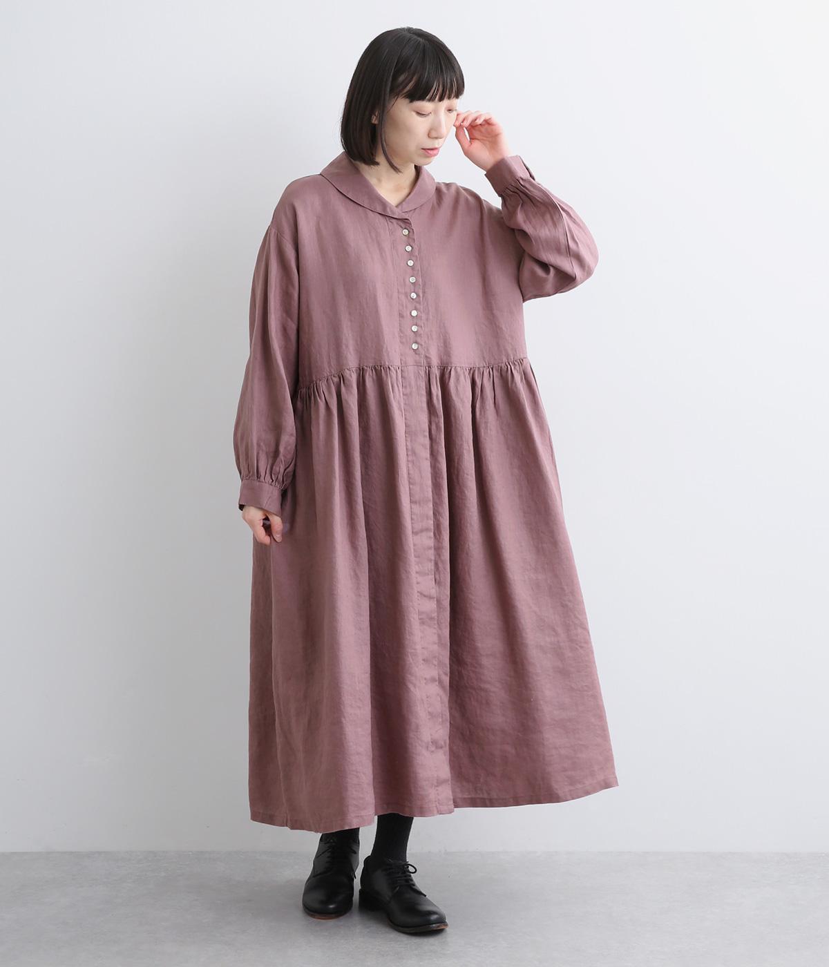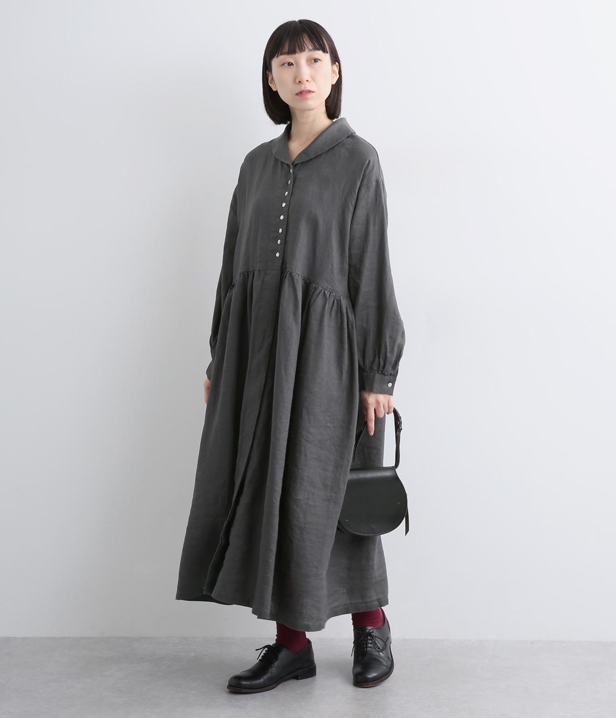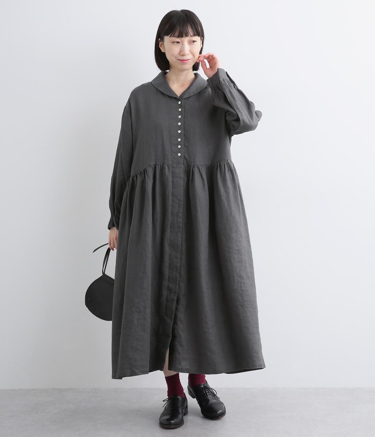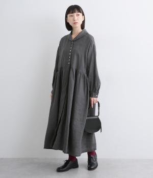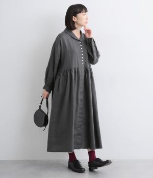 ラウンド襟が大人かわいい印象を与えるワンピースです。上半分は光沢のあるシェル素材の多ボタンをあしらい、スカート部分は比翼仕立てですっきりと仕立てました。切り替えのたっぷりギャザーがアクセントになり、スタイリングに動きを添えます。