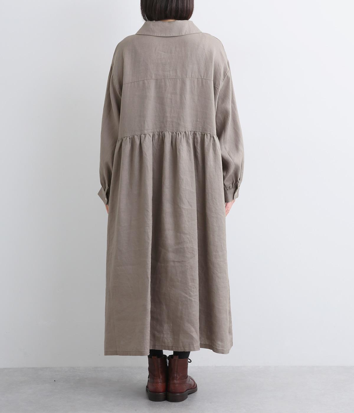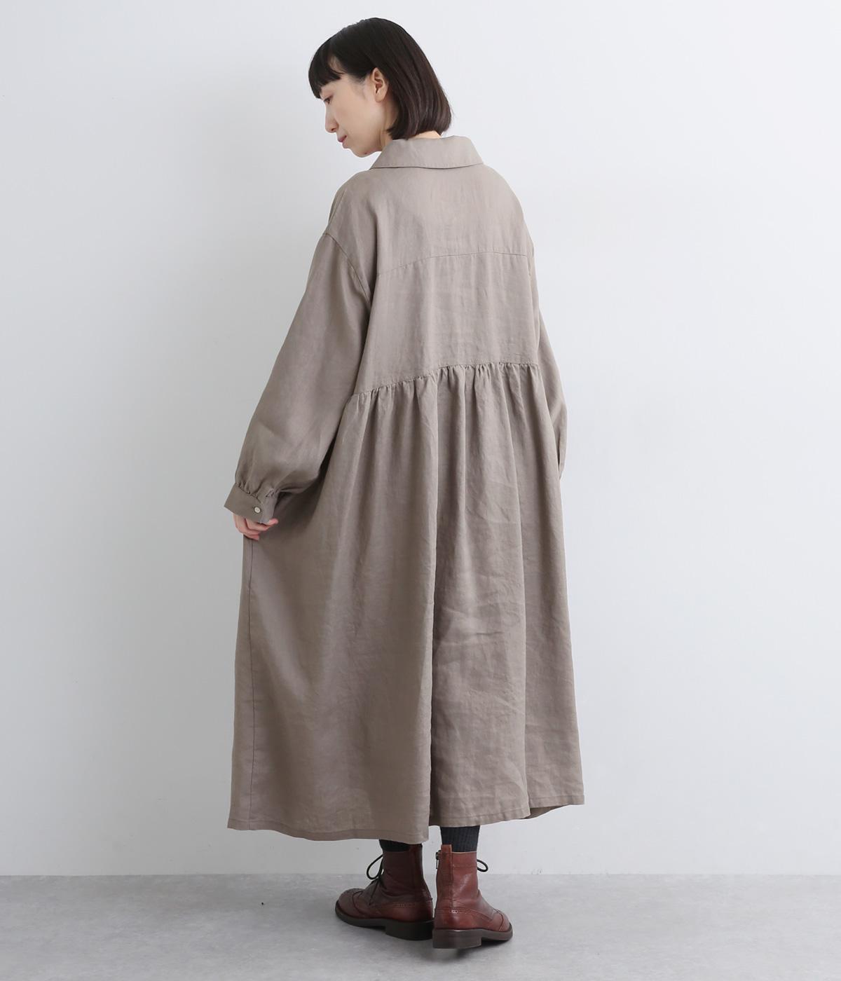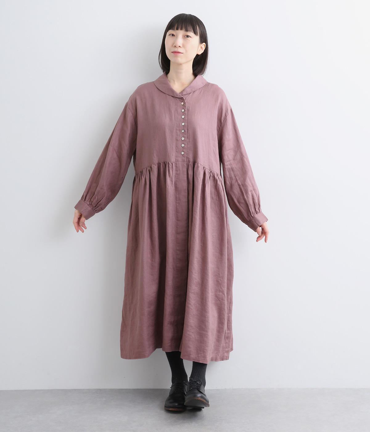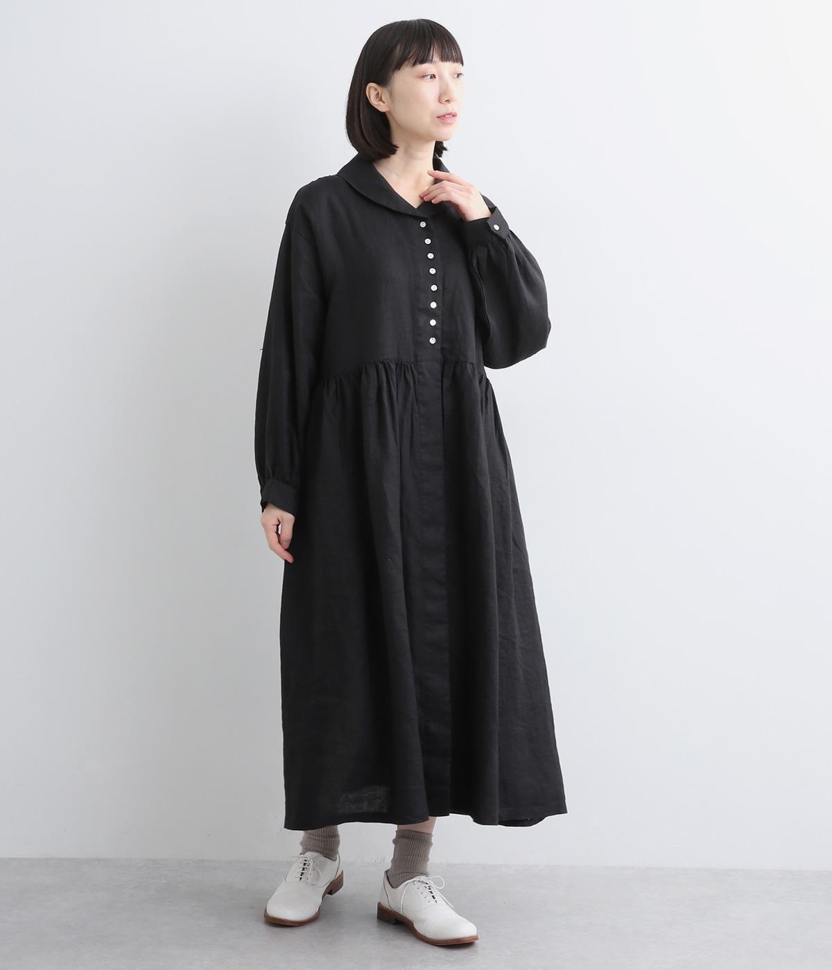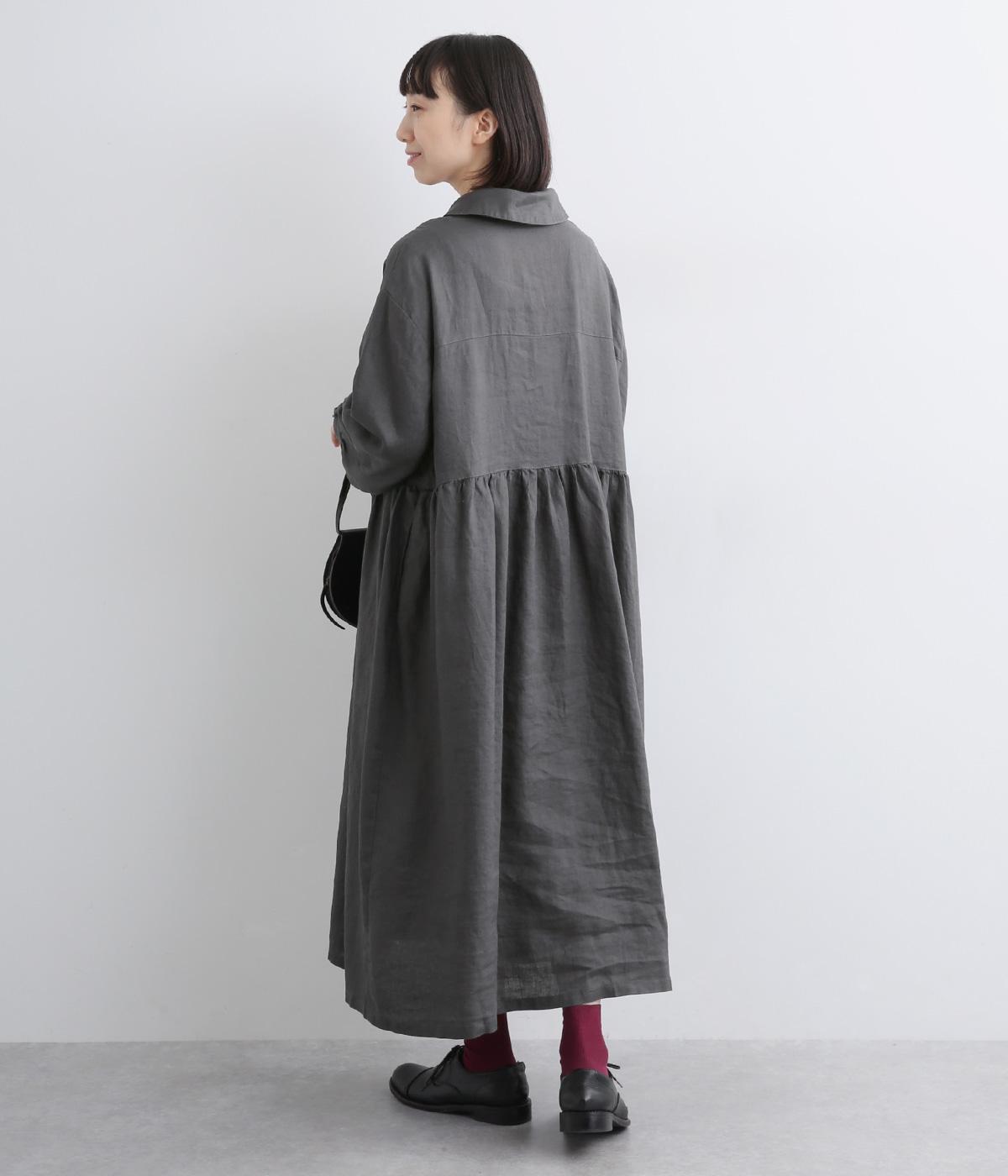 ラウンド襟が大人かわいい印象を与えるワンピースです。上半分は光沢のあるシェル素材の多ボタンをあしらい、スカート部分は比翼仕立てですっきりと仕立てました。切り替えのたっぷりギャザーがアクセントになり、スタイリングに動きを添えます。