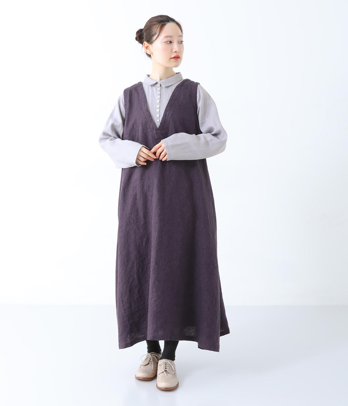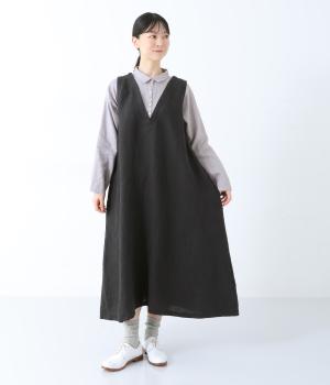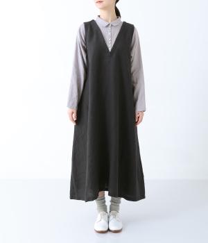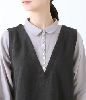 シャツにワンピースを重ねたようなスタイルがさっと一枚で完成する技ありデザイン。Aラインにきれいに広がるシルエットが女性らしいムードを漂わせます。深めのVネックから覗くたくさんのボタンがアクセントに。きちんと感を添える小さめの襟もポイントです。
