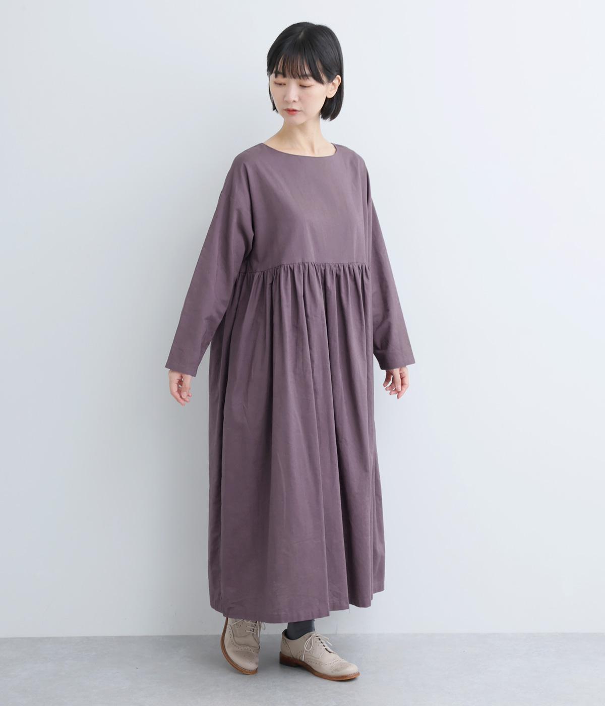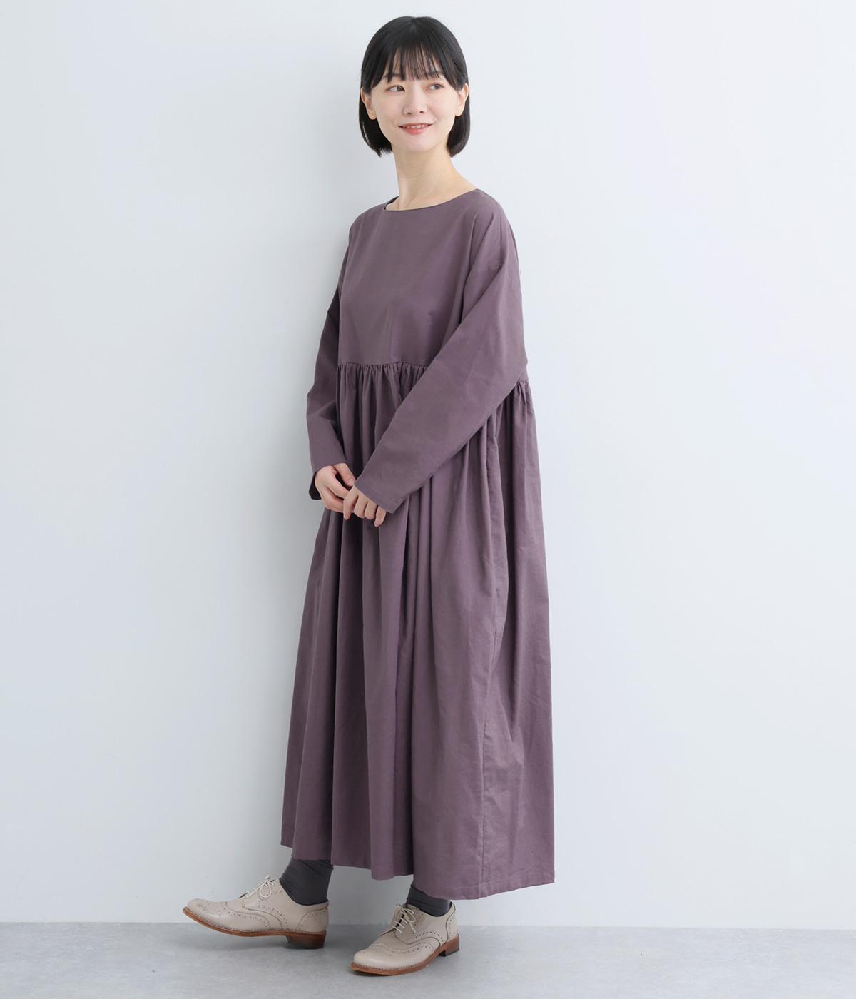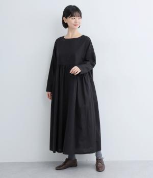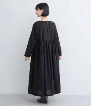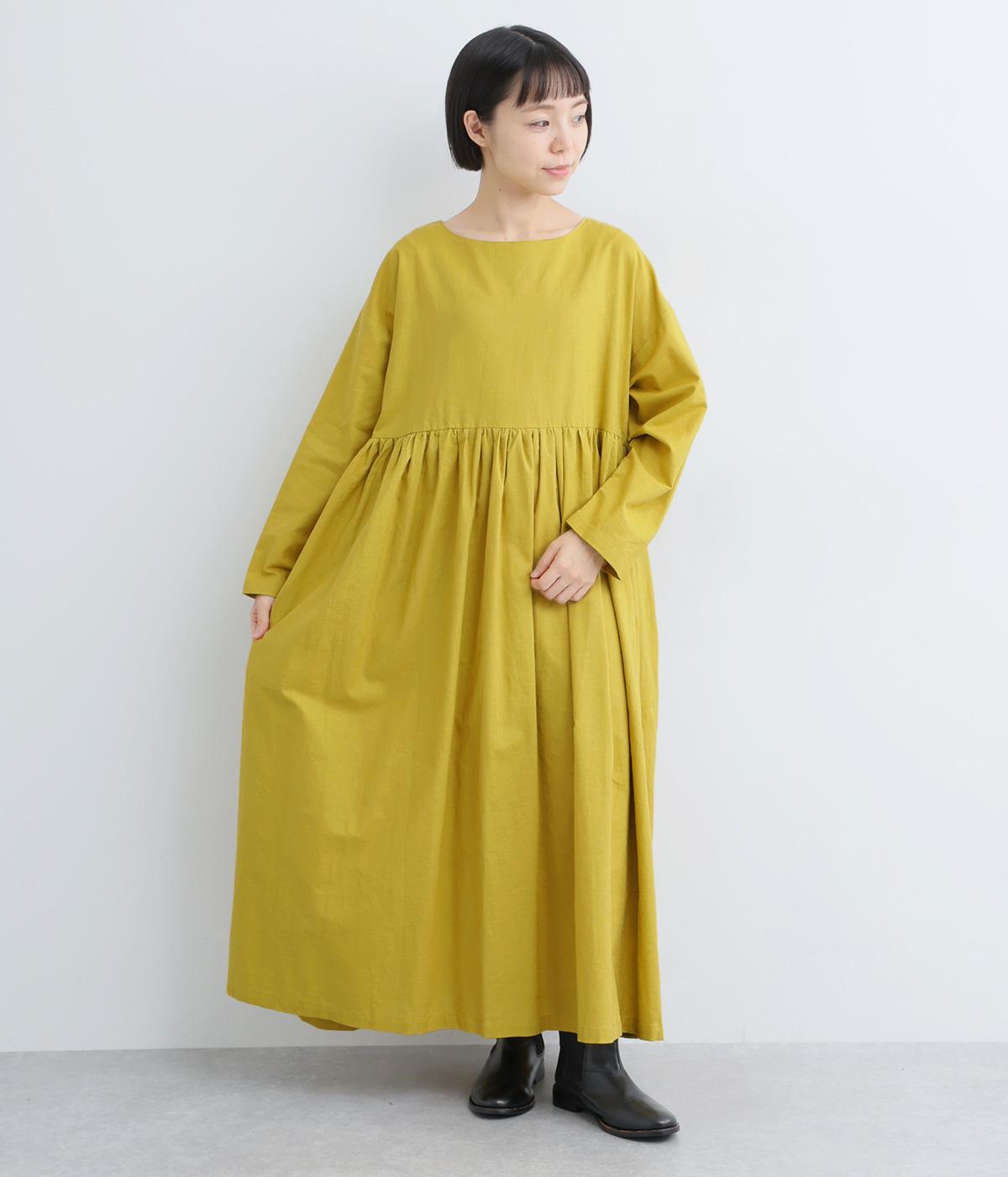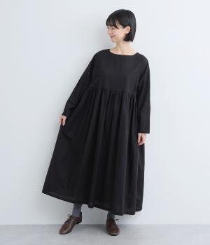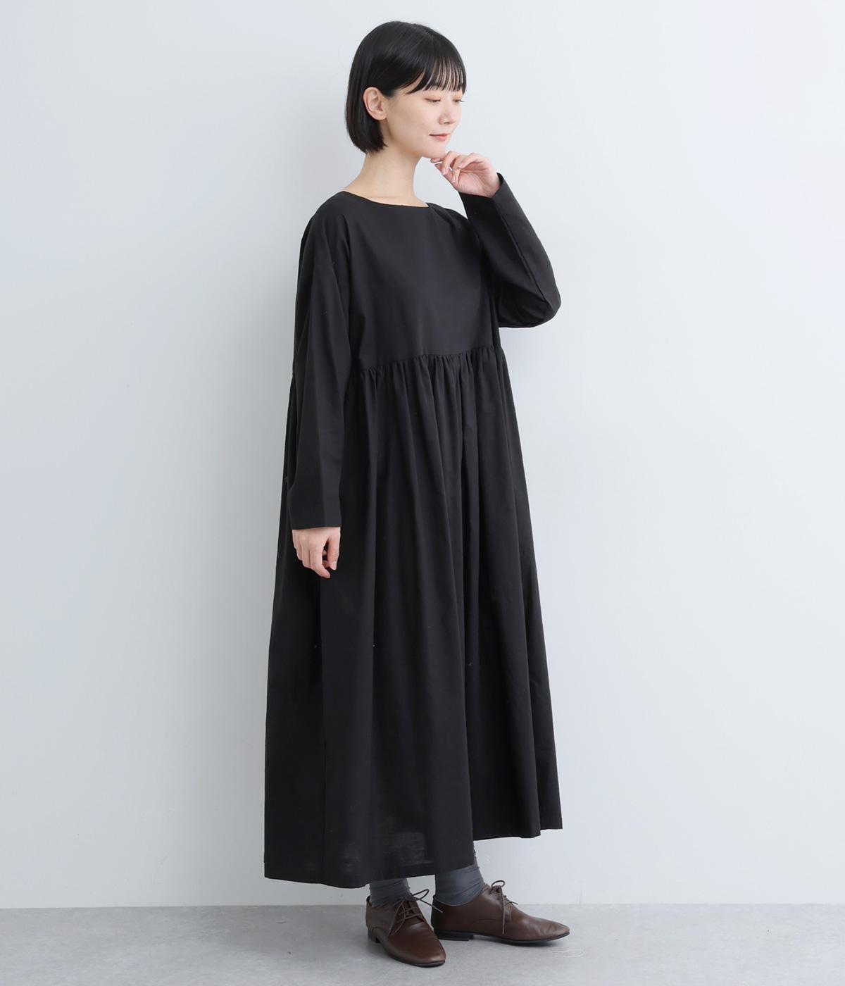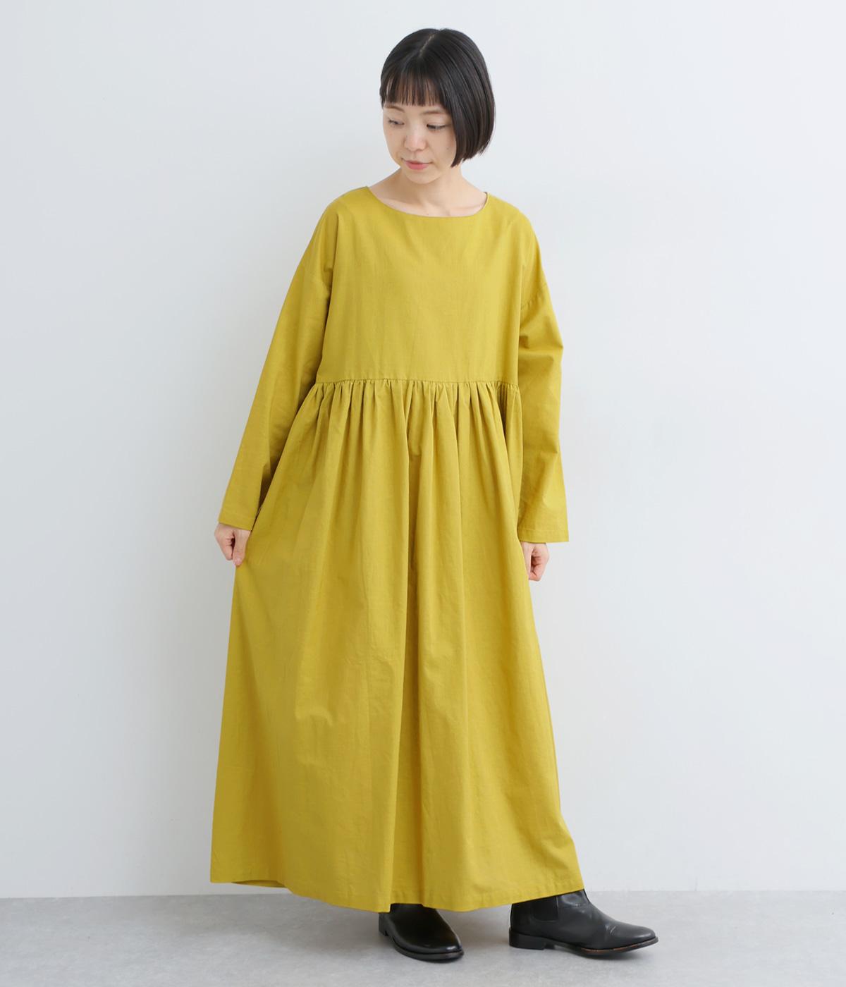 腰まわりのギャザーで立体感をプラスしたワンピース。シンプルなシルエットは着方次第でエレガントにもカジュアルにもなり、さまざまな表情を楽しめます。身幅はゆとりのあるマキシ丈。ワードローブに一枚あると重宝します。