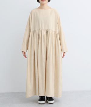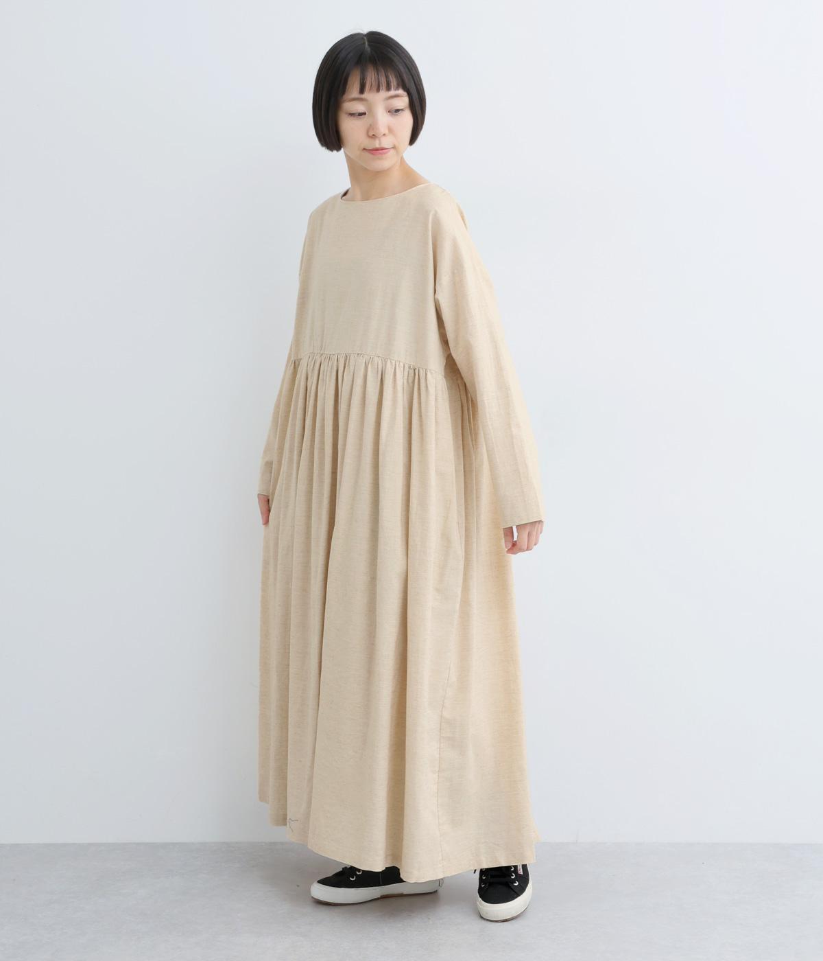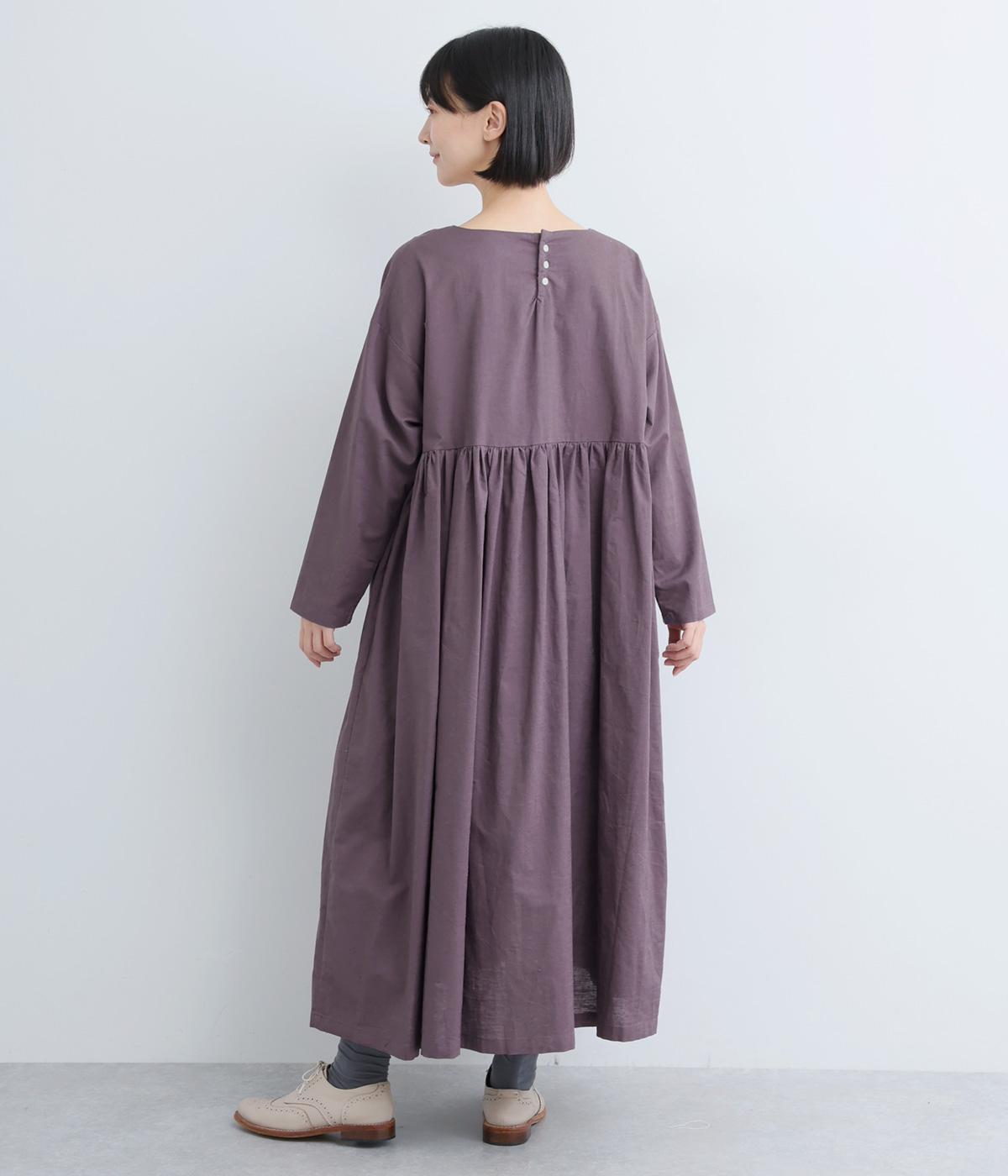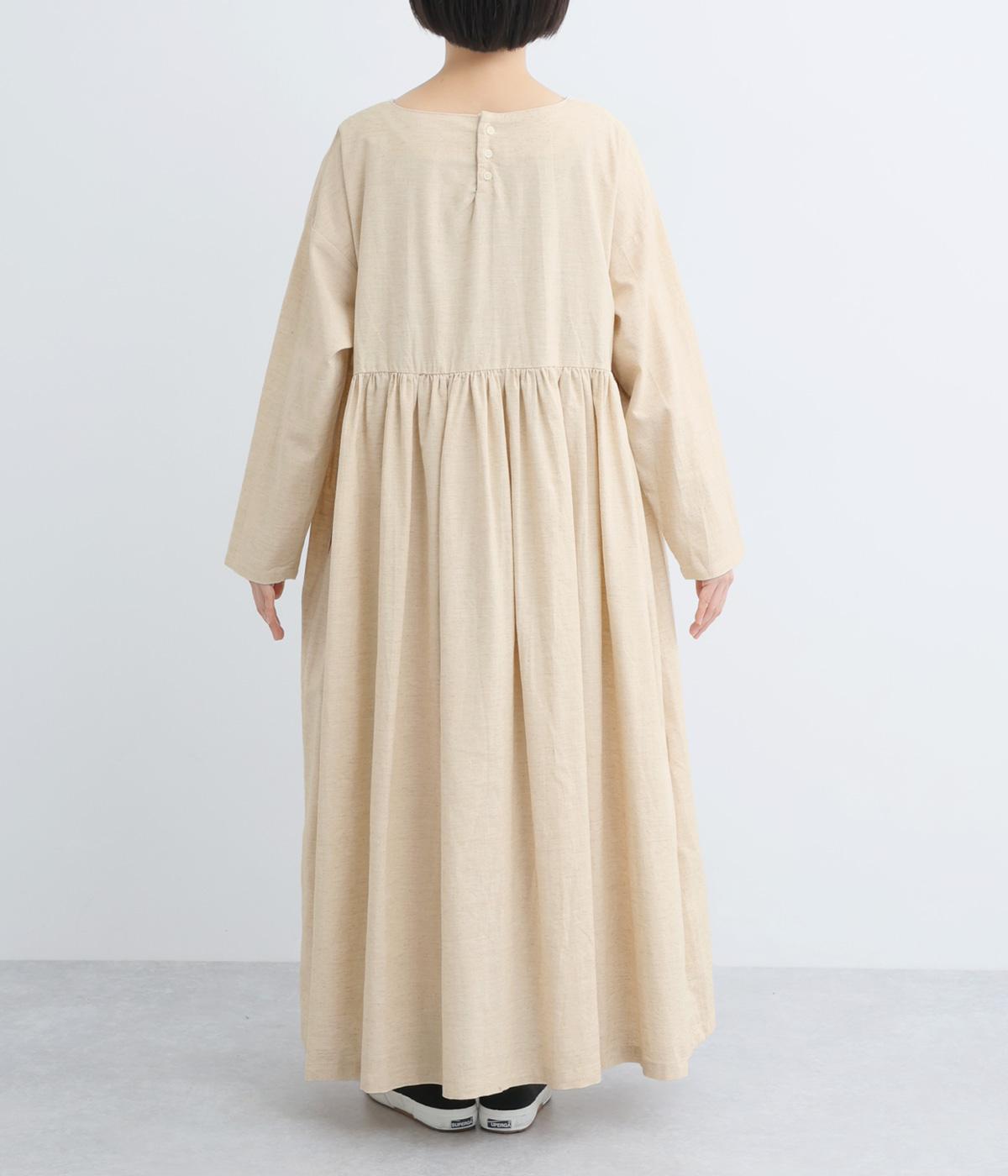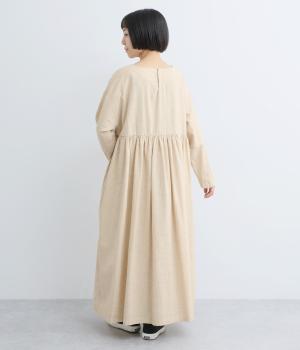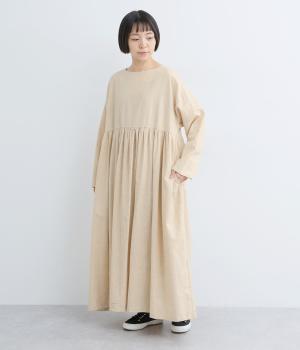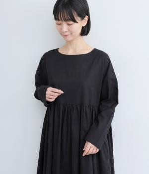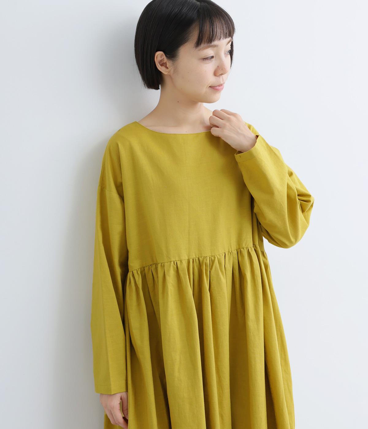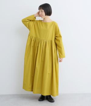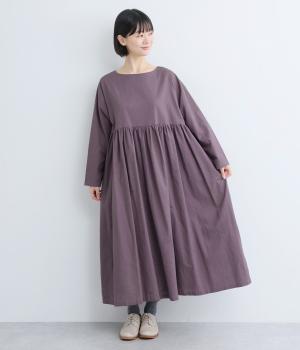 腰まわりのギャザーで立体感をプラスしたワンピース。シンプルなシルエットは着方次第でエレガントにもカジュアルにもなり、さまざまな表情を楽しめます。身幅はゆとりのあるマキシ丈。ワードローブに一枚あると重宝します。