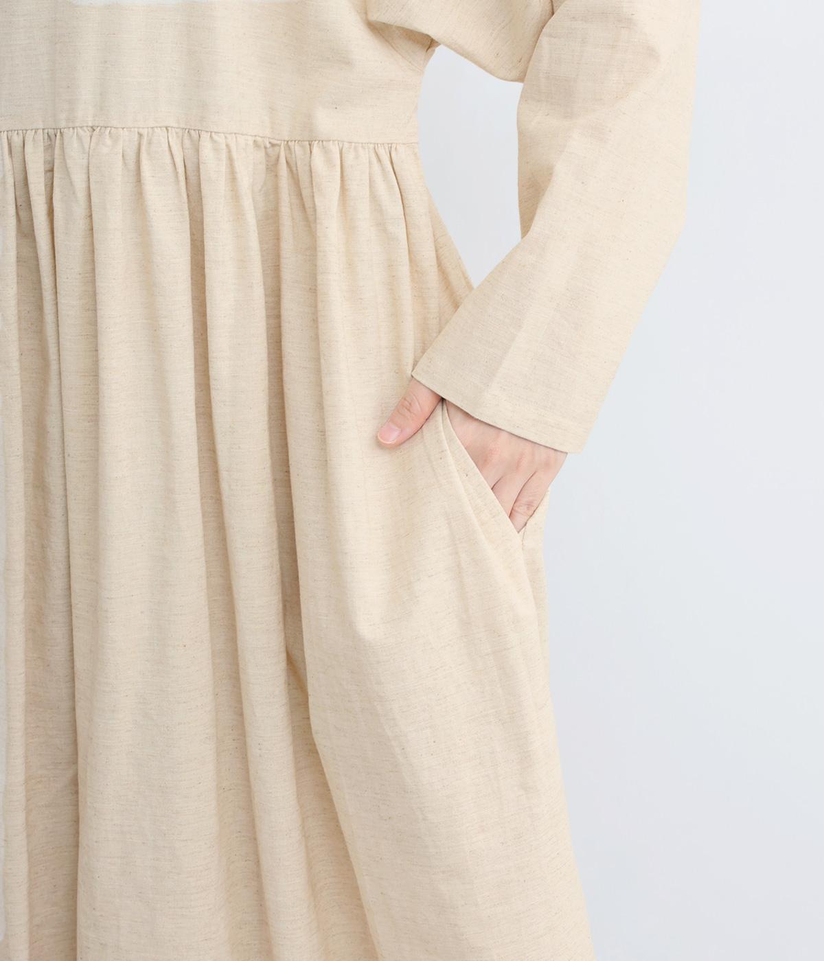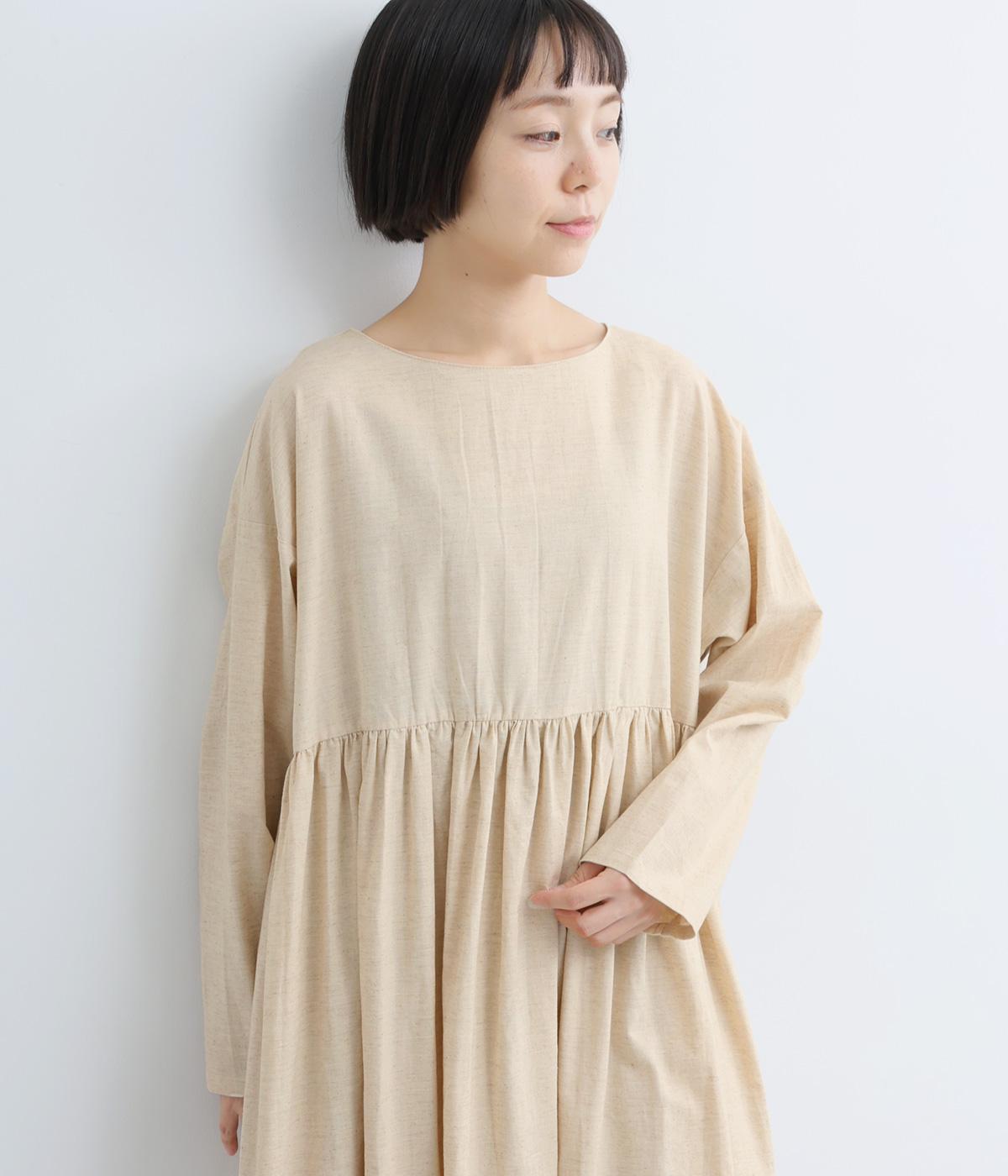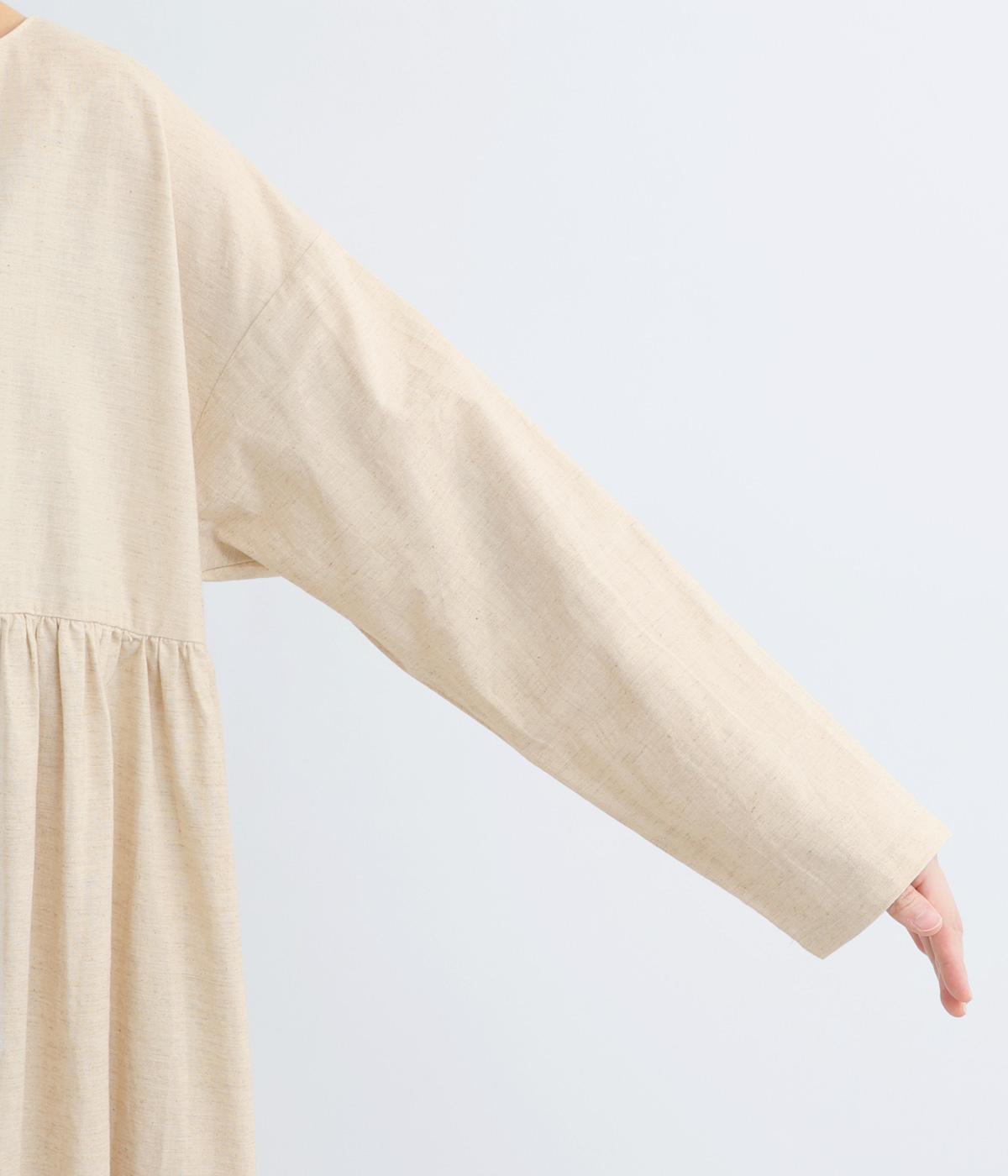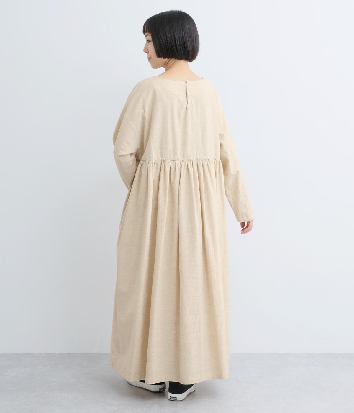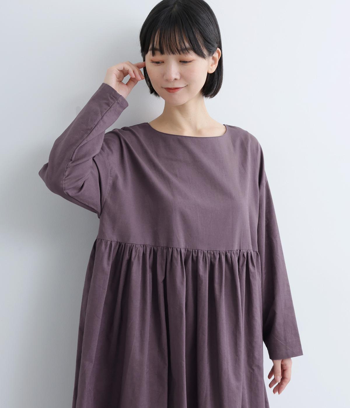腰まわりのギャザーで立体感をプラスしたワンピース。シンプルなシルエットは着方次第でエレガントにもカジュアルにもなり、さまざまな表情を楽しめます。身幅はゆとりのあるマキシ丈。ワードローブに一枚あると重宝します。