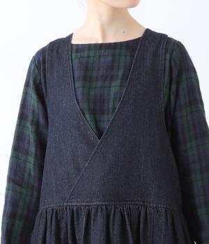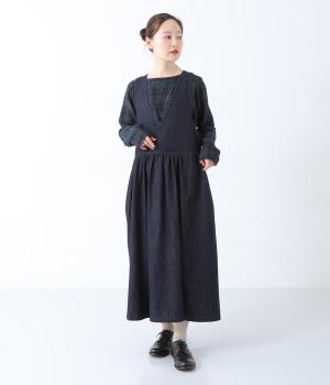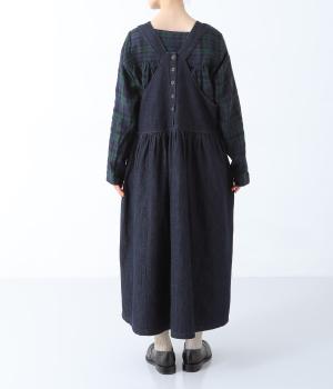 合わせるインナー次第で着こなしに変化をつけられるジャンパースカート。カシュクールのように前を重ねたデザインで子どもっぽさをおさえています。後ろにはボタンを並べてカジュアルなアクセントに。ウエストギャザーでボリュームを出し、体のラインを拾いにくいのも◎です。