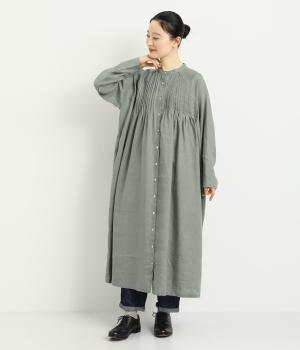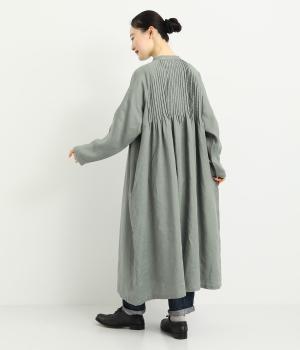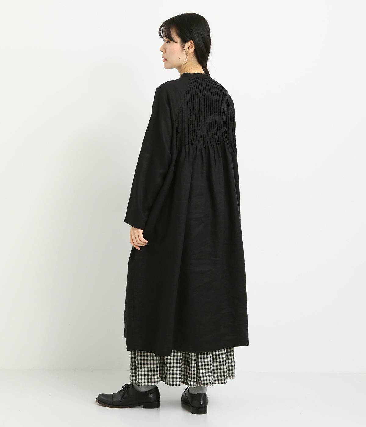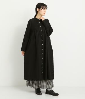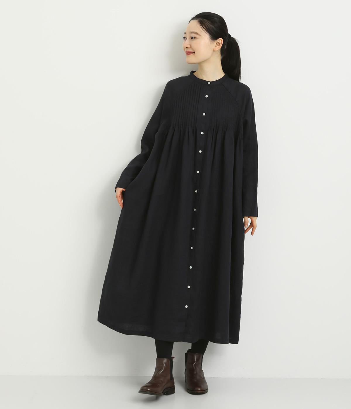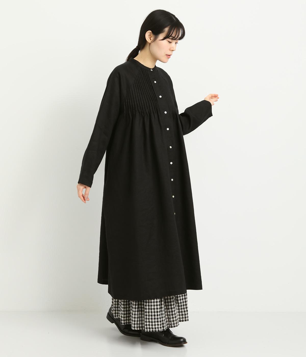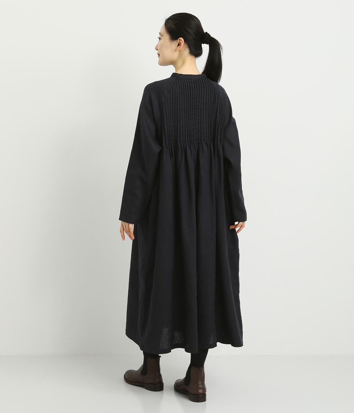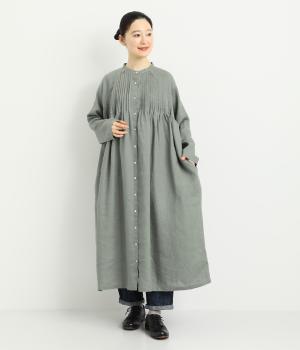 前後にたっぷりほどこしたピンタックがナチュラルながらも着映えするワンピース。そのまま切るだけでもスタイリングが完成するボリュームがあり、前あきなので羽織りとしても活躍。ラグラン袖で着心地もいい、デイリーに着たくなる一枚。