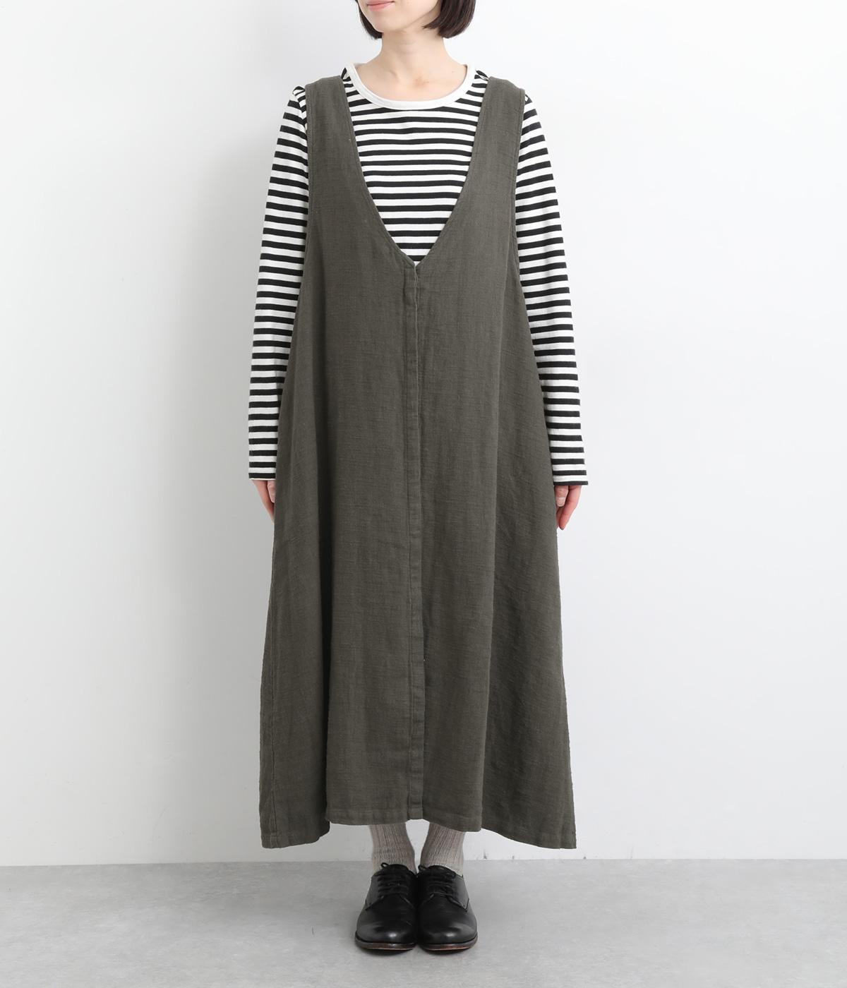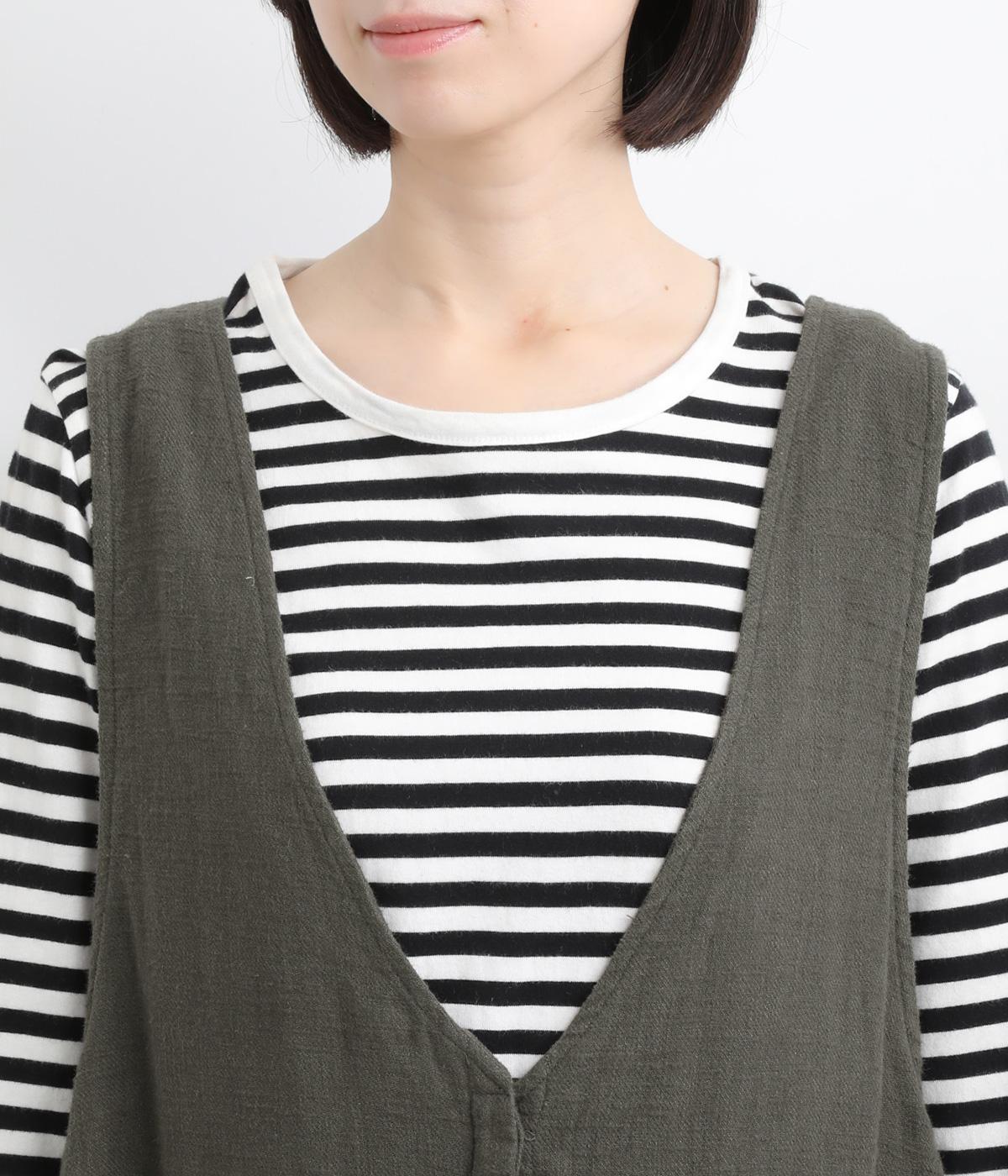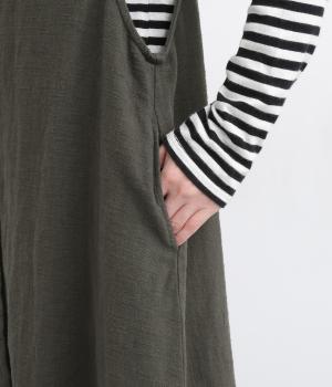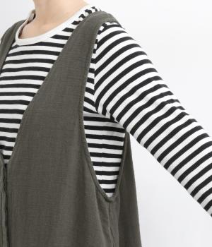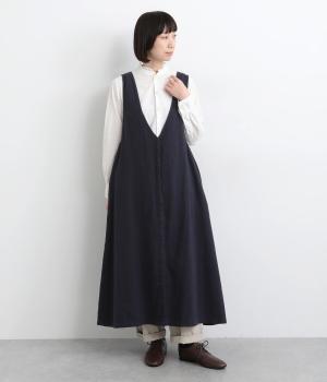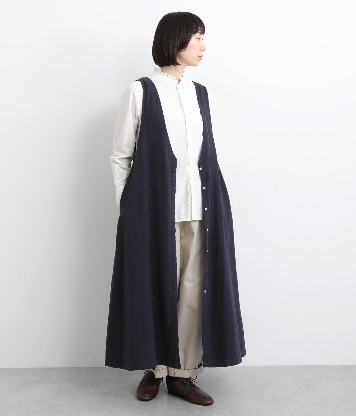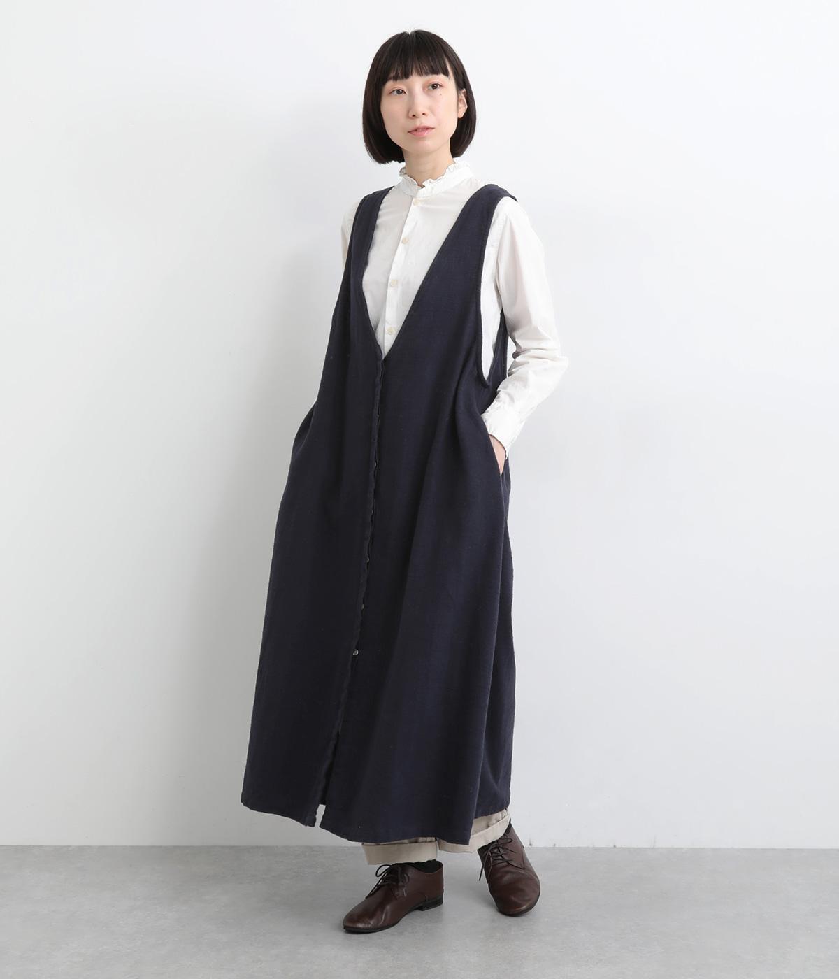ナチュラルな雰囲気にきちんと感をプラスする、比翼仕立ての前あきがポイント。深めのVネックはほどよい抜け感があり、ゆとりのあるアームホールで、さまざまなインナーとも相性ばつぐんです。ふわりと広がるシルエットが、女性らしさを演出。前をあけてジレ風に着こなすのもおすすめです。