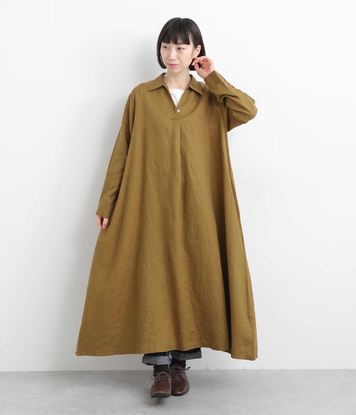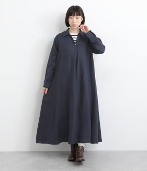 首元をすっきり見せるスキッパーネックに、ツヤやかな貝ボタンをひとつ添えた、ひかえめなアクセントが上品なワンピースです。ゆるやかに広がるAラインが体をつつみ込み、女性らしい落ち感を演出します。シンプルなデザインなので、インナーとの重ね着で幅広いコーディネートがたのしめる一着です。