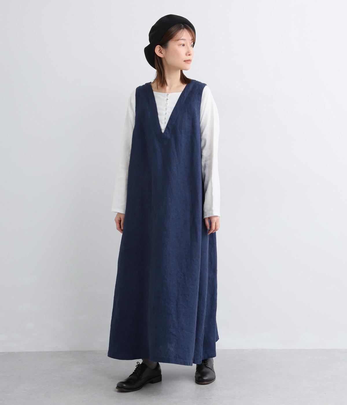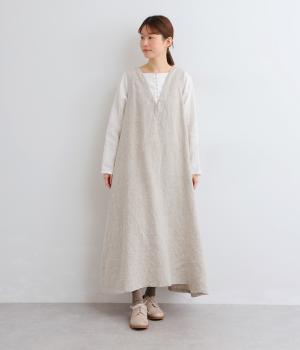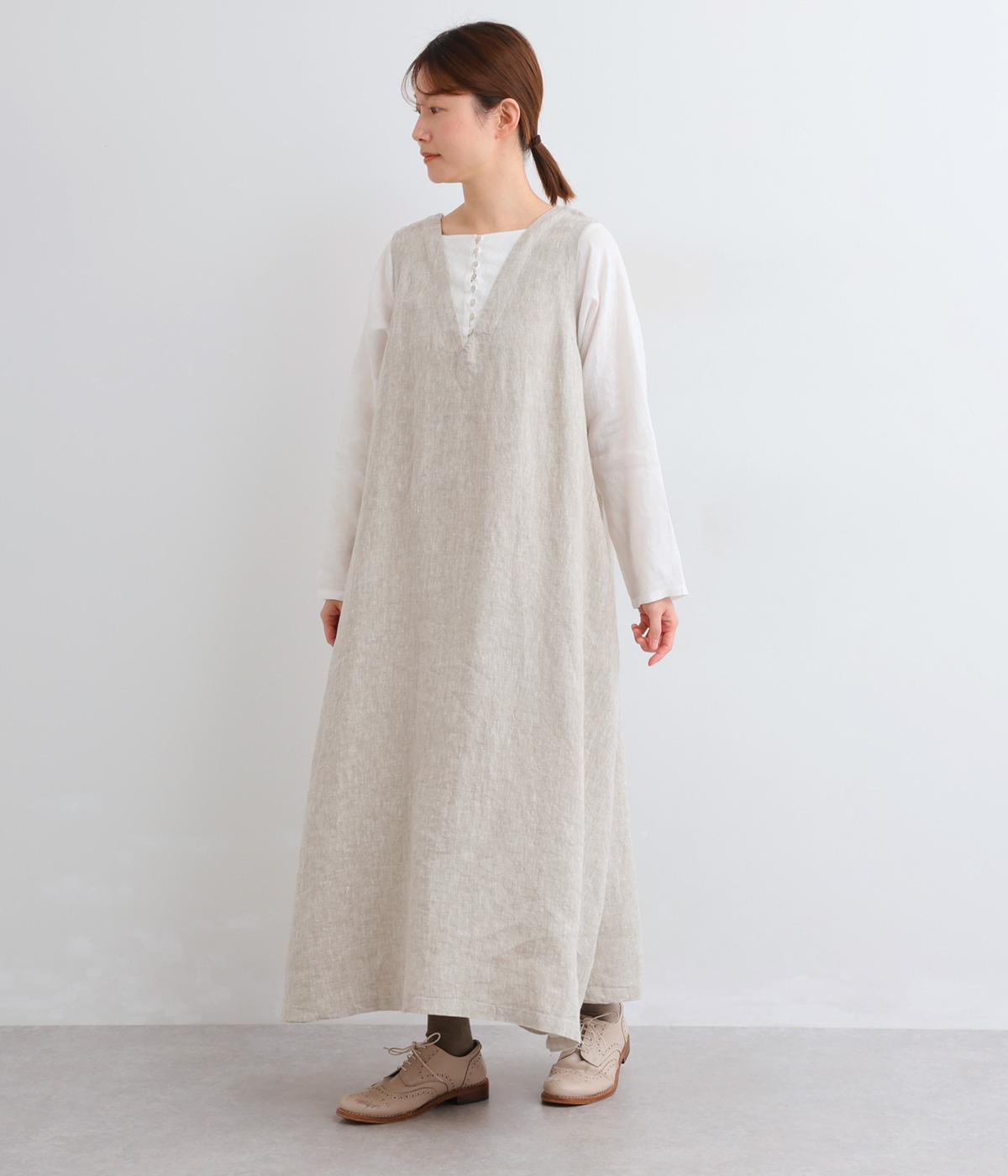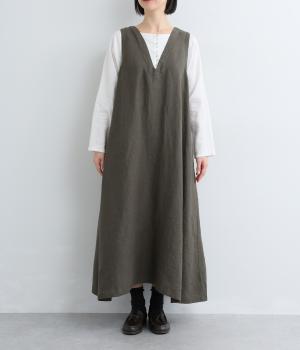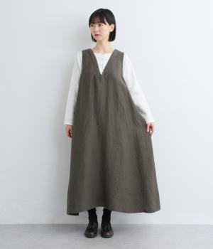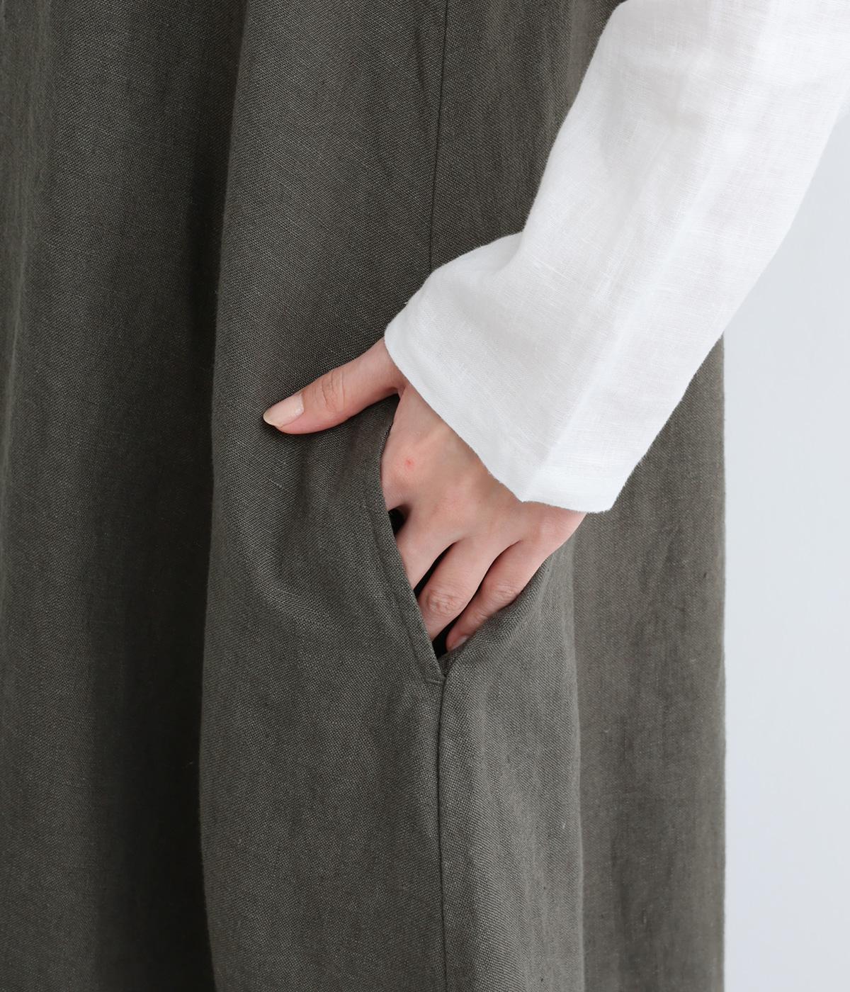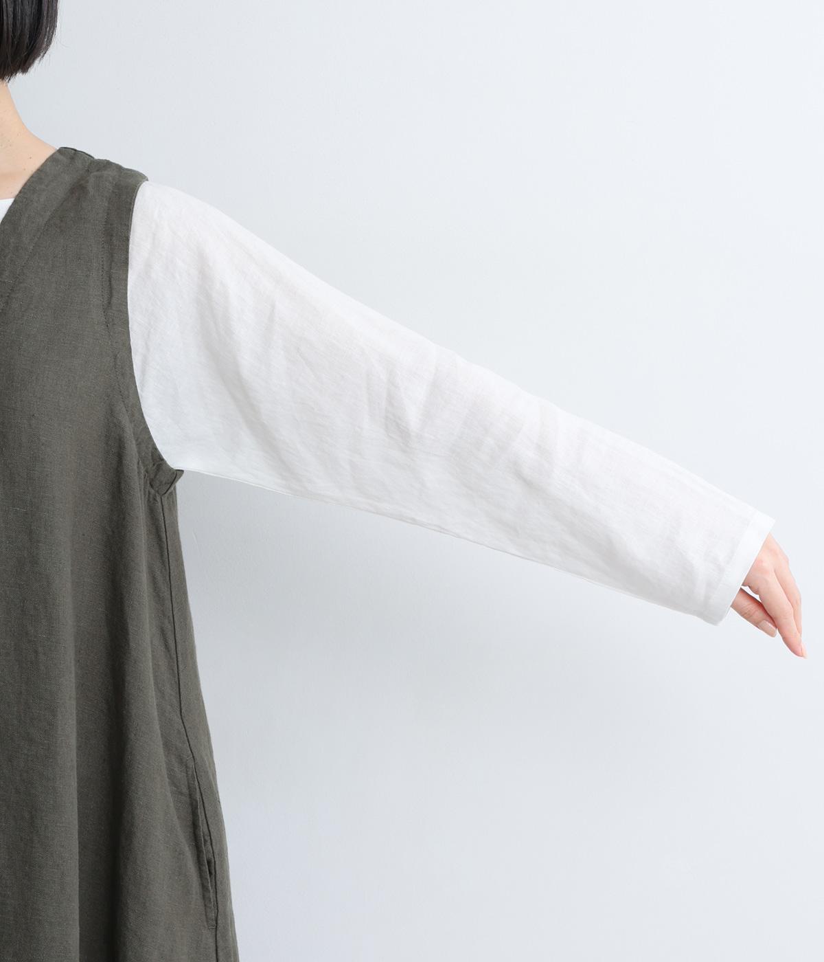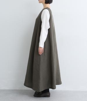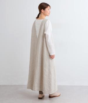 やや太めの糸で織った9番手リネンでワンピース部分を、やや細めの14番手リネンでブブラウス部分を仕立てました。しなやかなハリが美しいシルエットを保ちます。