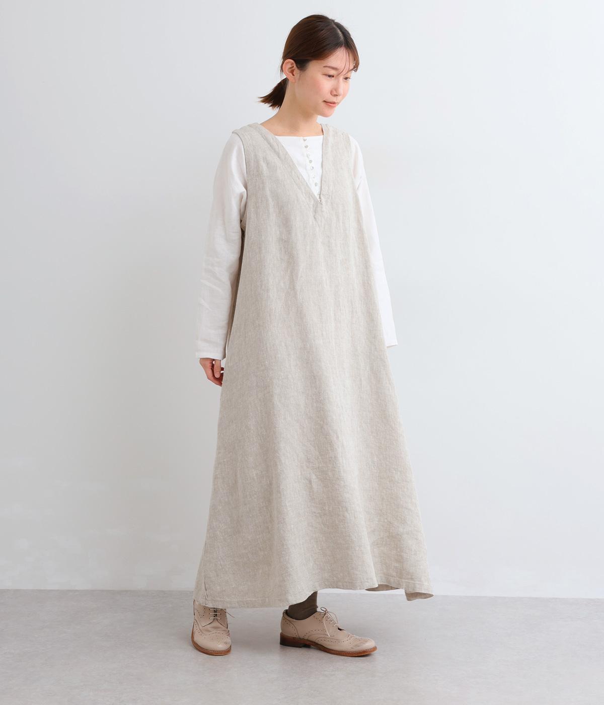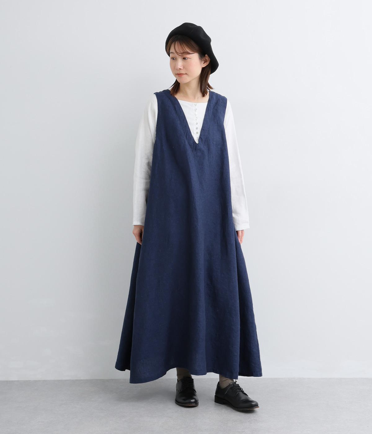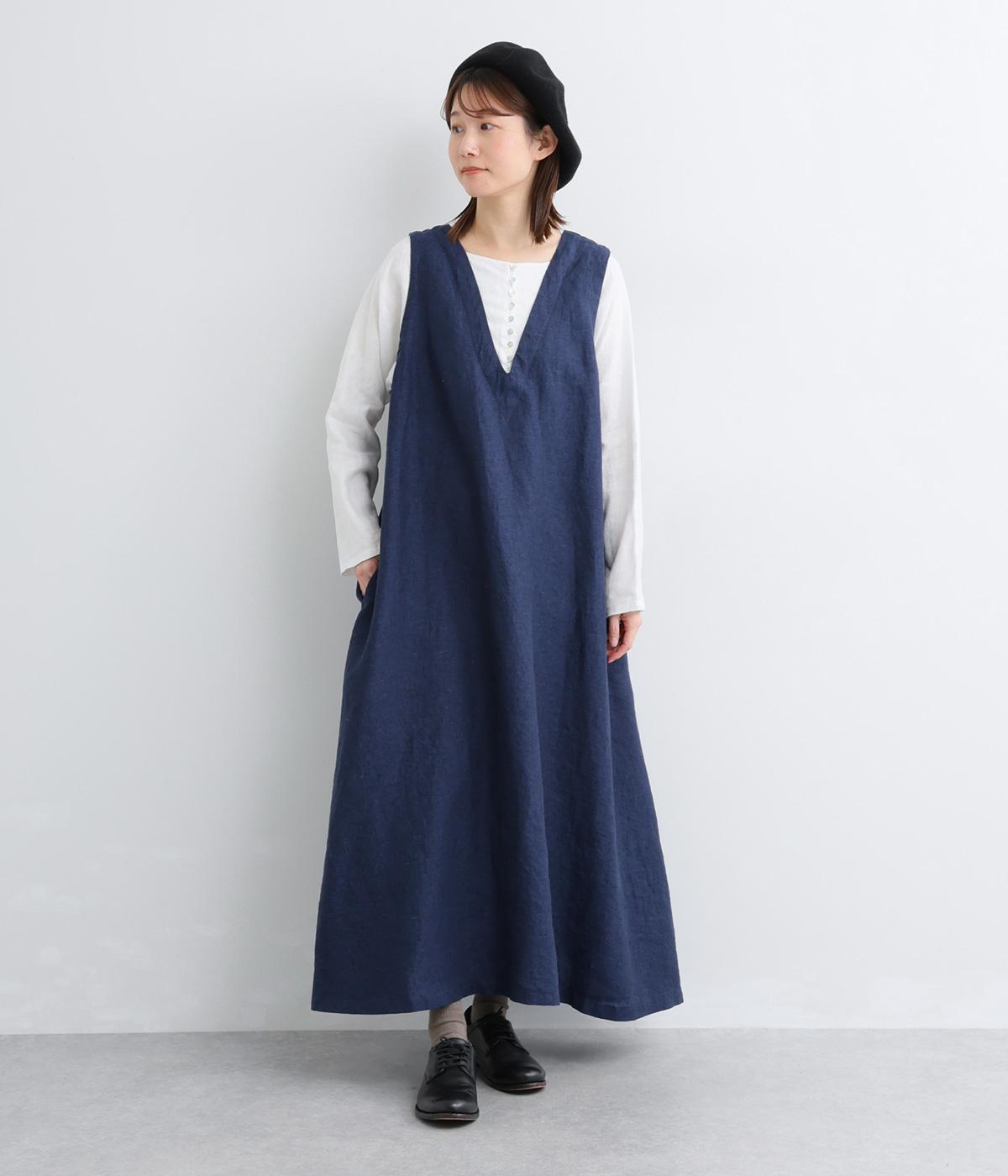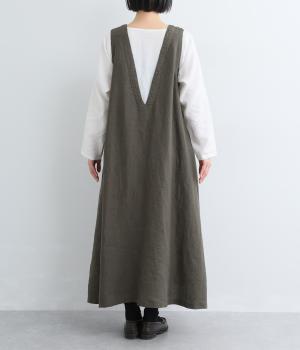 やや太めの糸で織った9番手リネンでワンピース部分を、やや細めの14番手リネンでブブラウス部分を仕立てました。しなやかなハリが美しいシルエットを保ちます。