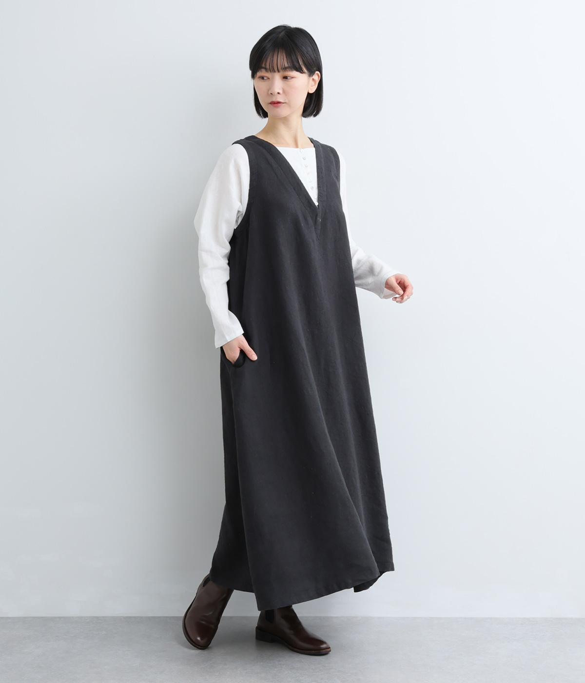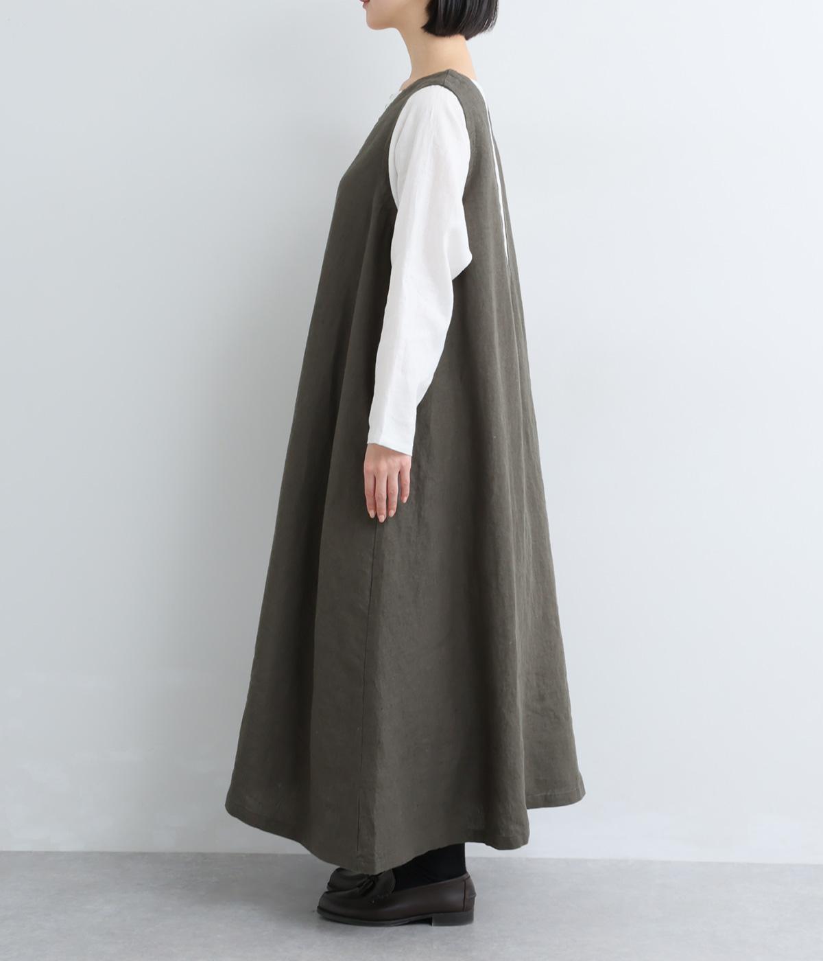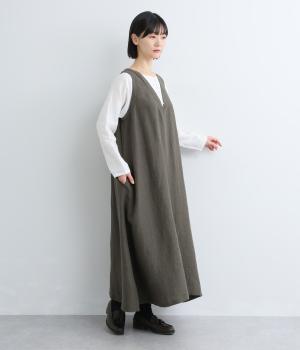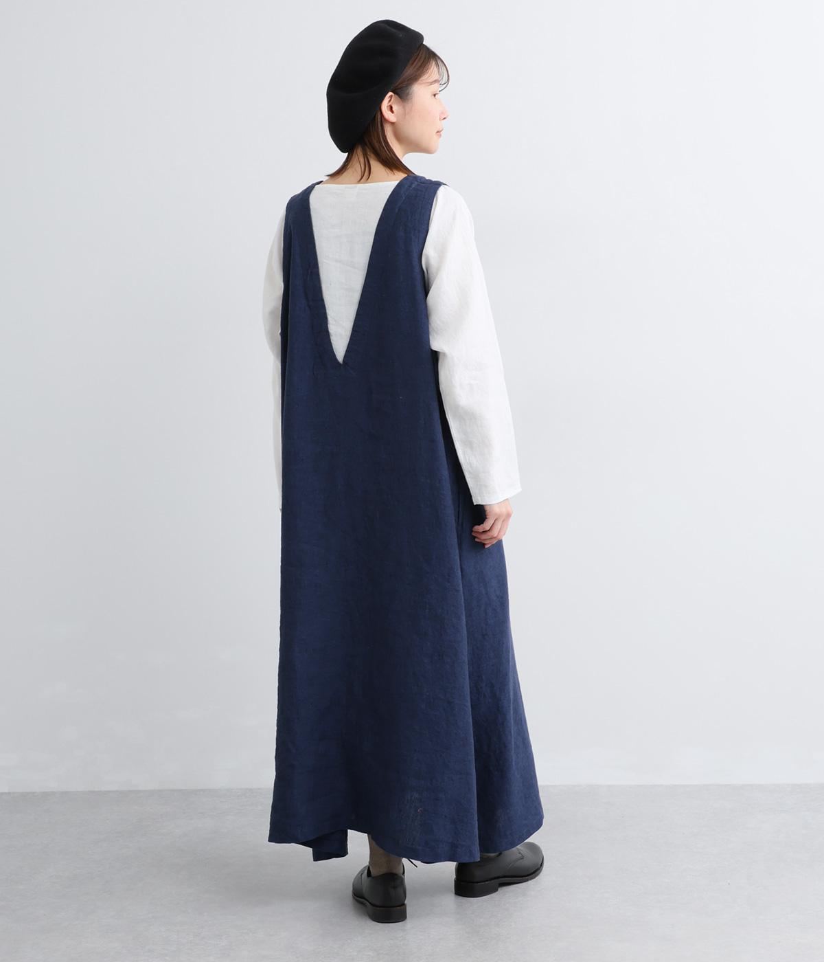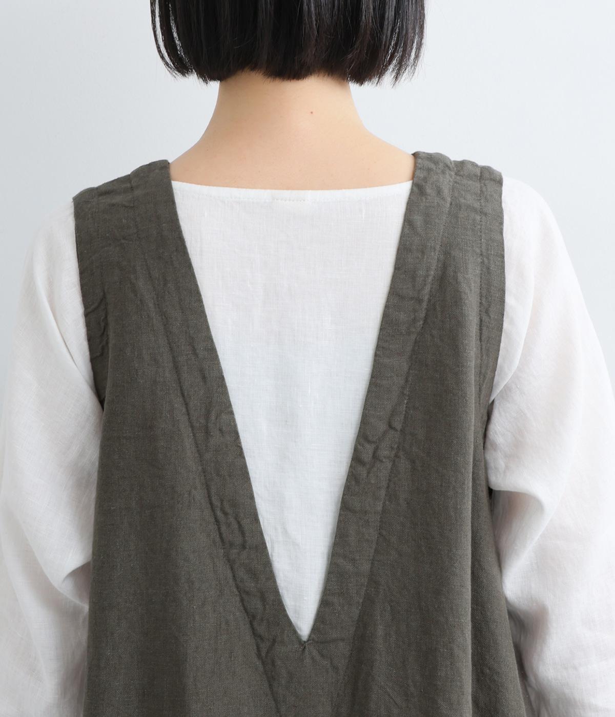 やや太めの糸で織った9番手リネンでワンピース部分を、やや細めの14番手リネンでブブラウス部分を仕立てました。しなやかなハリが美しいシルエットを保ちます。