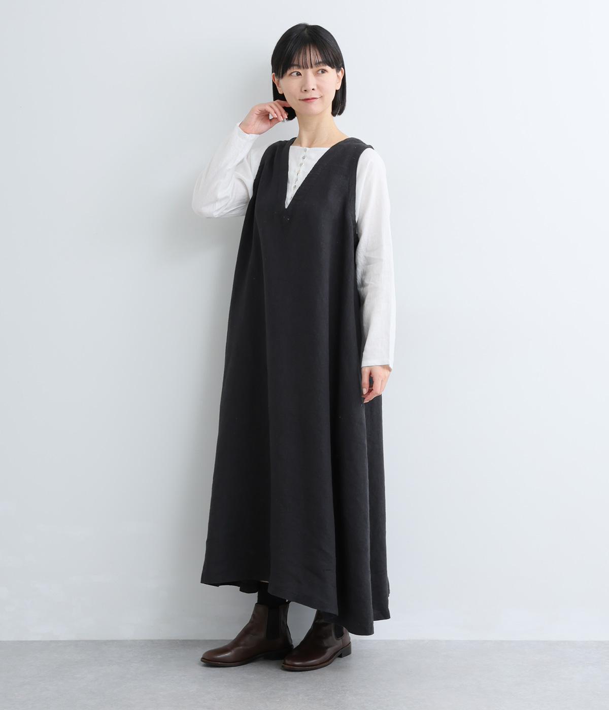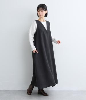 一枚でレイヤードスタイルが完成するジャンパースカート風ワンピース。胸元の多ボタンがアクセントを添えています。たっぷりの生地がふわりと広がる優雅なシルエットで、大人の上品な印象をもたらします。