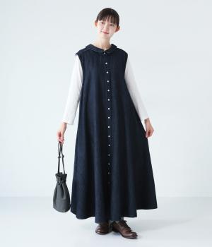 波打つようにドレープを描きながら広がるシルエットがフェミニンなデニムワンピース。背中のギャザーと控えめの襟が愛らしさを加速させます。インナーによって異なる表情をたのしめるノースリーブデザインが◎。両サイドには便利なポケットつきです。