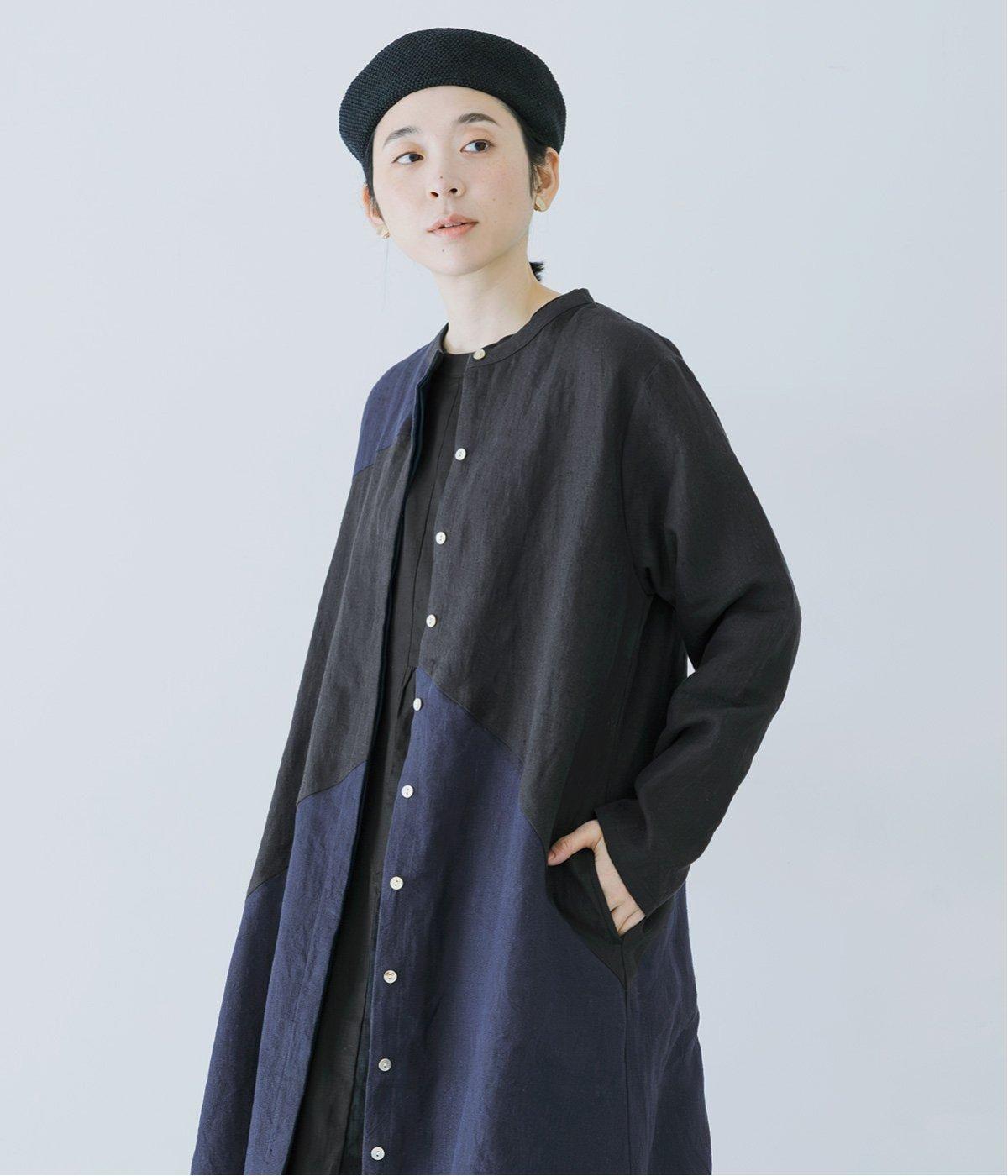 バンドカラーのすっきりとした首元と、比翼仕立ての前立てで、羽織としても楽しめるデザインです。