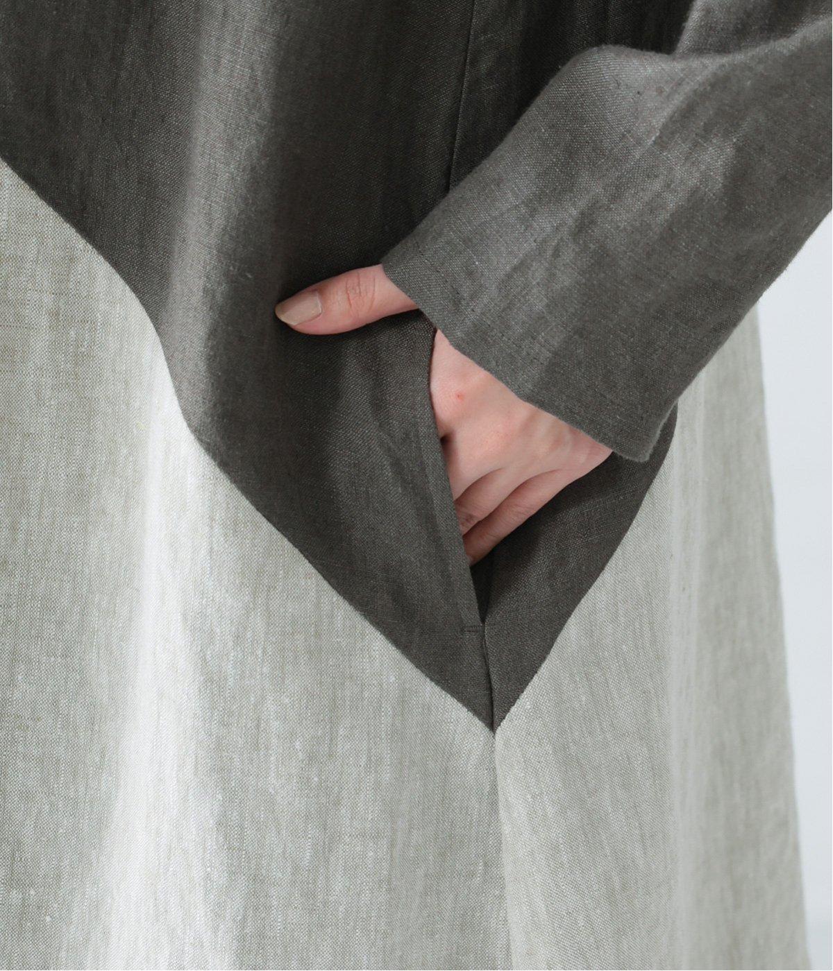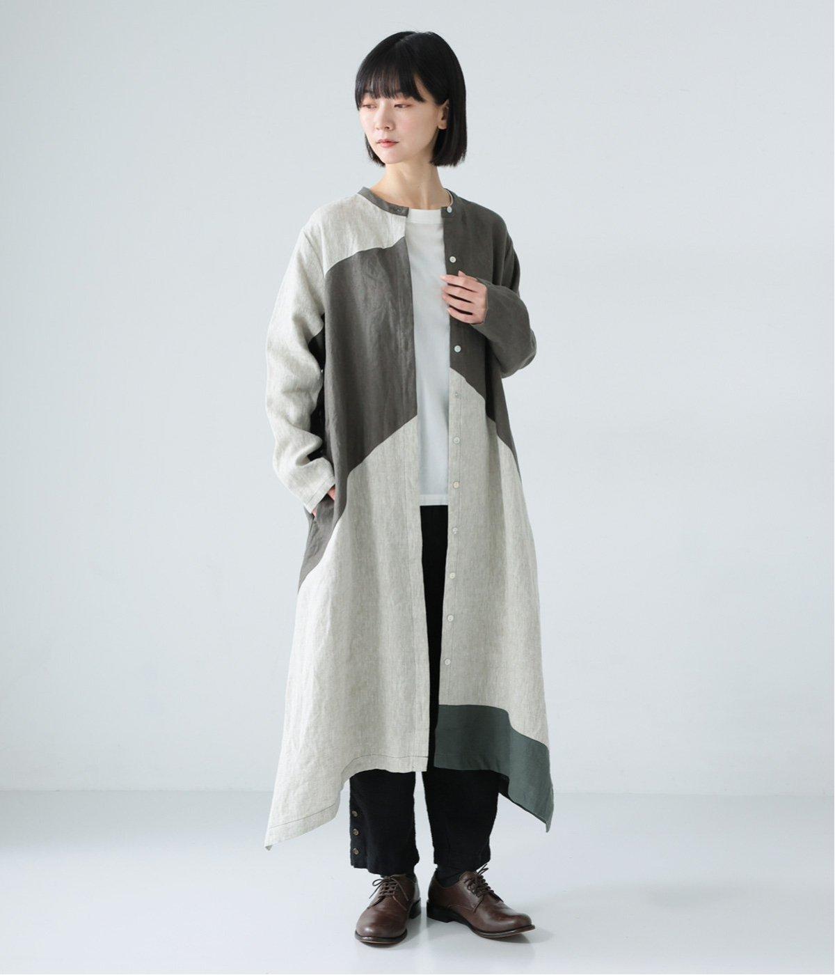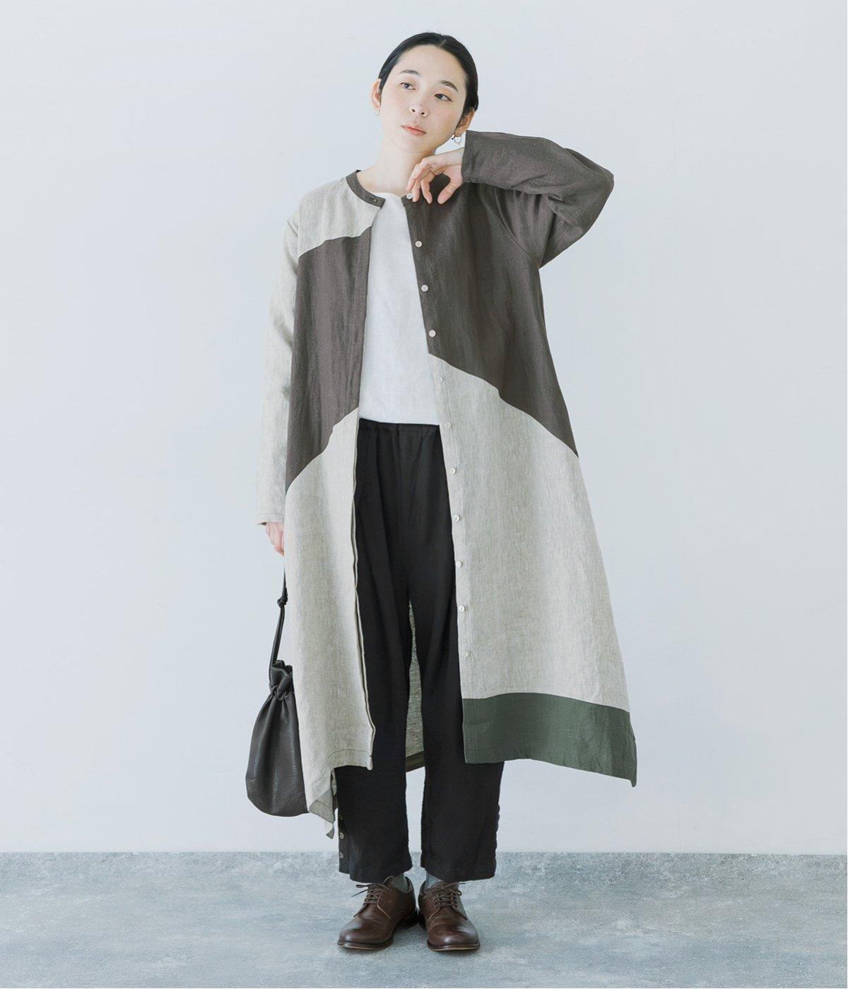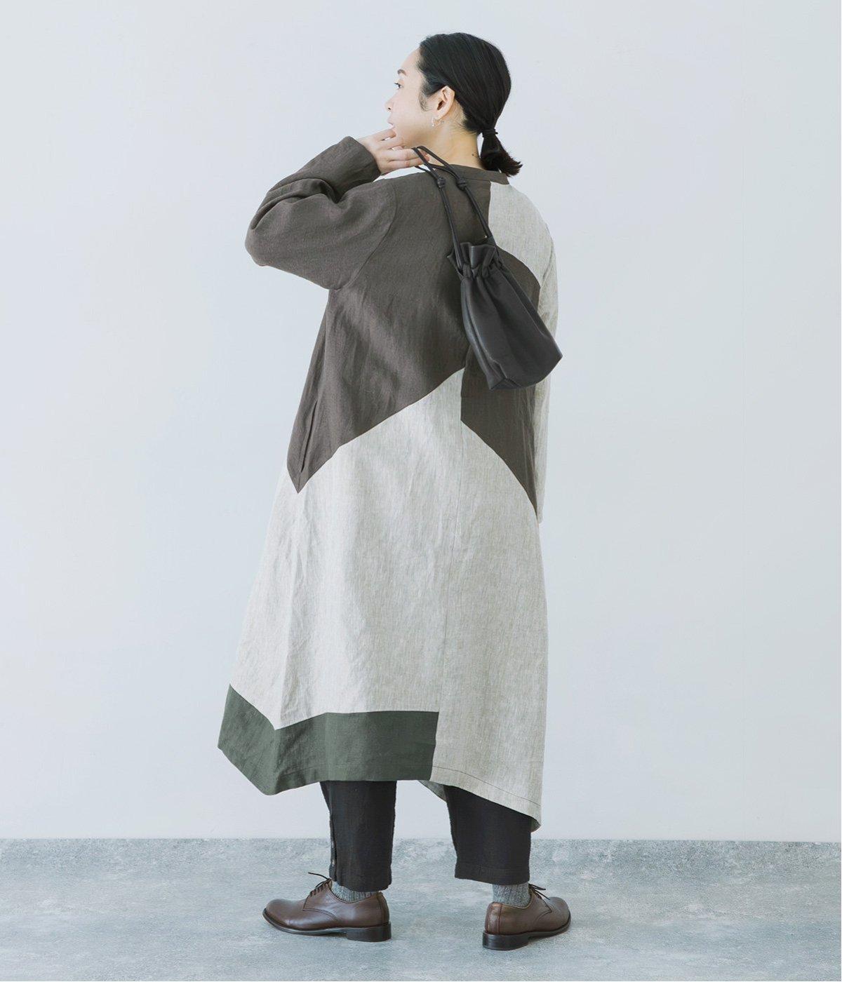 淡いグレージュに、あたたか味のあるチャコール、そして裾にはモスグリーンをあしらった、コントラストを楽しめる色合い。はっきりとした色の切り替えデザインなので、合わせるアイテムは無彩色で揃え、ワンピースを引き立てる着こなしに。