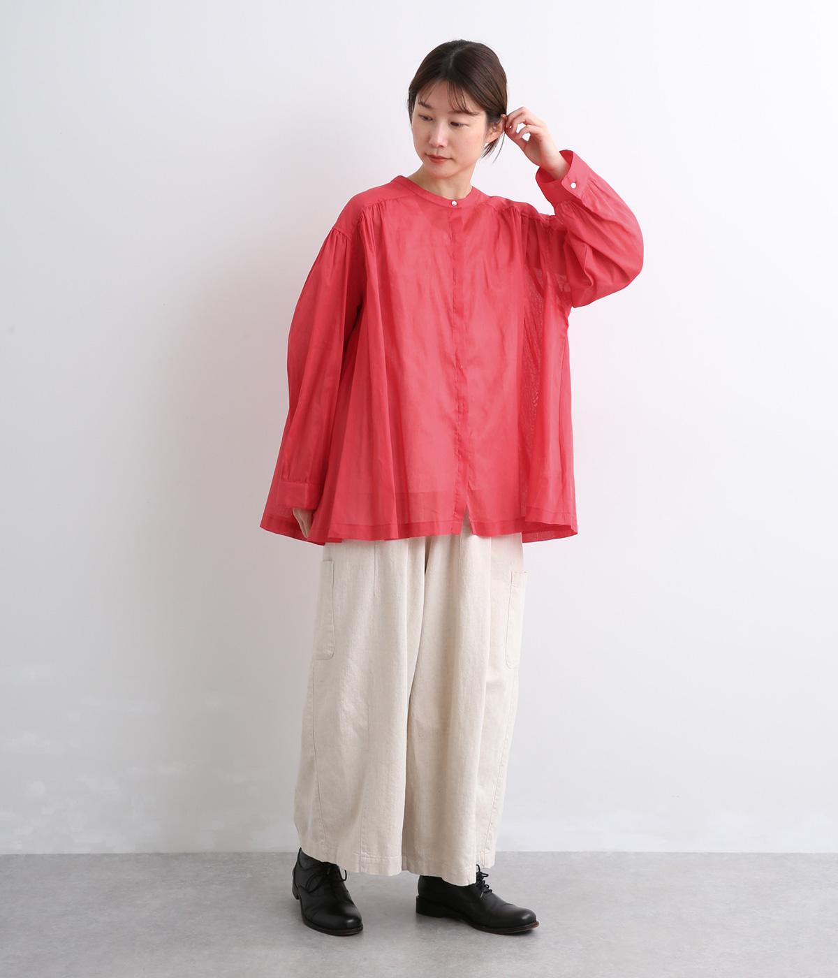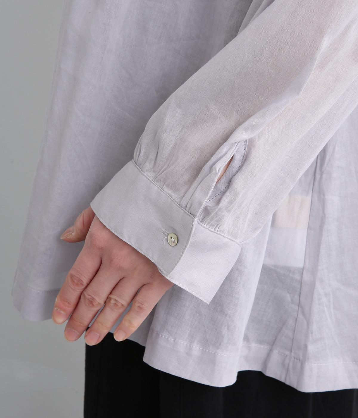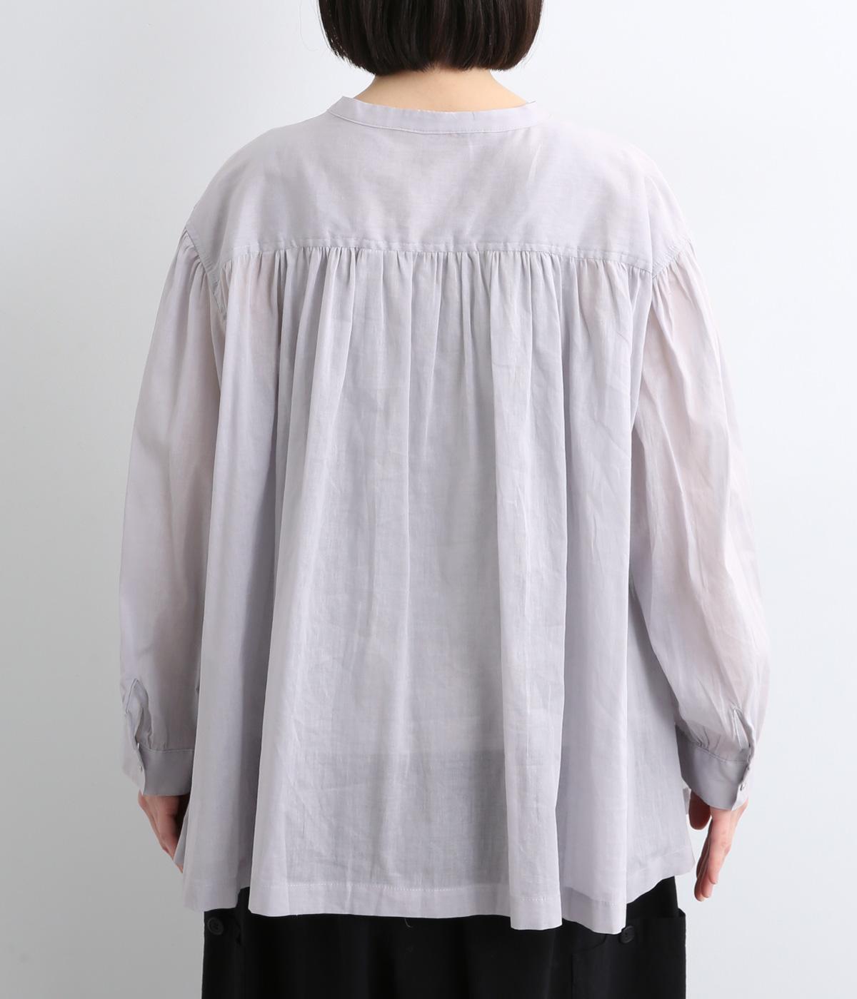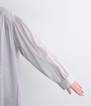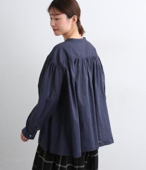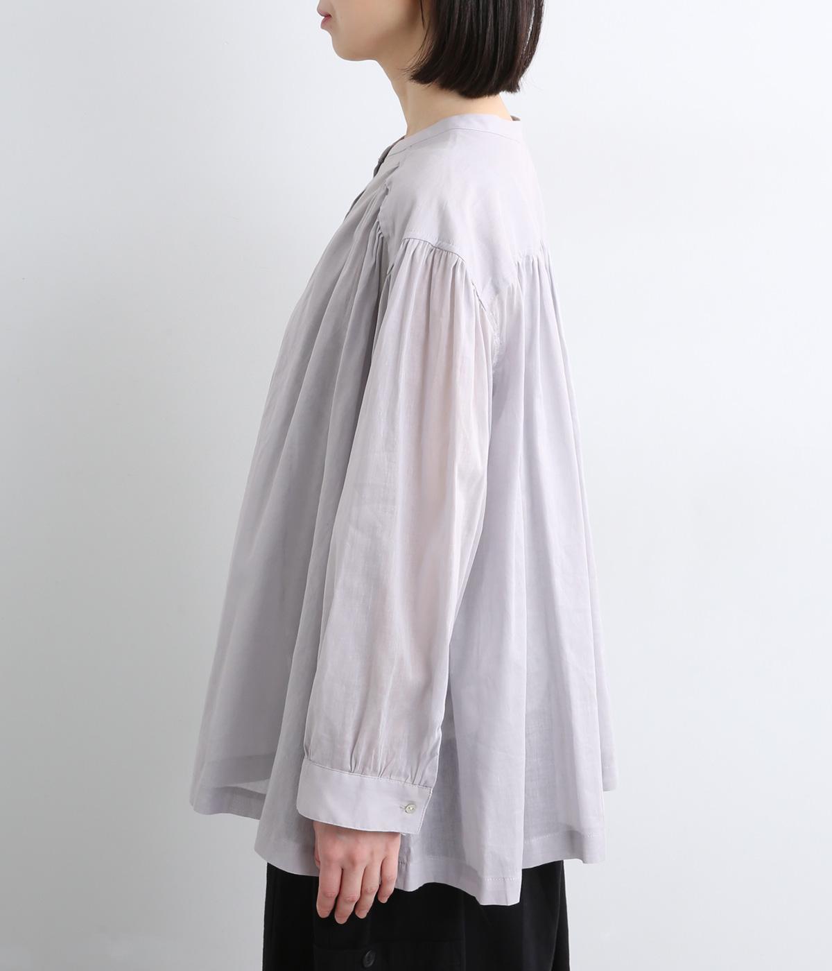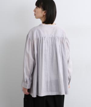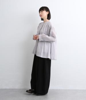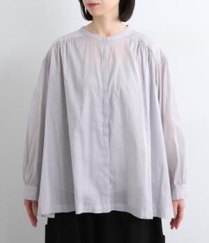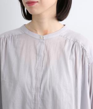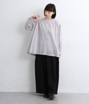肩ヨークにギャザーを入れてフレアシルエットに仕立てた、シンプルながらも着映えするブラウス。ハリ感のある素材がエアリーな着心地を生み、ほんのり透けるのでレイヤードもたのしめます。比翼仕立てで羽織り使いもおすすめ。