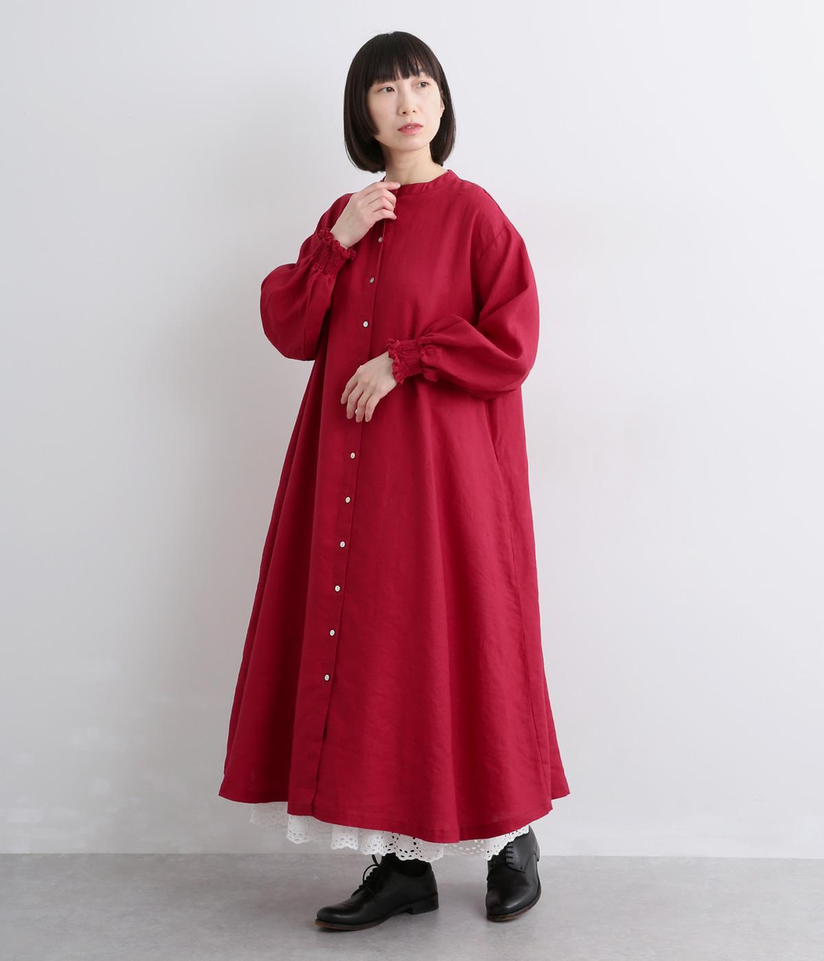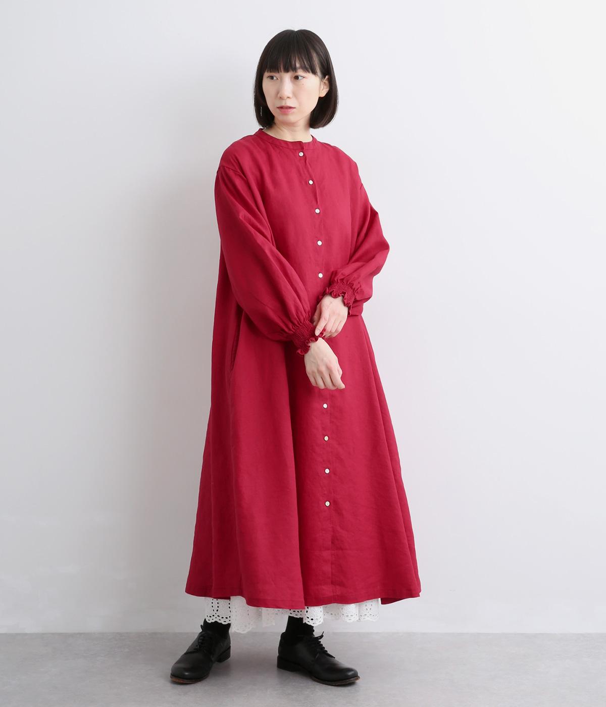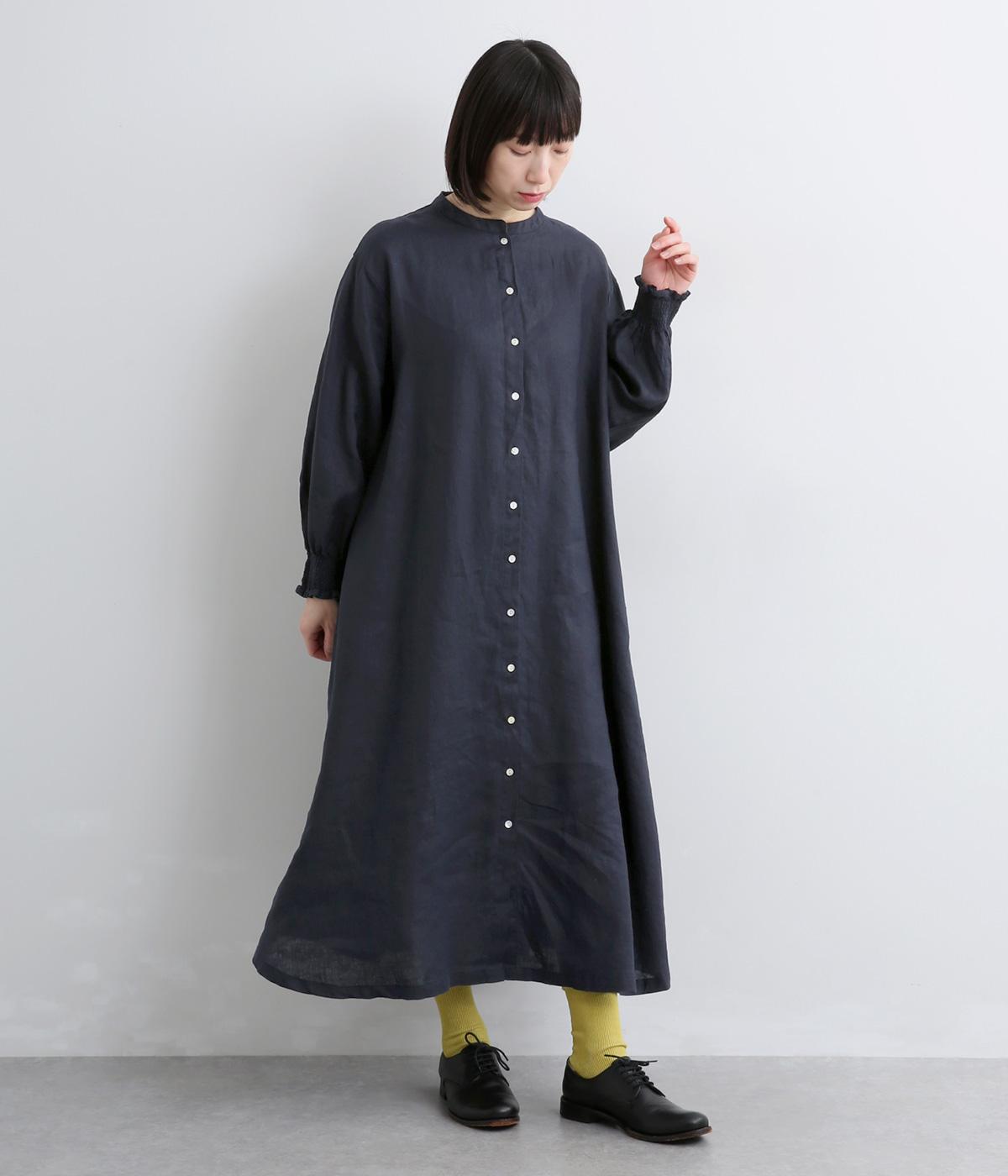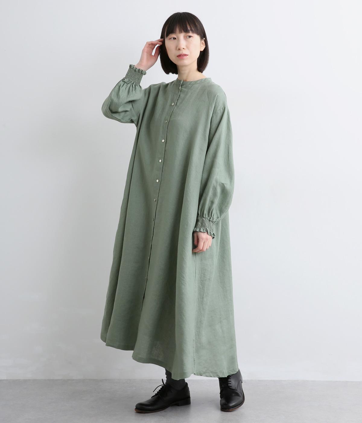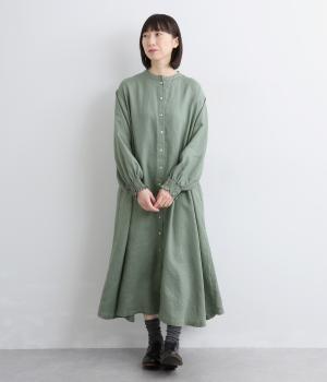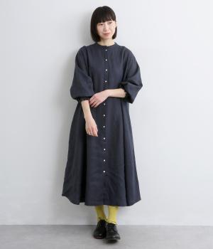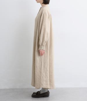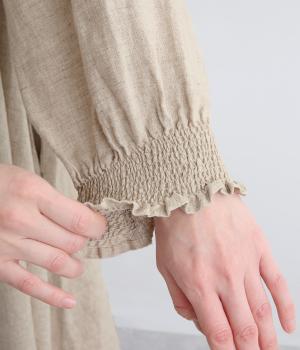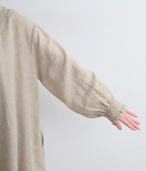 身頃はゆったりとシンプルに仕立て、シャーリングを寄せた袖がシンプルなワンピースをぐっとロマンティックに魅せます。袖口はゴム仕様になっているので、たくし上げてさらにボリュームを持たせても◎。