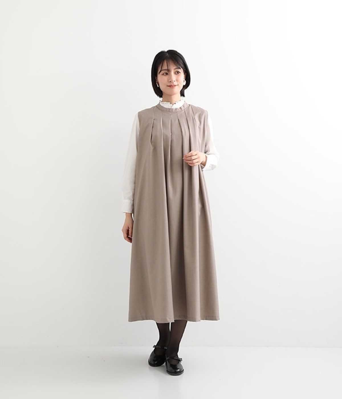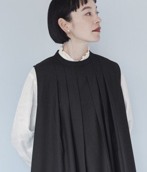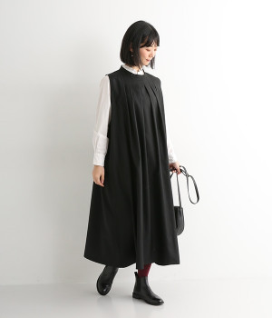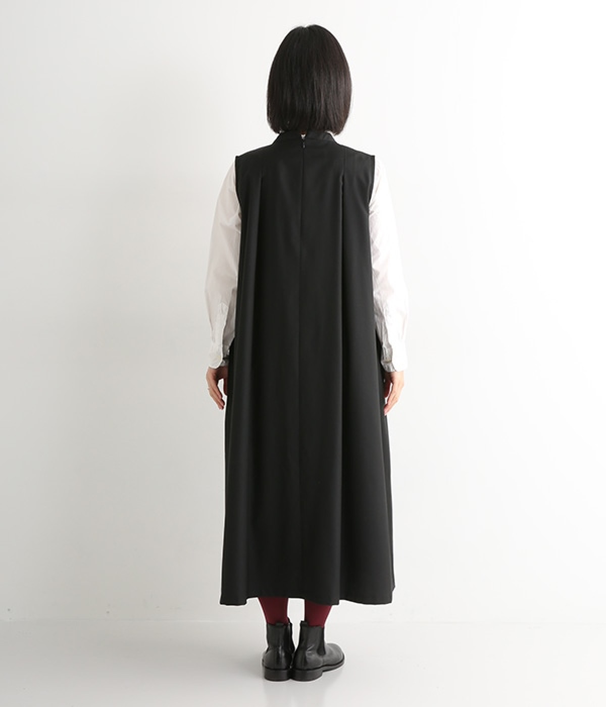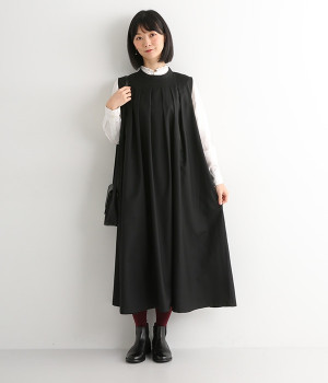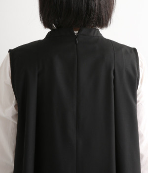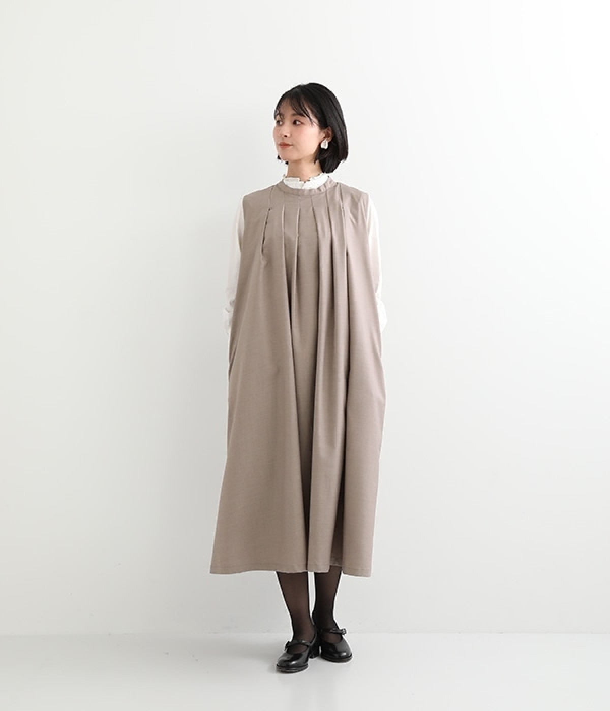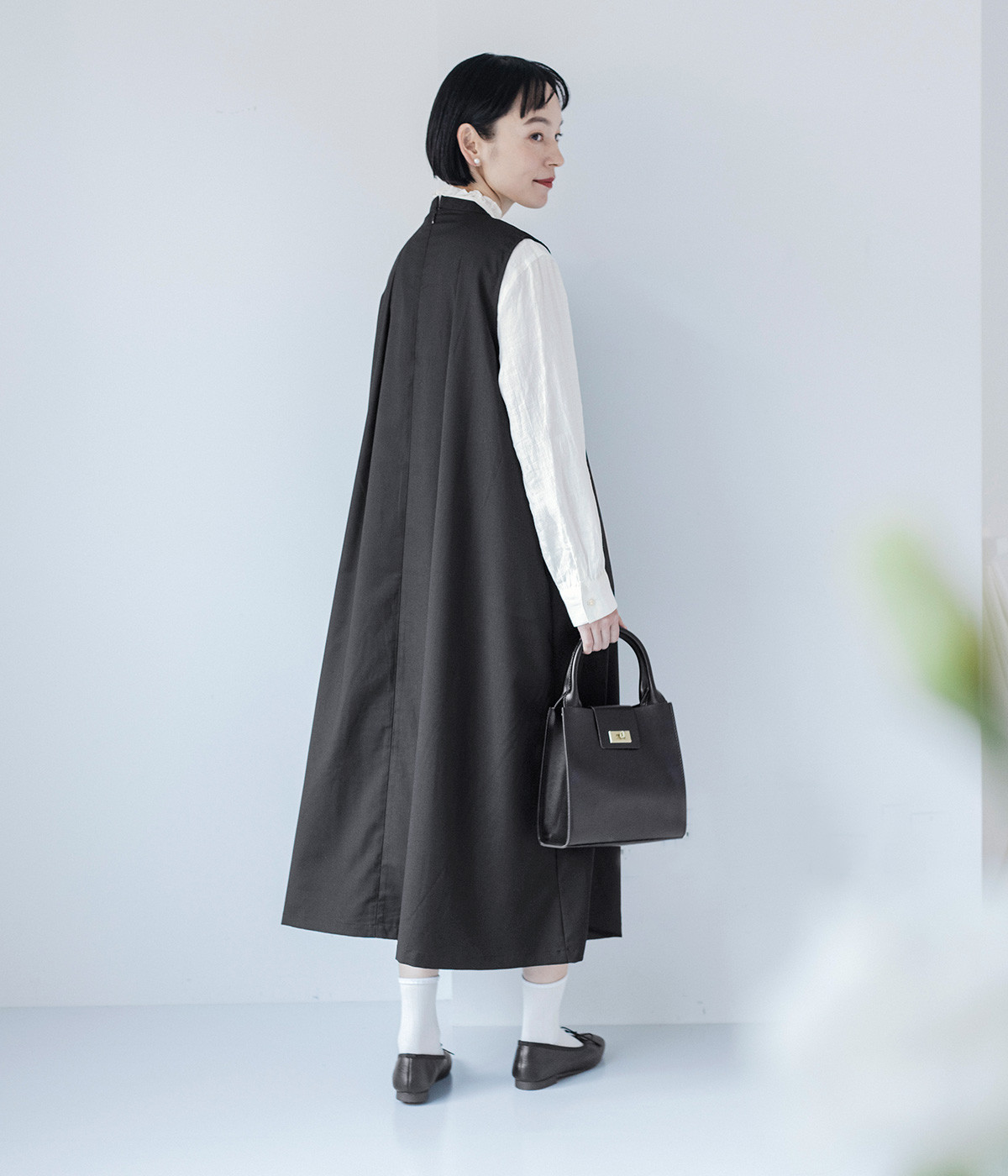 ほのかな光沢ととろみのある、上品なレーヨン混の生地で仕立てたノースリーブワンピース。少しだけ立ち上がったスタンド襟が大人っぽい表情です。フロントにはタックをとって、ゆとりのあるシルエットに仕上げました。背中はファスナーで大きく開くので着脱がスムーズ。透けにくいので一枚で安心して着用できます。少しきれいめに見せたい日など、幅広い場面で活躍します。