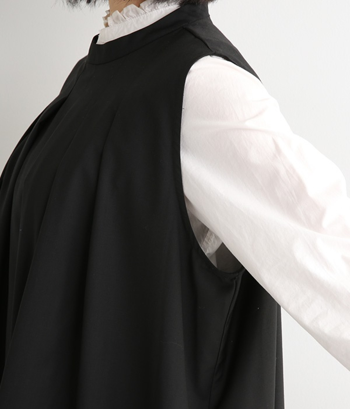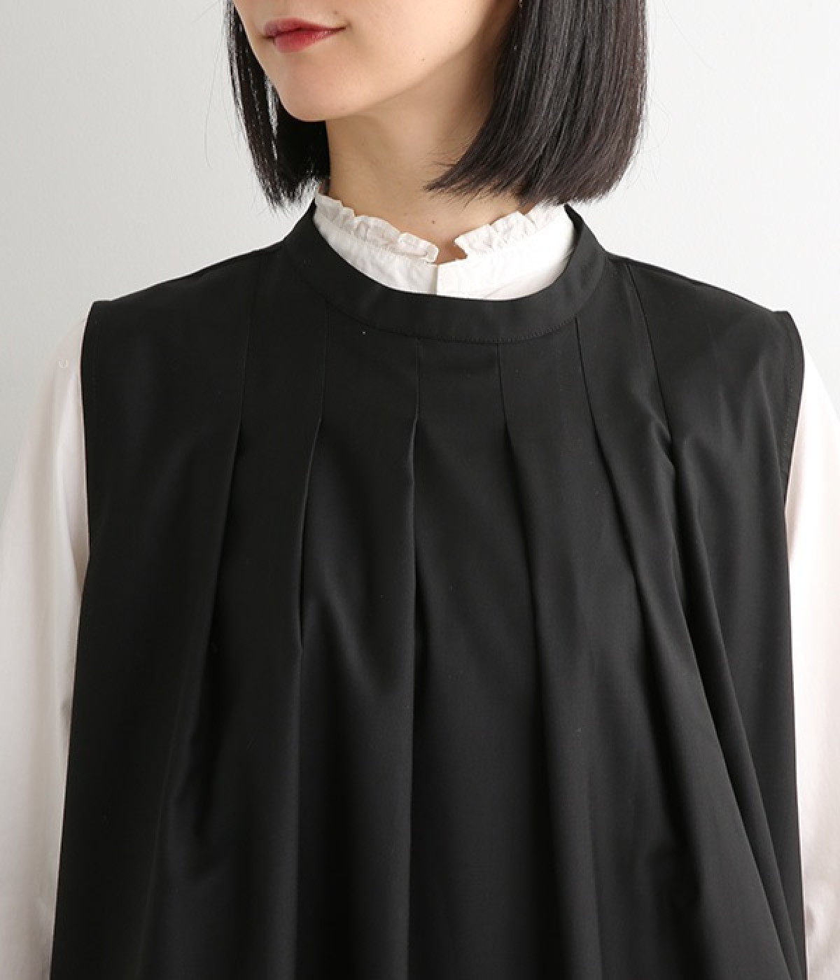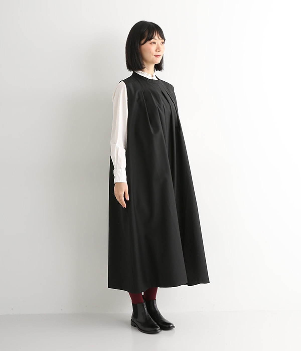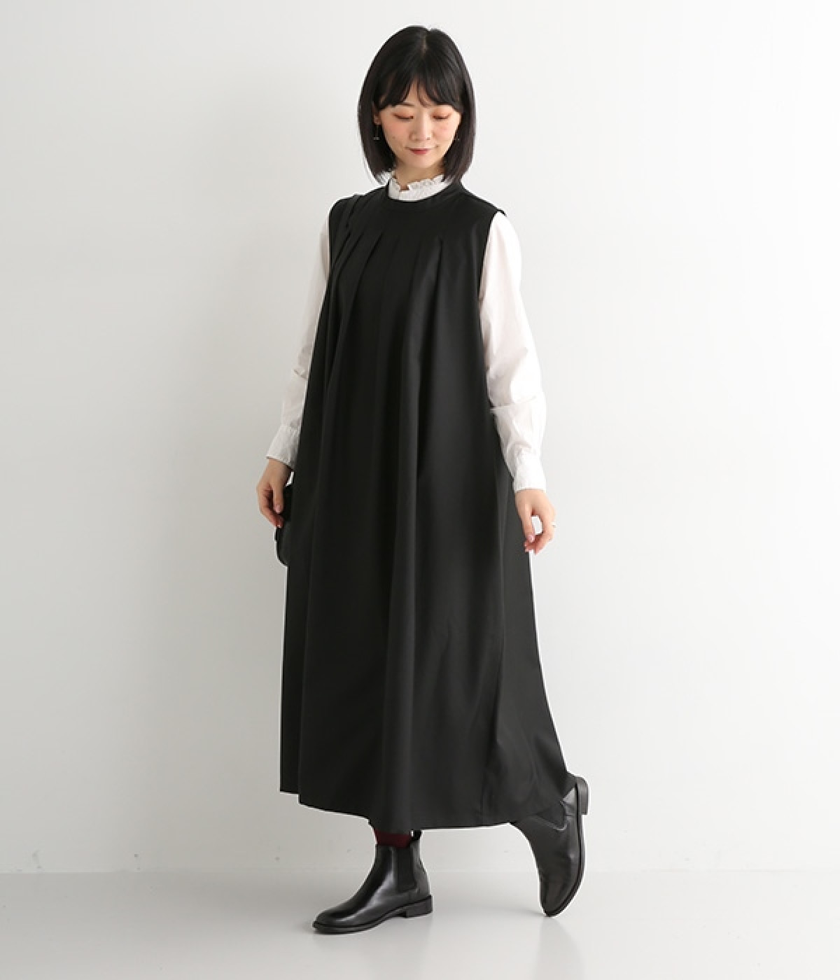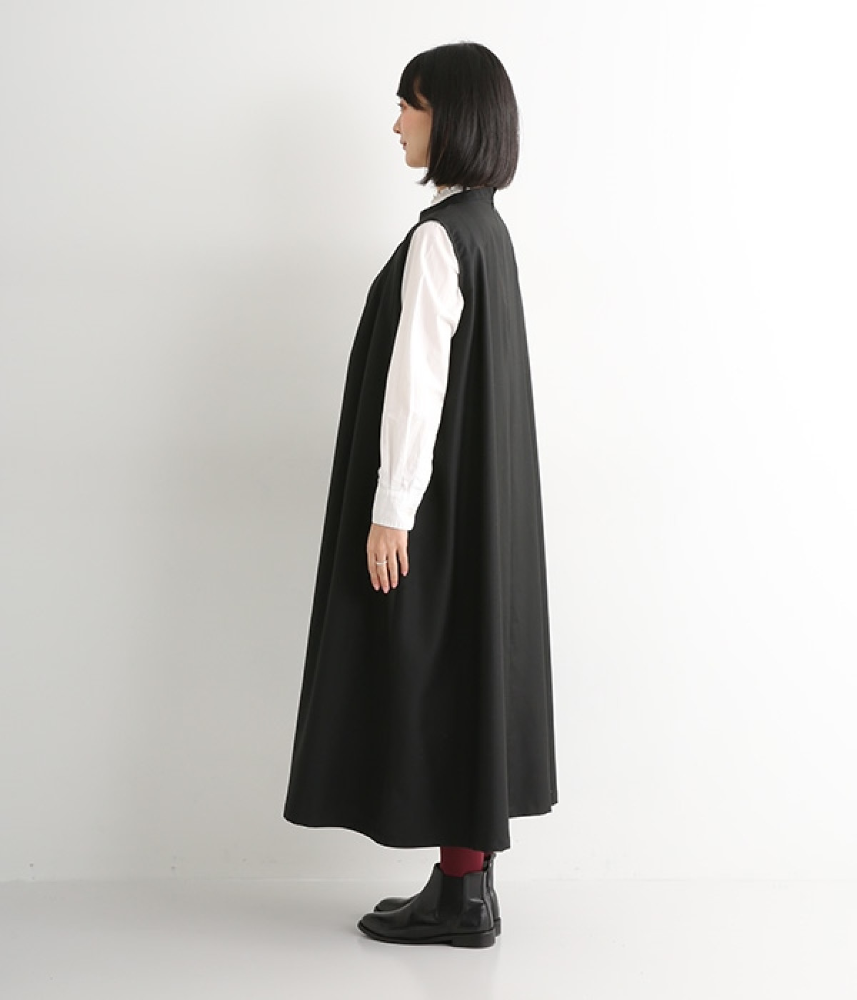ほのかな光沢ととろみのある、上品なレーヨン混の生地で仕立てたノースリーブワンピース。少しだけ立ち上がったスタンド襟が大人っぽい表情です。フロントにはタックをとって、ゆとりのあるシルエットに仕上げました。背中はファスナーで大きく開くので着脱がスムーズ。透けにくいので一枚で安心して着用できます。少しきれいめに見せたい日など、幅広い場面で活躍します。