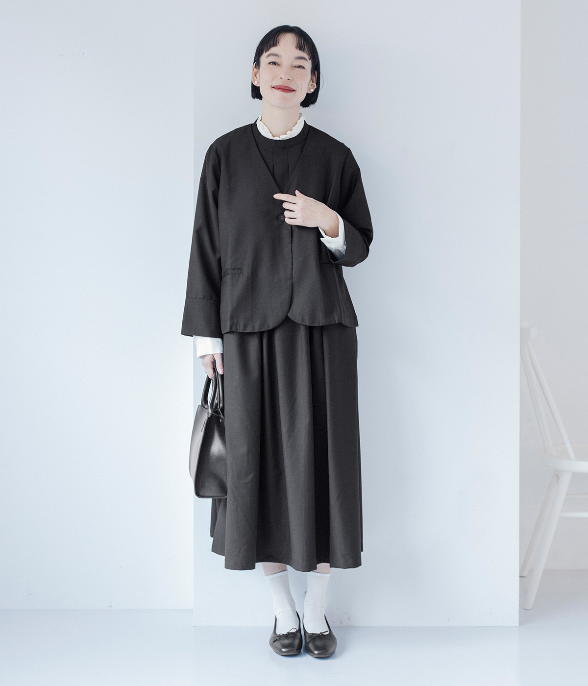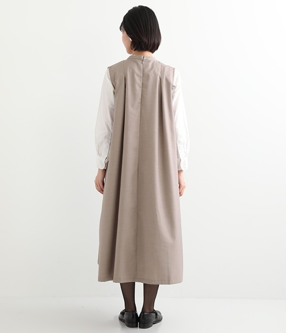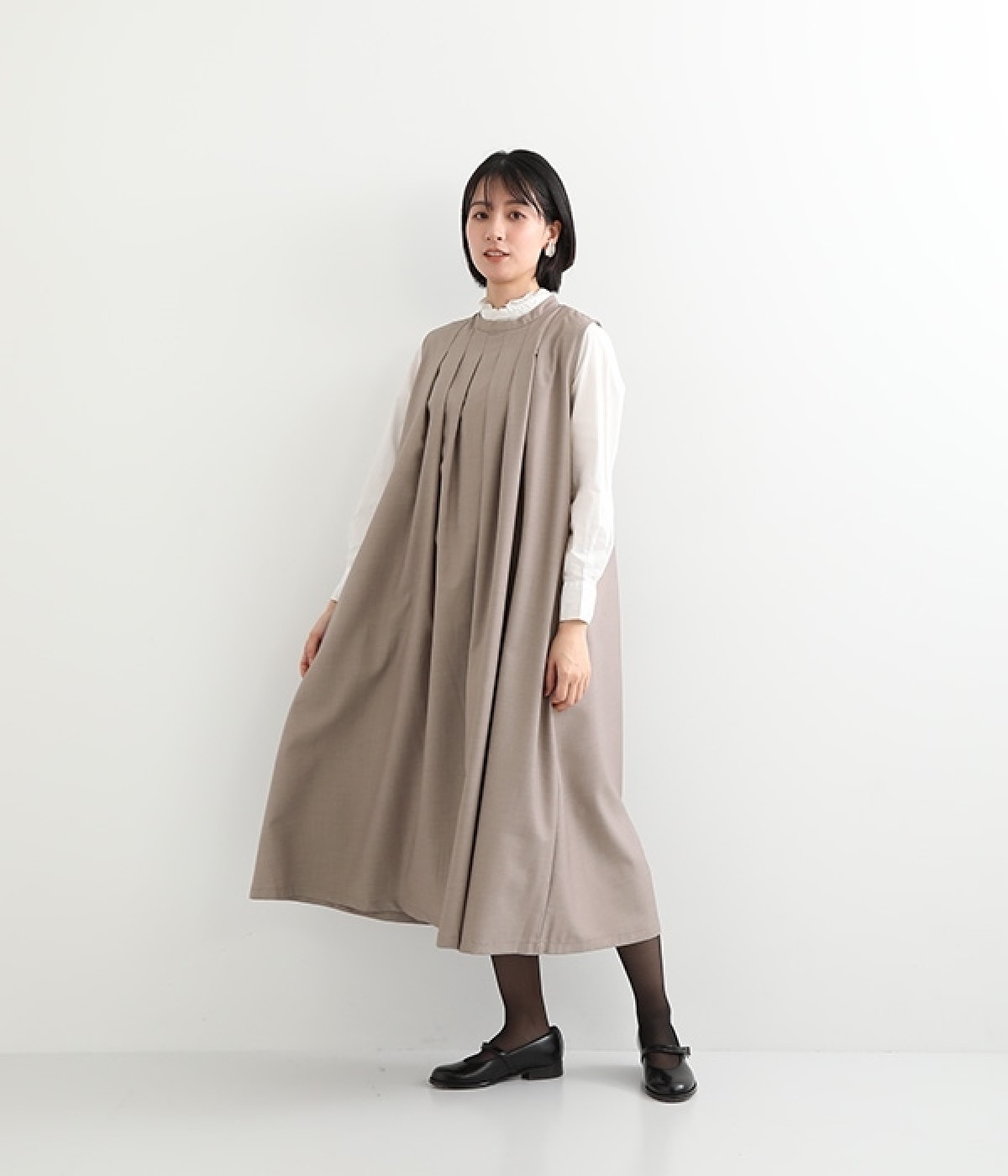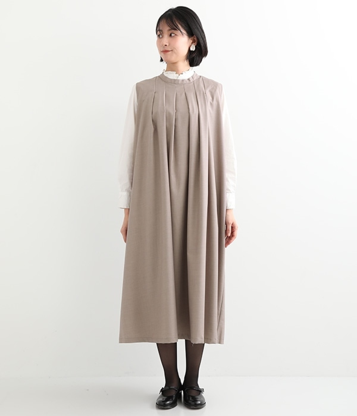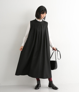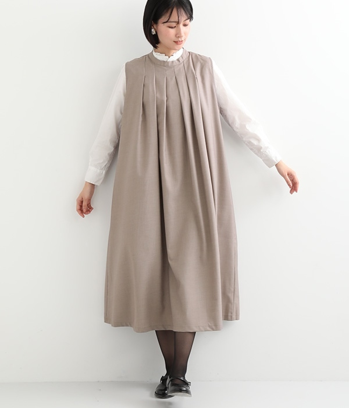 ほのかな光沢ととろみのある、上品なレーヨン混の生地で仕立てたノースリーブワンピース。少しだけ立ち上がったスタンド襟が大人っぽい表情です。フロントにはタックをとって、ゆとりのあるシルエットに仕上げました。背中はファスナーで大きく開くので着脱がスムーズ。透けにくいので一枚で安心して着用できます。少しきれいめに見せたい日など、幅広い場面で活躍します。