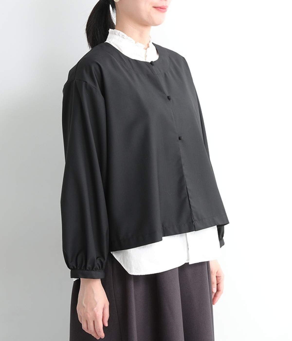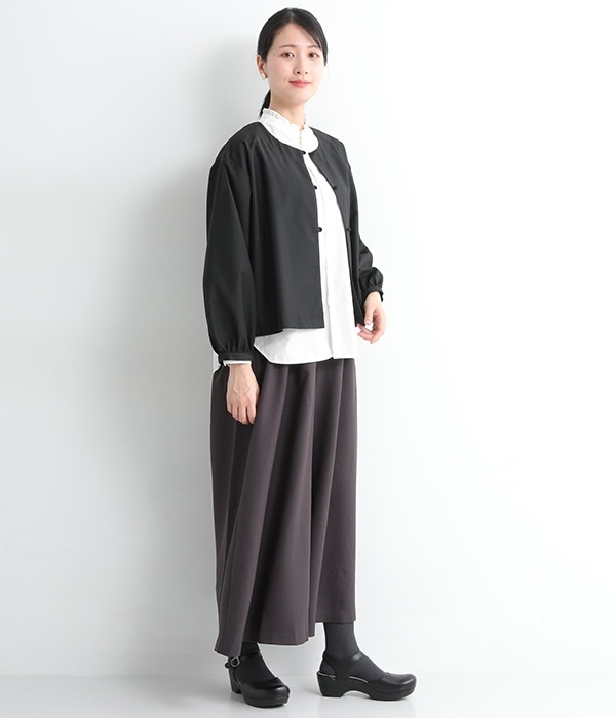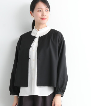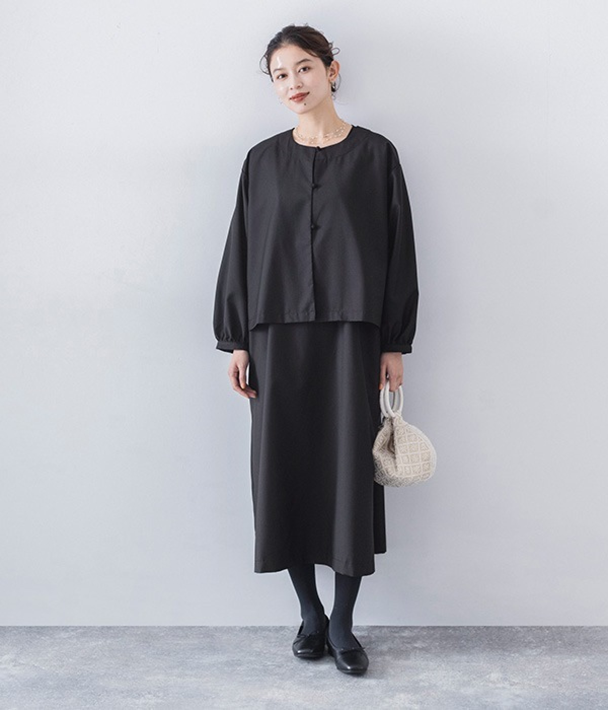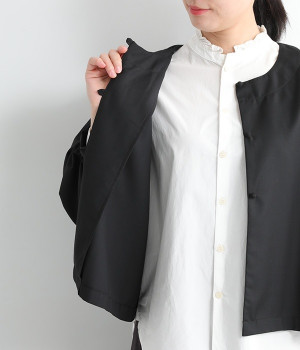 セレモニーシーンにも寄り添う、なめらかで落ち着いたつやめきを持つショート羽織り。きれいめな雰囲気たっぷりですが、袖にはふんわりボリュームをもたせてかわいらしいニュアンスを加えました。身生地になじむくるみボタンは、数を少なめにしてさりげなく着心地にゆとりをプラス。襟高のアイテムと相性良く合わせられる、深くあいたネックラインも◎。同素材でつくったワンピースとのセット使いで、統一感のある大人のおでかけスタイルが完成します。