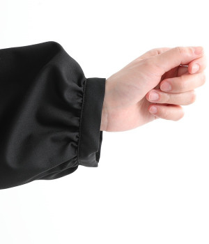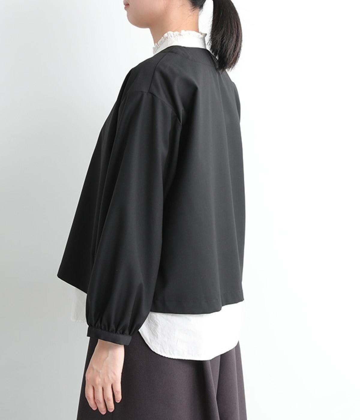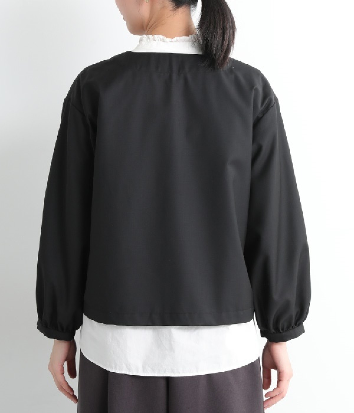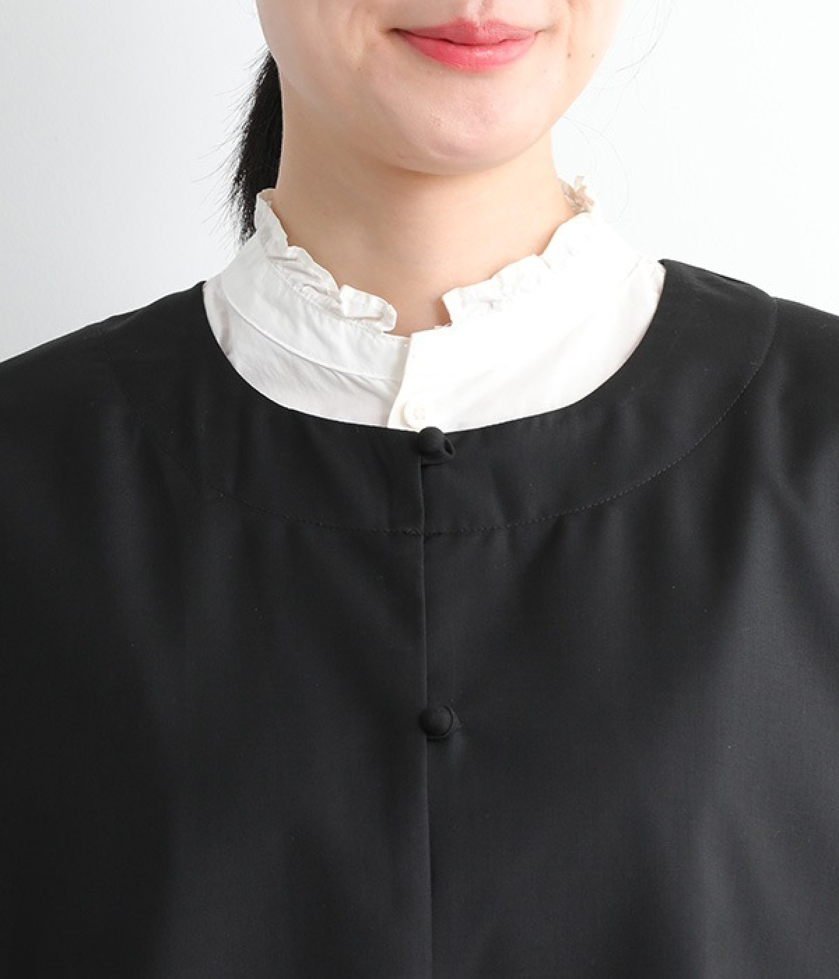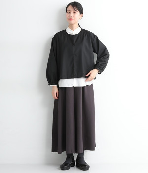 セレモニーシーンにも寄り添う、なめらかで落ち着いたつやめきを持つショート羽織り。きれいめな雰囲気たっぷりですが、袖にはふんわりボリュームをもたせてかわいらしいニュアンスを加えました。身生地になじむくるみボタンは、数を少なめにしてさりげなく着心地にゆとりをプラス。襟高のアイテムと相性良く合わせられる、深くあいたネックラインも◎。同素材でつくったワンピースとのセット使いで、統一感のある大人のおでかけスタイルが完成します。