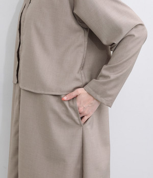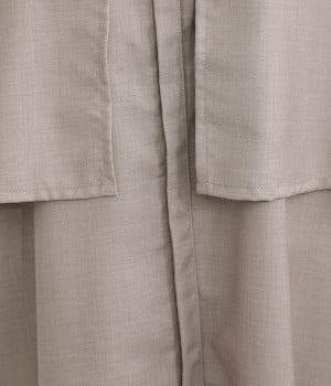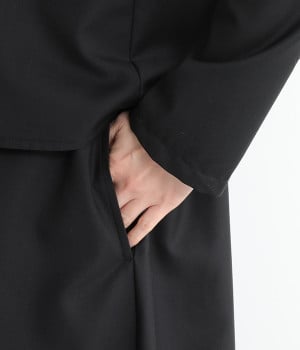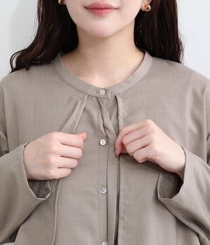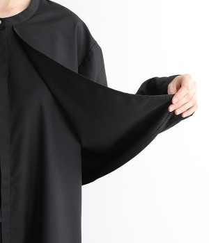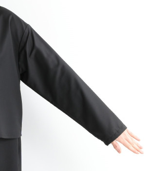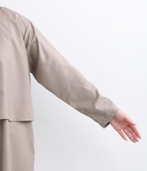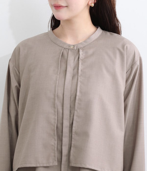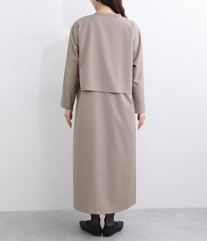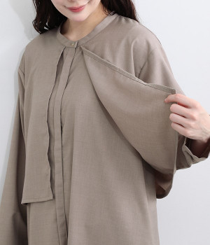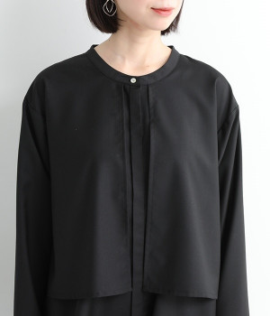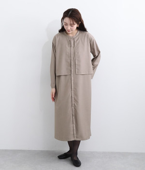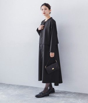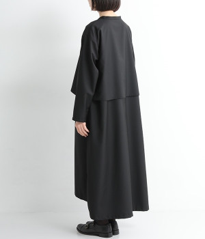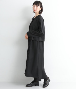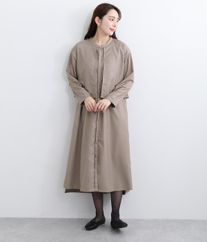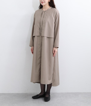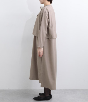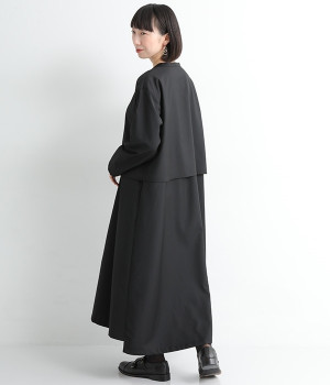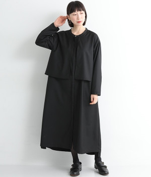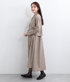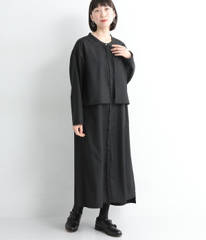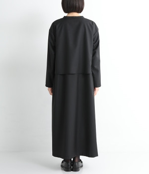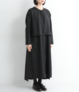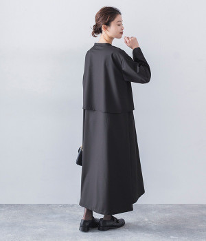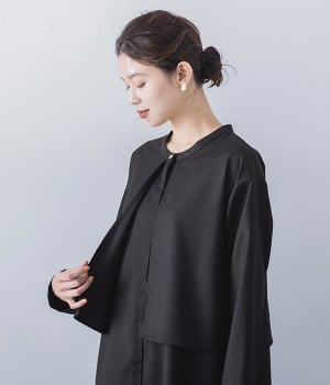 セレモニーシーンにも寄り添う、なめらかで落ち着いたつやめきを持つワンピース。ショート丈のジャケットを着合わせているかのような、別布の重なりでフェイクレイヤードを楽しめます。織りの密度が細かいため、インナーの透けを気にせずに着られるのが◎。前立ては比翼仕立てでシンプルな印象に。フロントボタンを全開にすると、ほどよく抜け感が出て装いがカジュアルにシフトします。