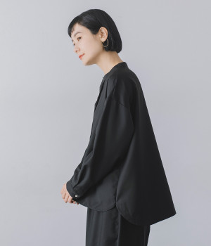 セレモニーなどのちょっとかしこまった場に対応するブラウス&テーパードパンツのセット。かっちりとなり過ぎないよう、どちらのアイテムもゆとりを持って着られるサイズに仕上げています。ブラウスはフロントのピンタックをアシンメトリーにしてデザイン性をプラス。コンパクト丈なのでセットのゆるパンツとバランス良く着こなせます。パンツのウエストにはゴムを通したリラックス仕様です。