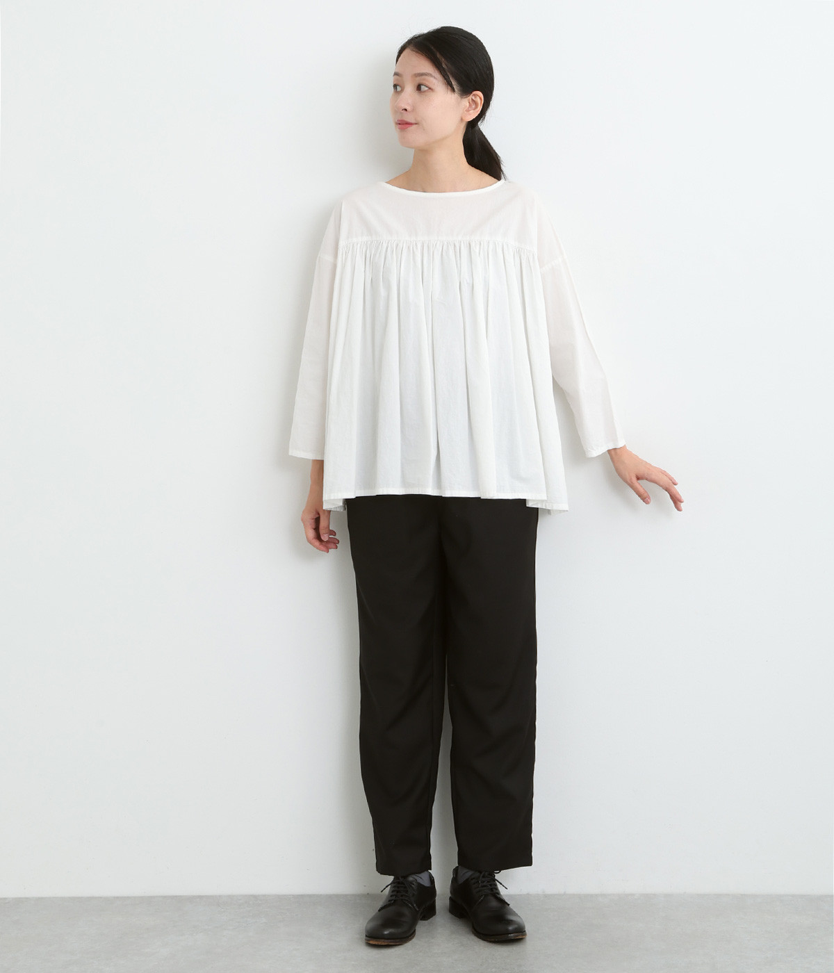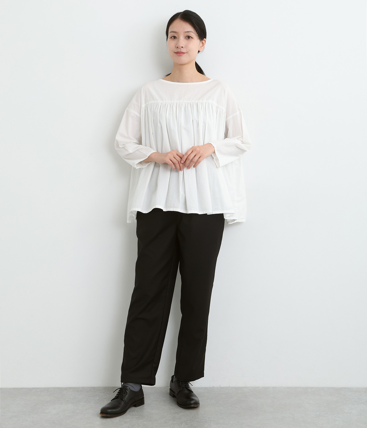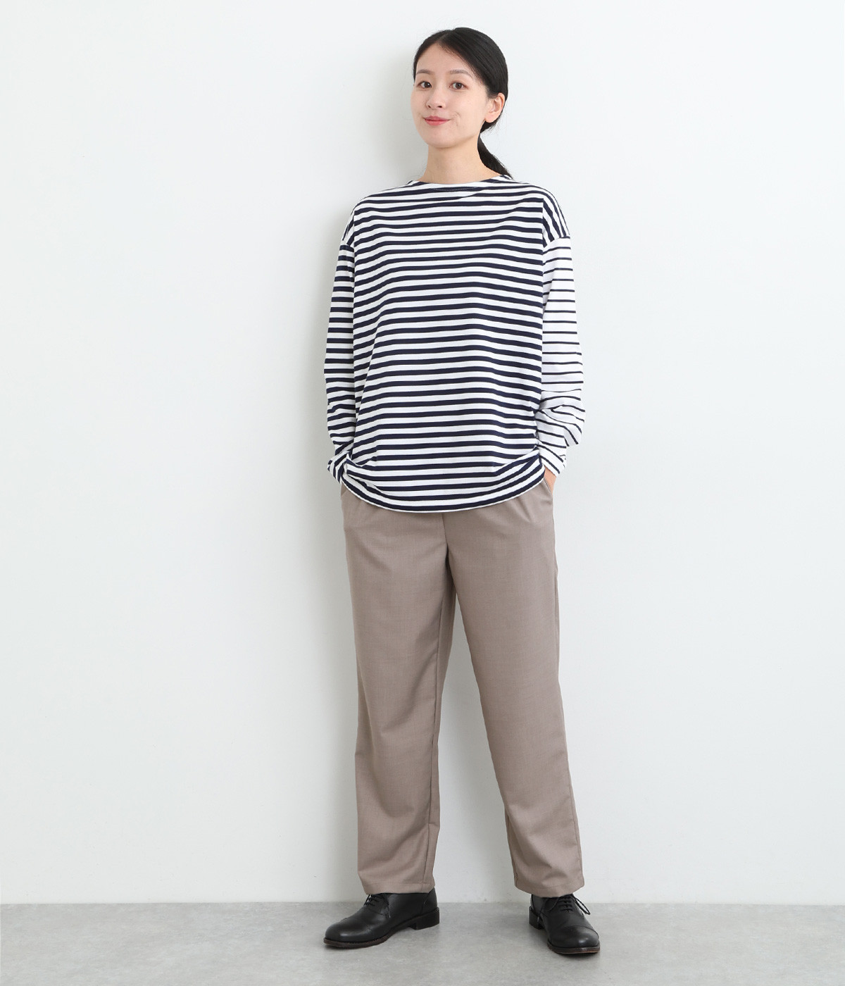 ワンピースやロングブラウスに重ねてもウエスト周りがもたつきにくく、安心感のある股上深めのシルエット