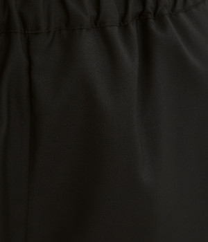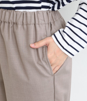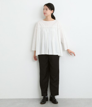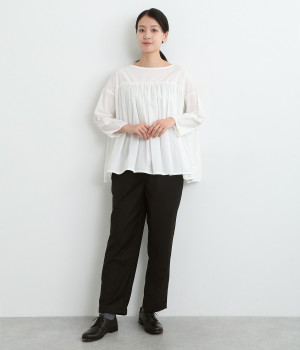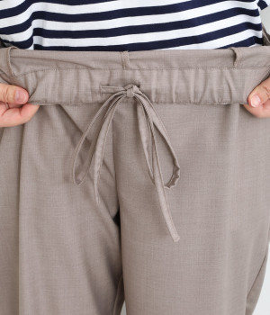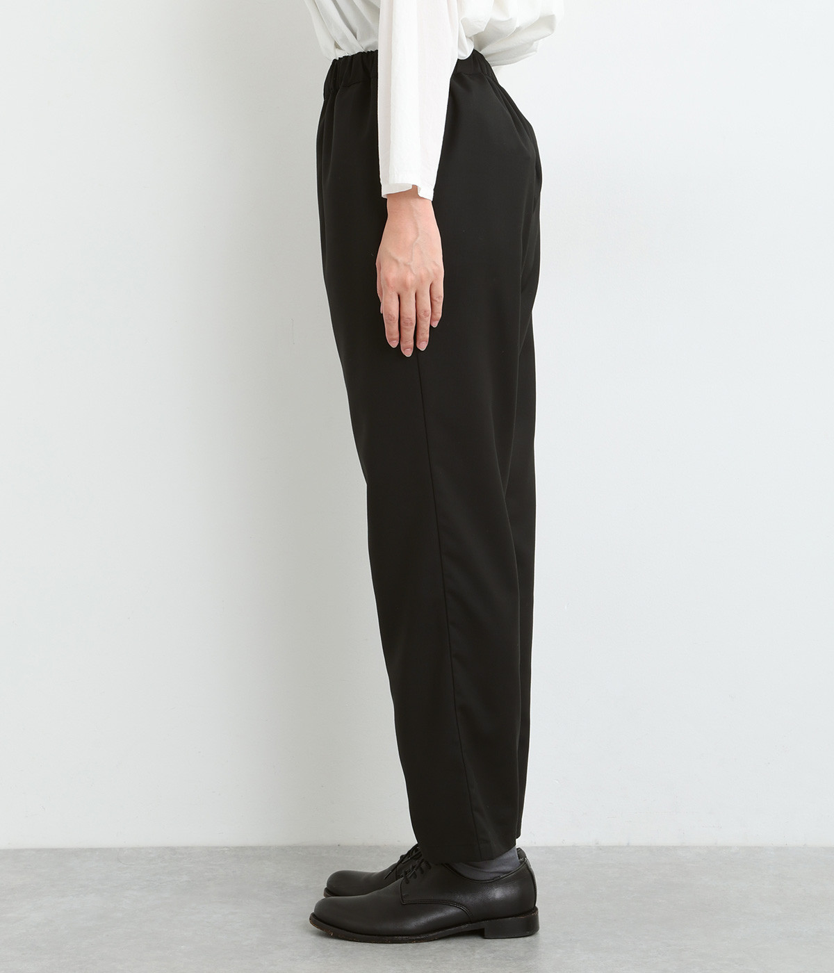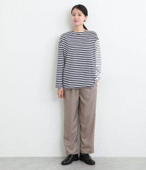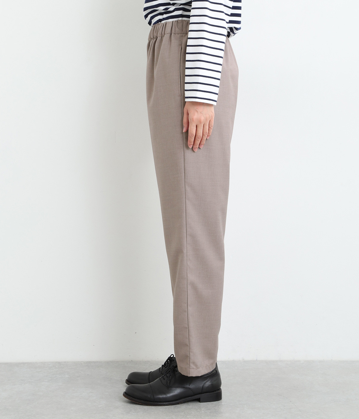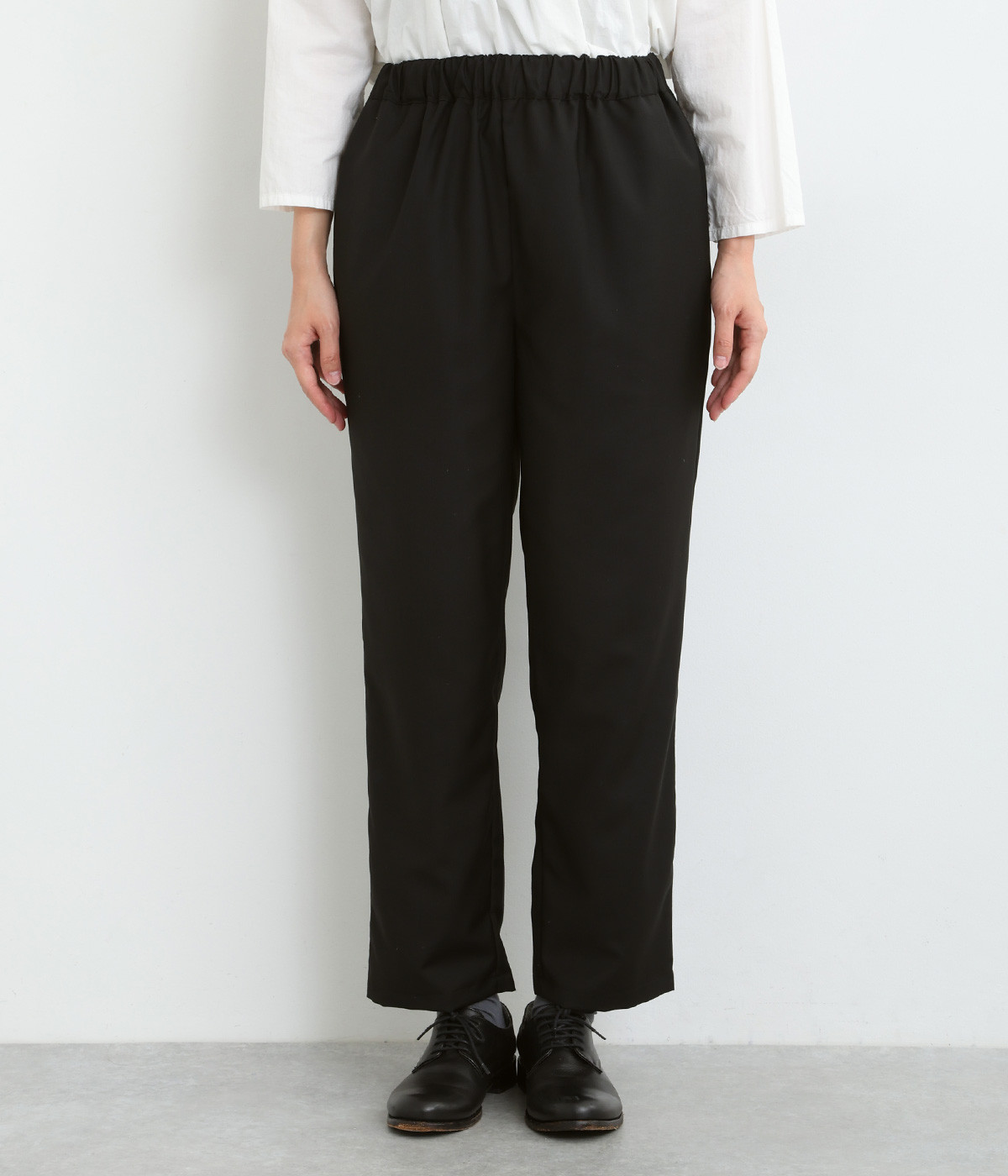 きれいめのパンツながらもウエストは総ゴムで楽な履き心地、内側の紐でフィット感の調整も可能