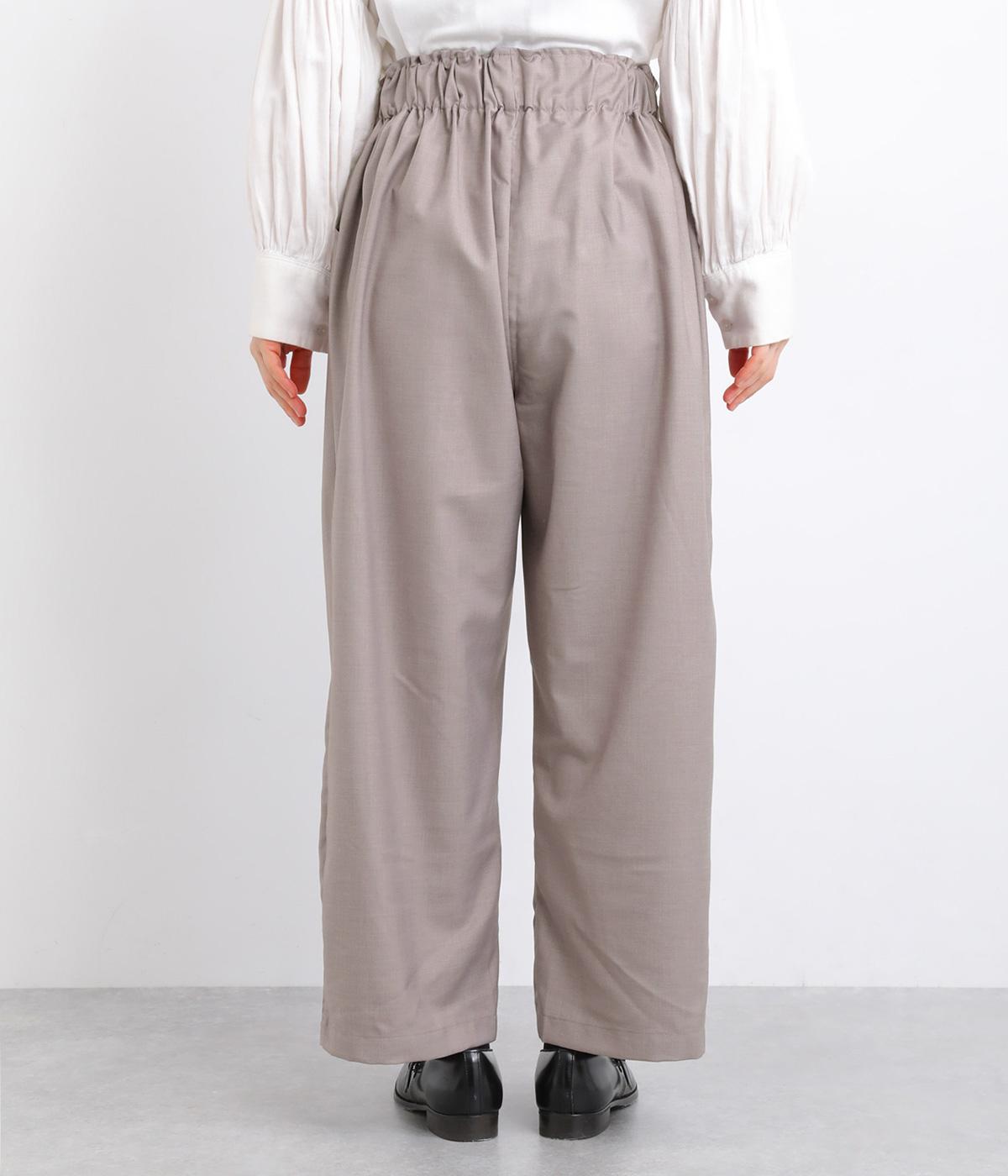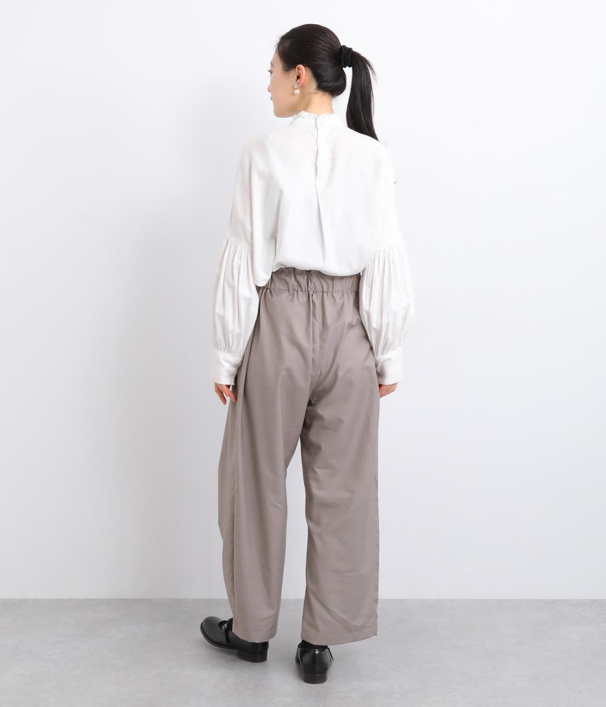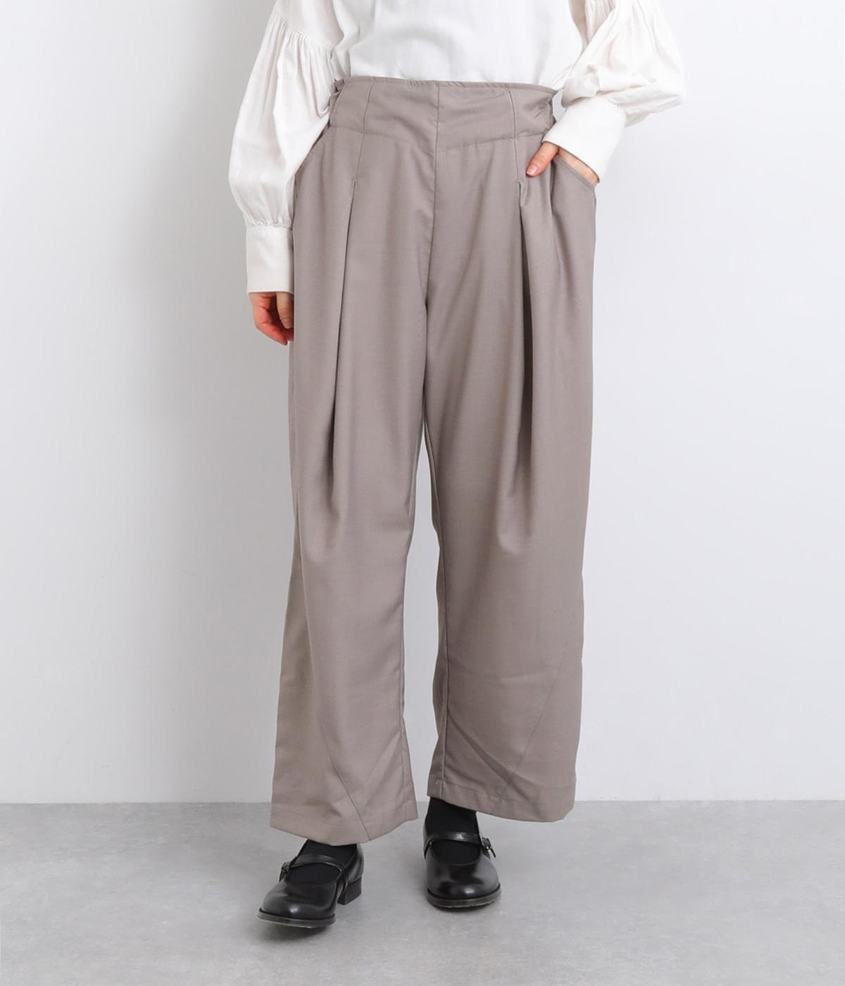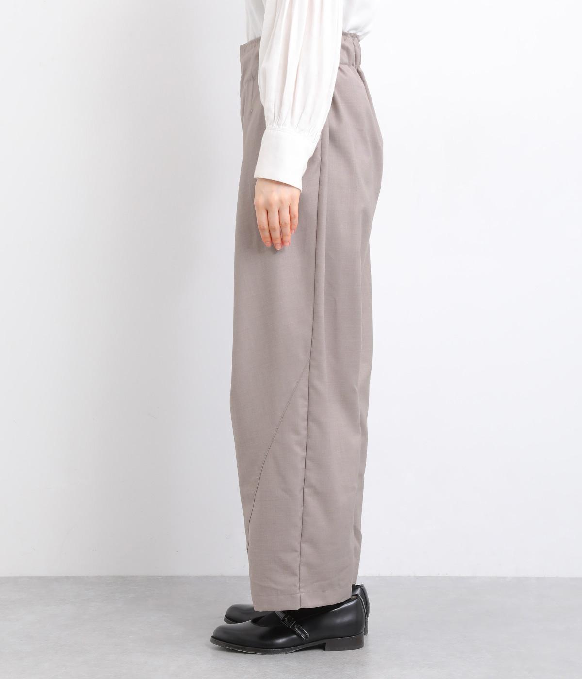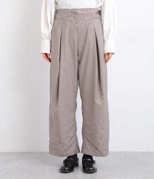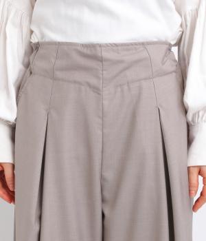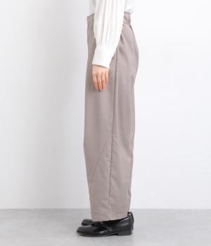 フロントに深めのタックを内包するように寄せ、やわらかなふくらみをつくりました。裾へ向かうななめの切り替えが縦のラインを整え、たっぷりとしたシルエットながらスマートな佇まいに見せてくれます。ウエストは後ろゴムで動きやすく、デイリーにもきれいめな装いにも頼れる一本です。