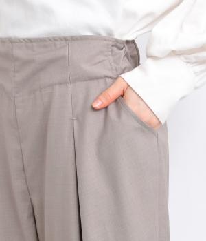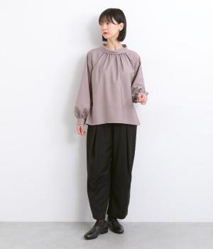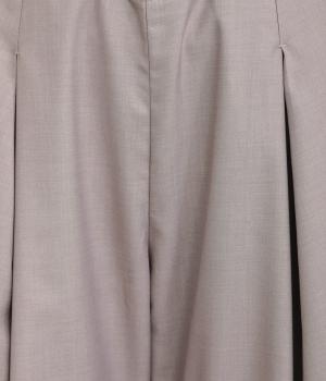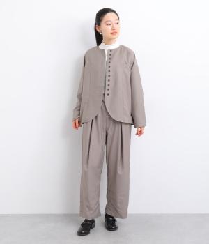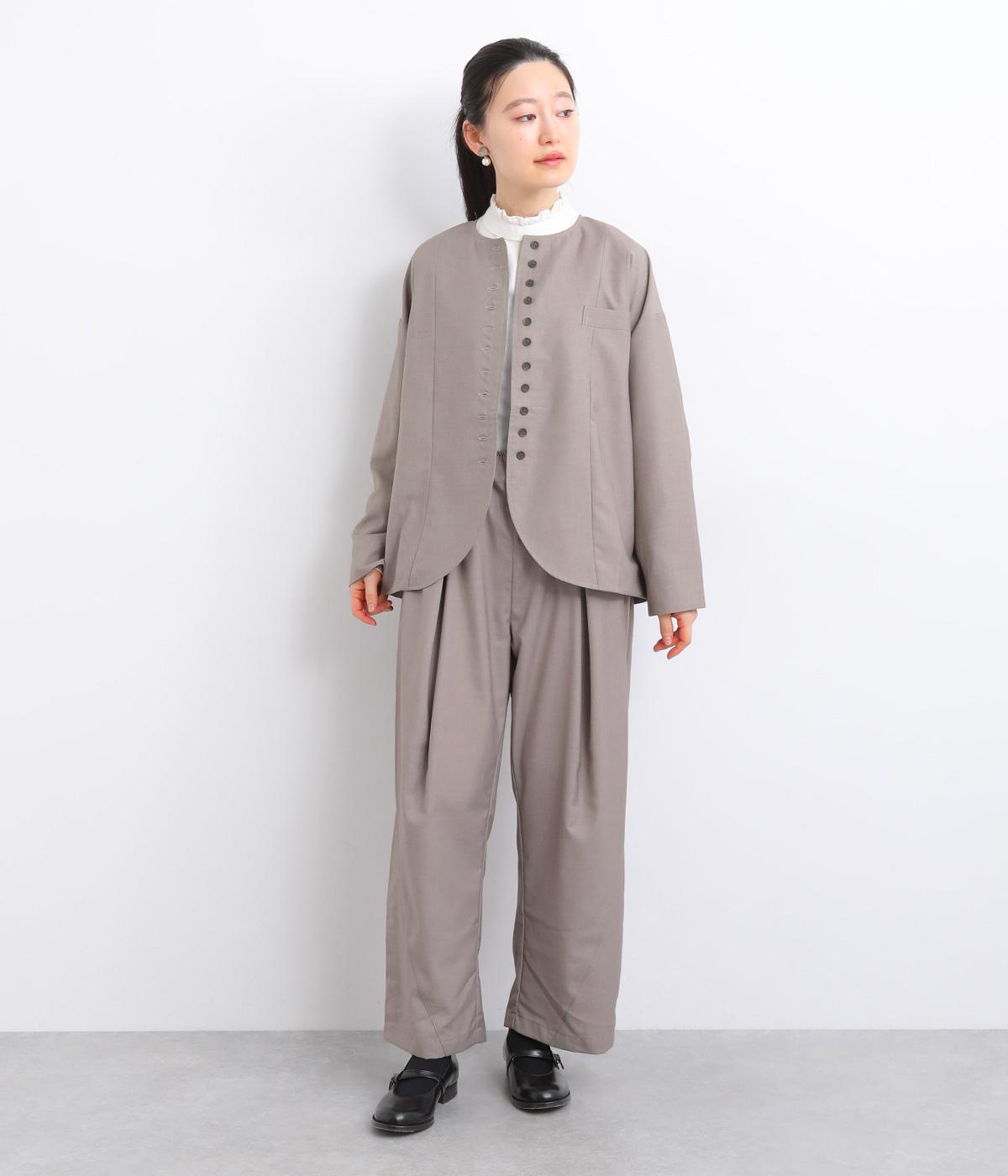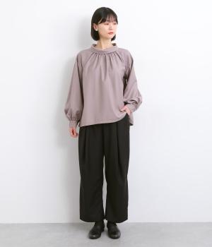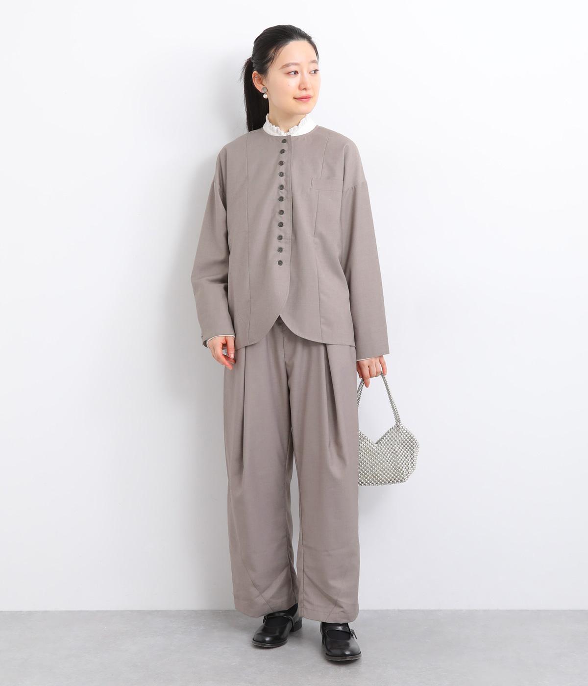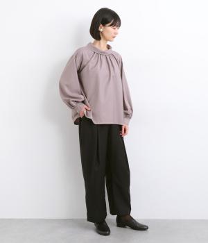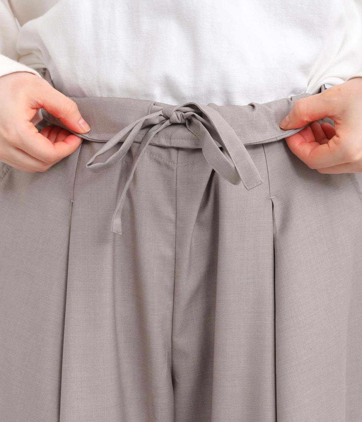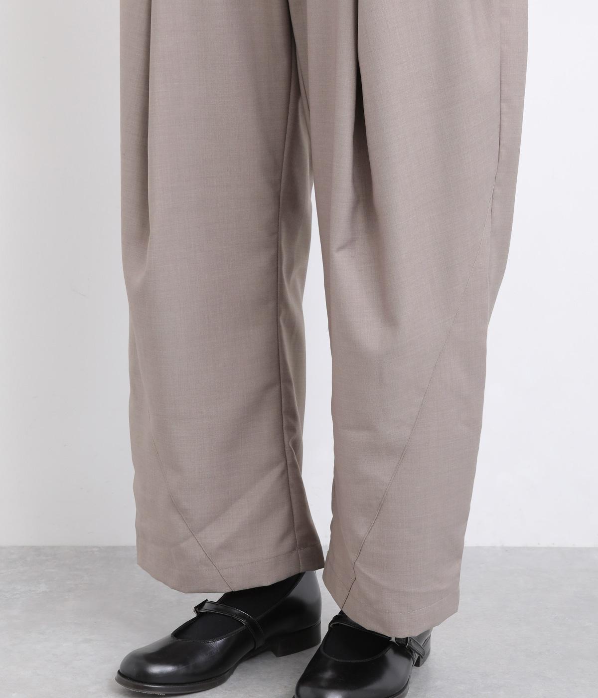 フロントに深めのタックを内包するように寄せ、やわらかなふくらみをつくりました。裾へ向かうななめの切り替えが縦のラインを整え、たっぷりとしたシルエットながらスマートな佇まいに見せてくれます。ウエストは後ろゴムで動きやすく、デイリーにもきれいめな装いにも頼れる一本です。