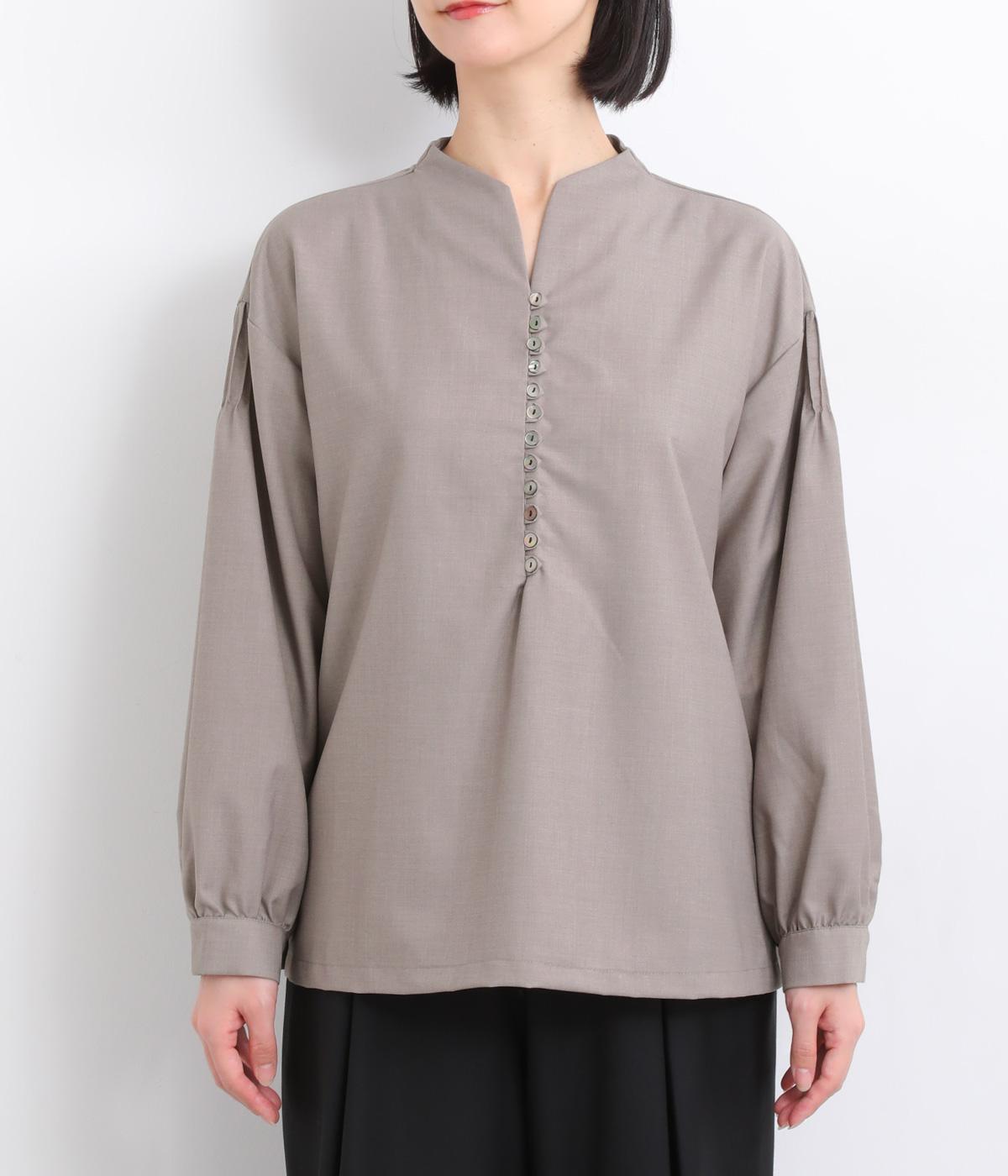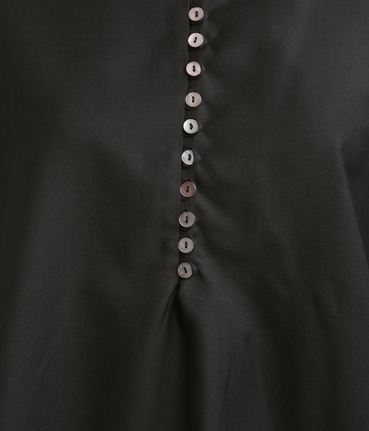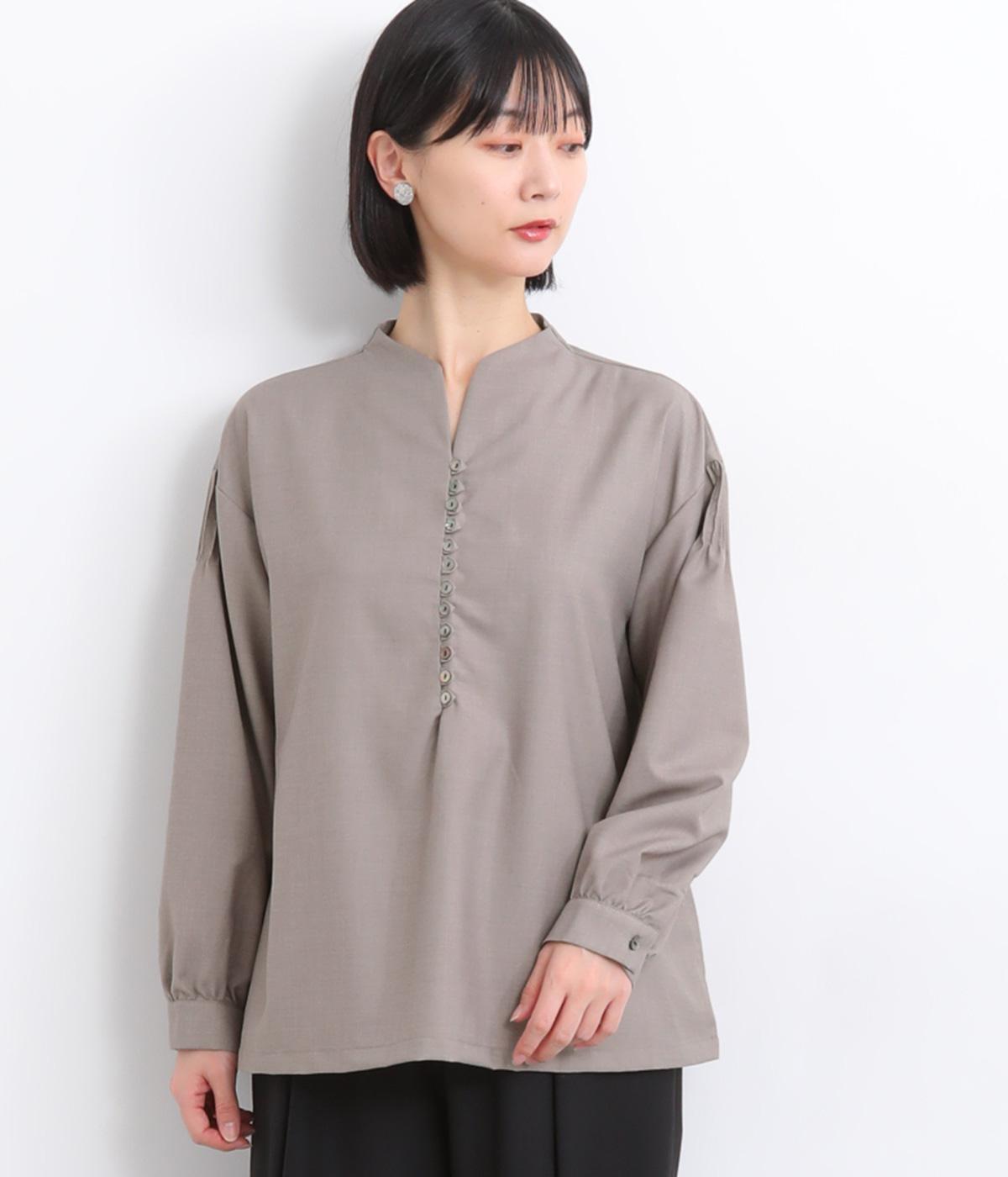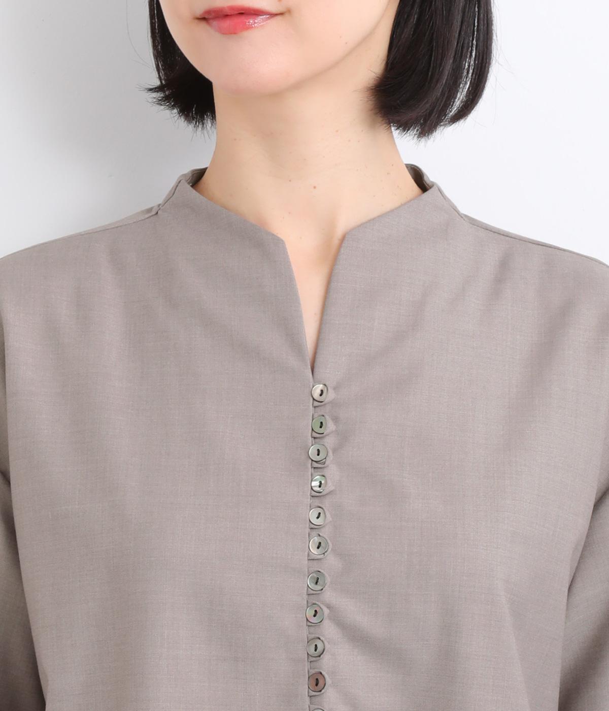 フロントに並んだボタンが、シンプルなシルエットに上品なアクセントを添えるブラウスです。襟はほんのり立ち上がるボトルネックをスキッパー仕立てにすることで、首まわりがすっきり見え、抜け感のある佇まいに。肩の切り替えにさりげなく施したピンタックが、上品な印象をプラスしています。