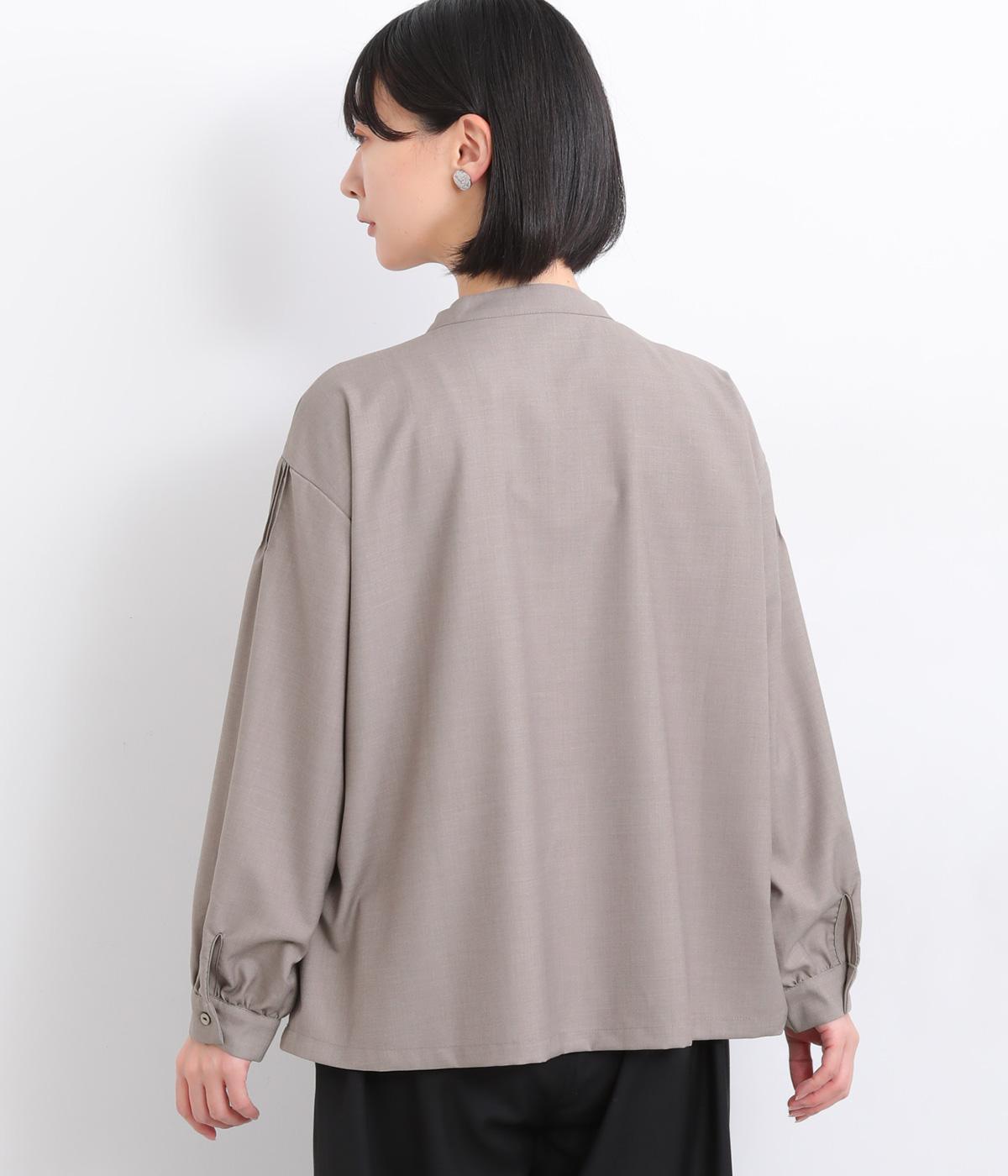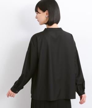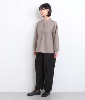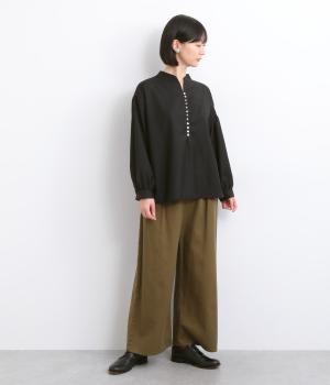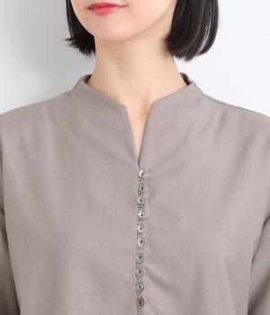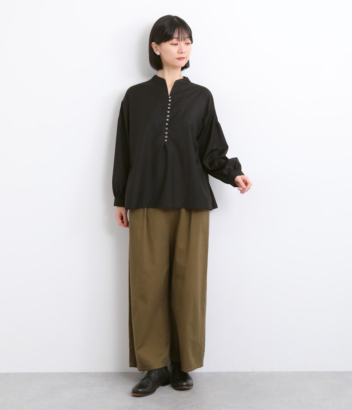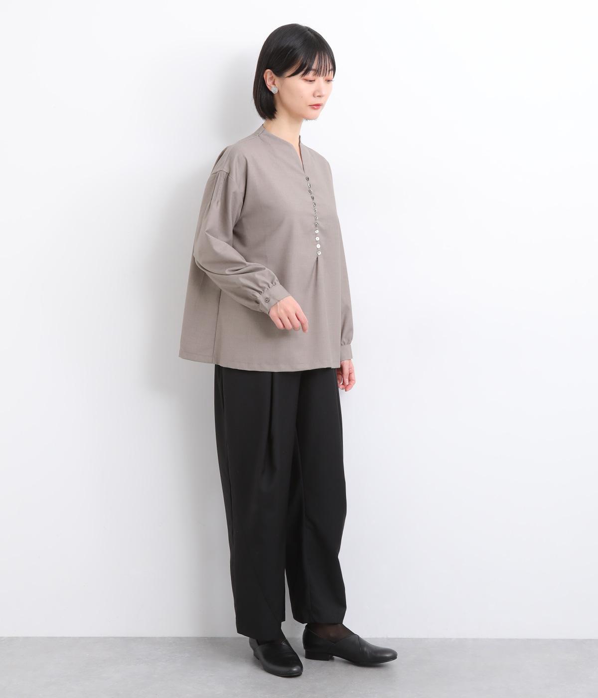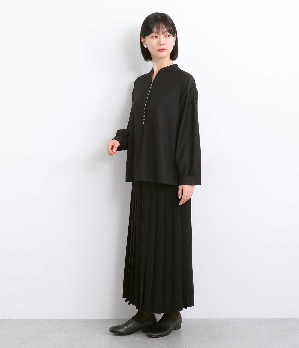 フロントに並んだボタンが、シンプルなシルエットに上品なアクセントを添えるブラウスです。襟はほんのり立ち上がるボトルネックをスキッパー仕立てにすることで、首まわりがすっきり見え、抜け感のある佇まいに。肩の切り替えにさりげなく施したピンタックが、上品な印象をプラスしています。