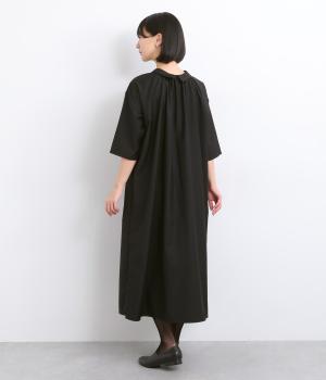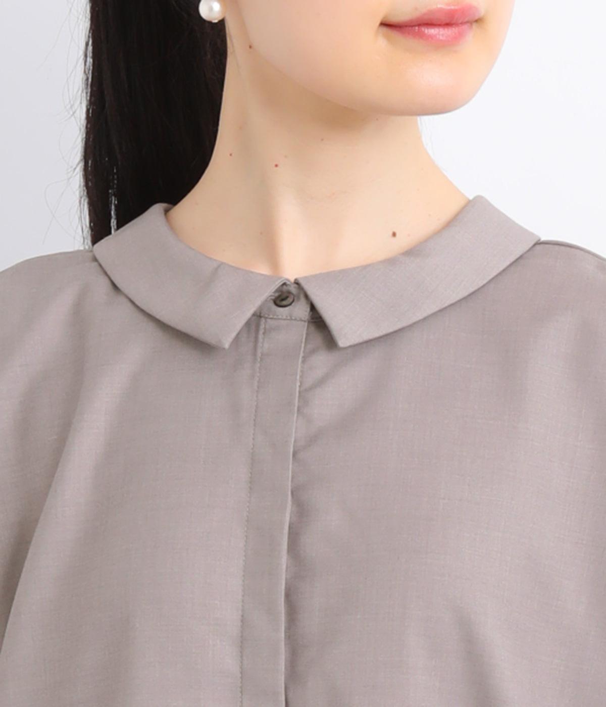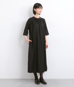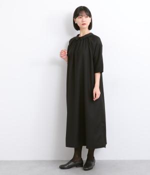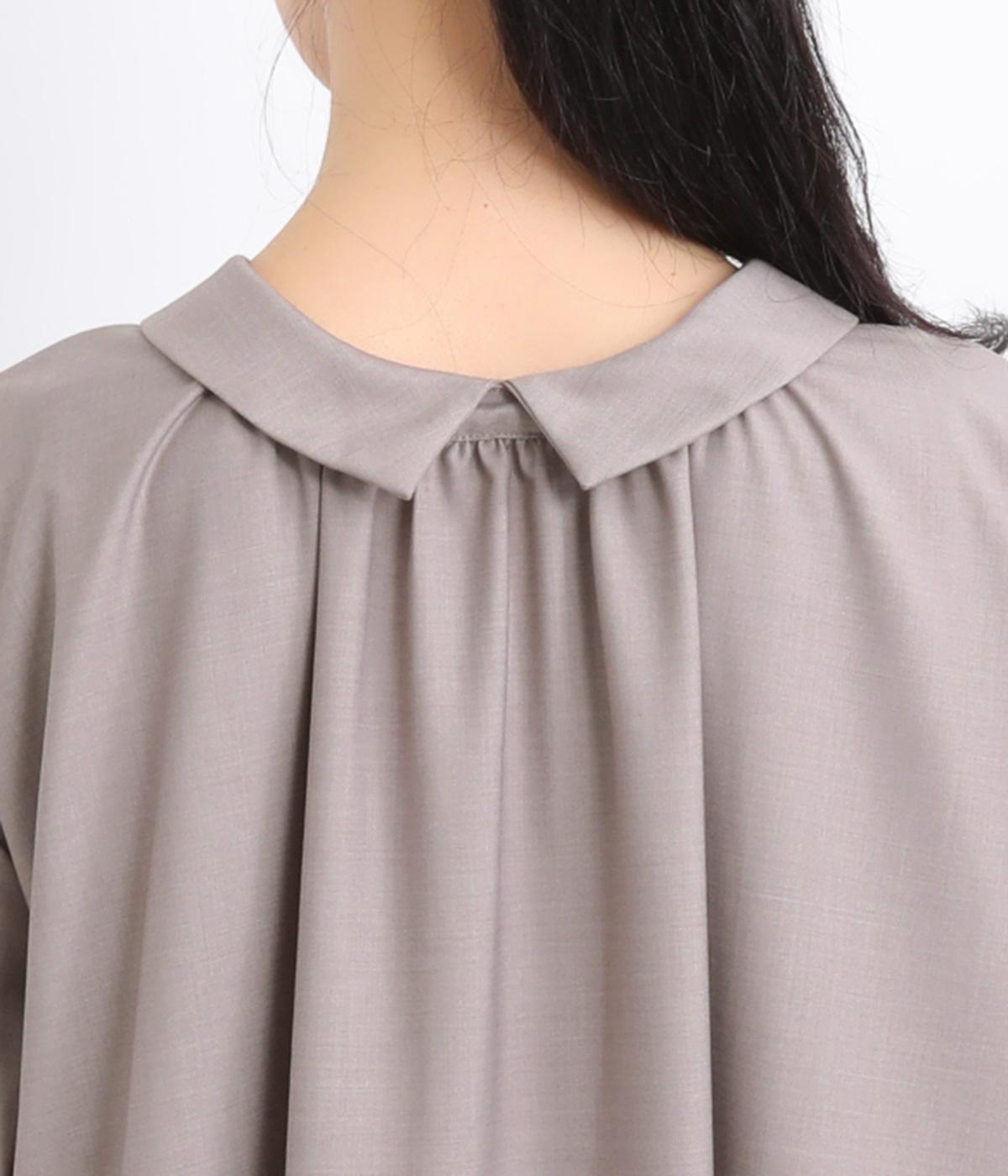 前後で異なる表情がたのしめる2way仕様です。比翼仕立ての面はきちんと感があり、ギャザー面は首元にやわらかな動きが加わりフェミニンな雰囲気に仕上がります。ひじがかくれる五分袖は、季節を通して使えるのもうれしいポイント。体のラインを拾いにくいシルエットで、自然体の美しさを引き出します。