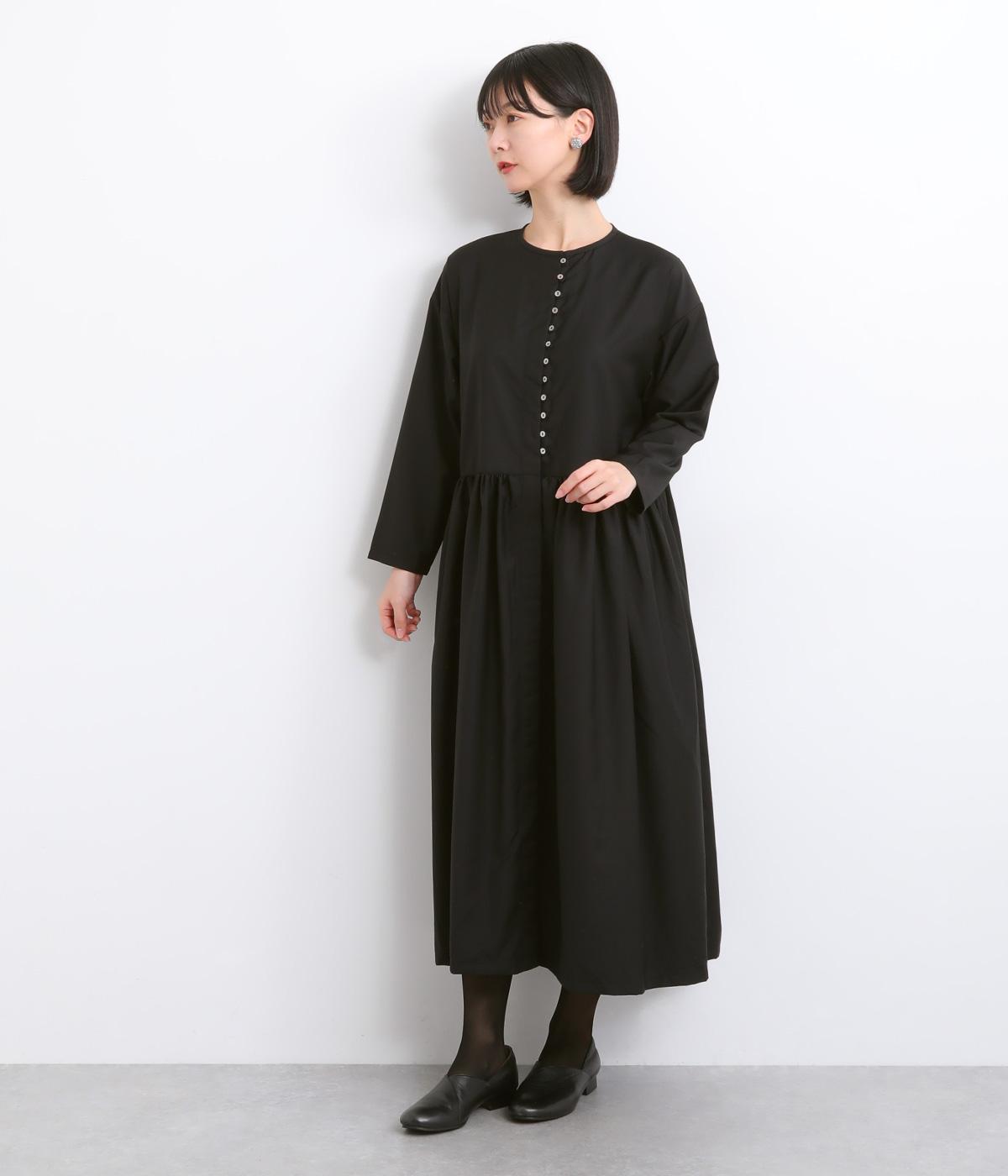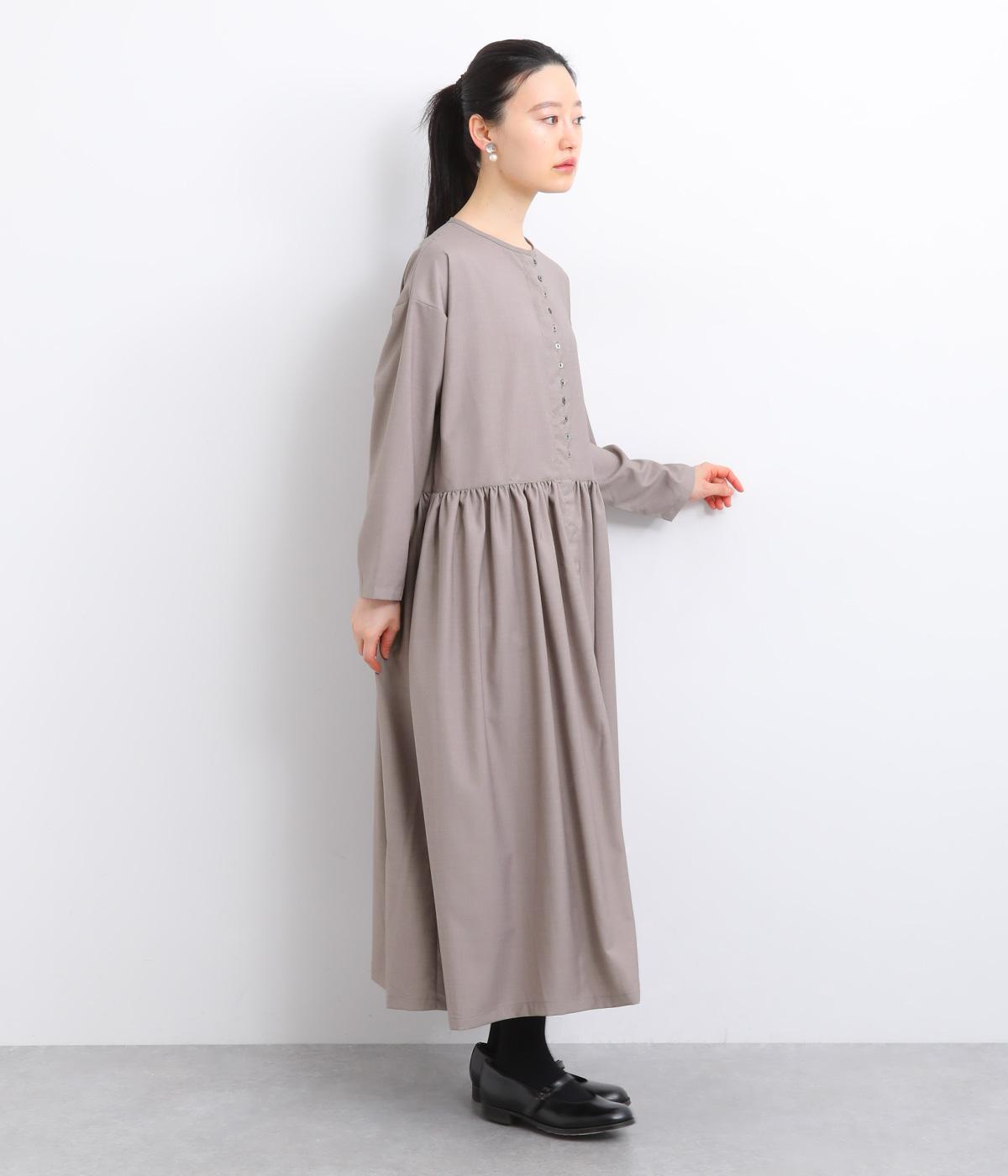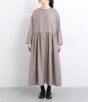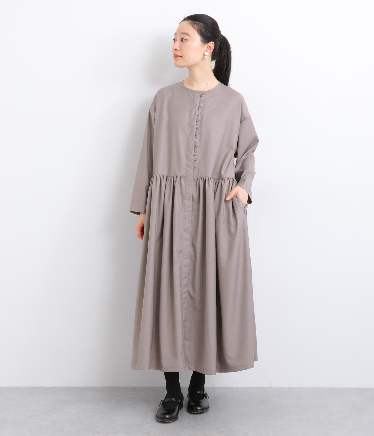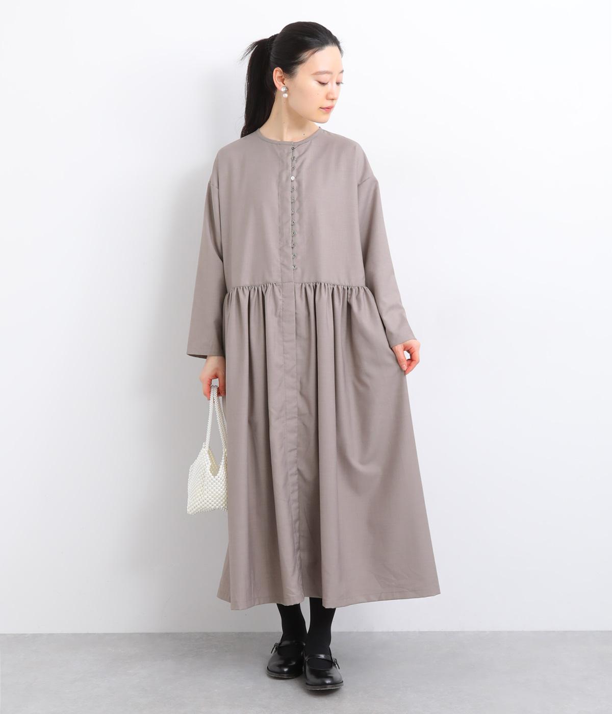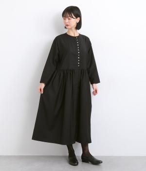 前あき仕様に細かなボタンをずらりと並べ、クラシックな雰囲気にまとめました。ウエストから入れたギャザーがほどよいボリューム感を生み、立体的でやさしい印象に。甘すぎないシルエットで、デイリーにもお出かけにも活躍する着まわしに便利なデザインです。