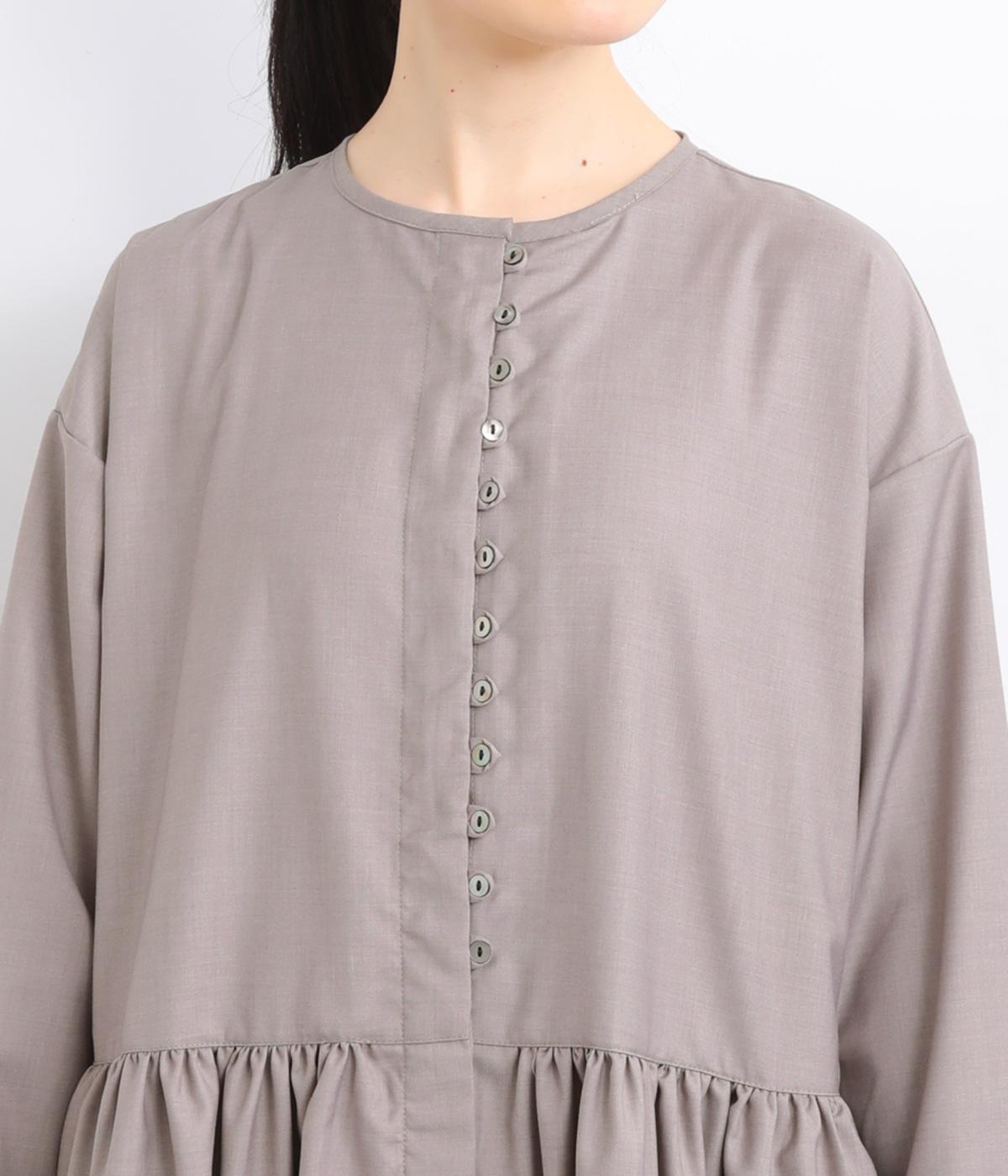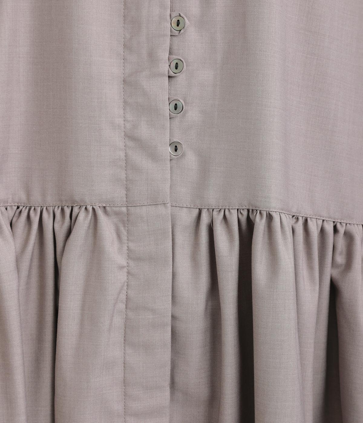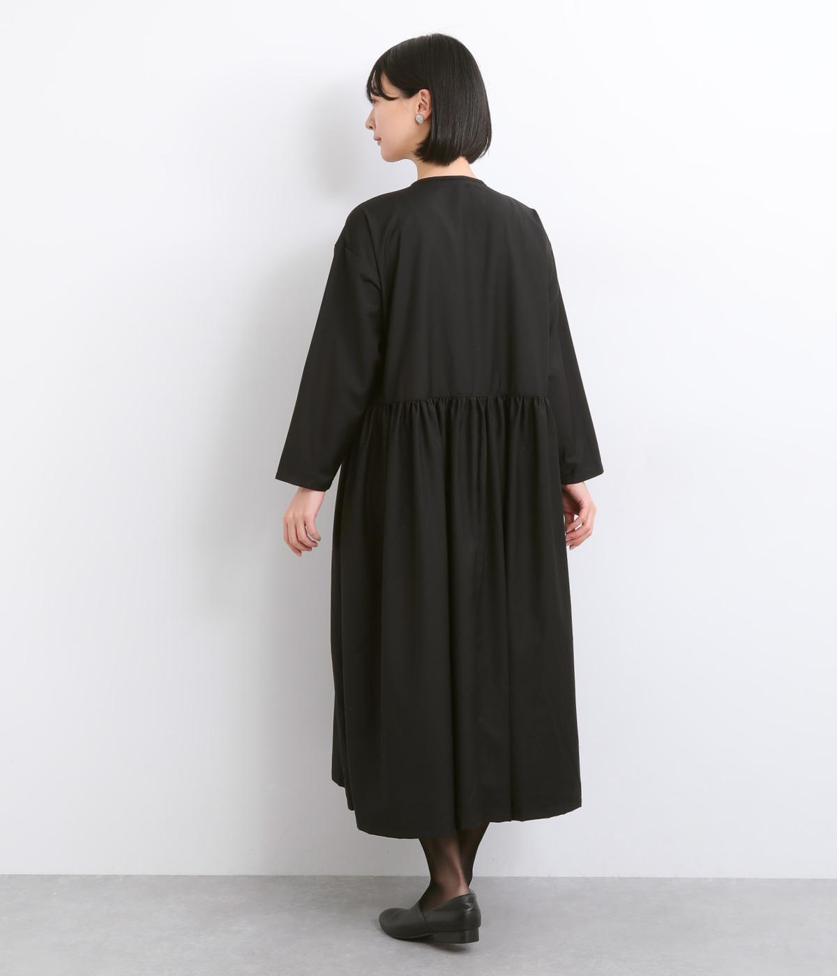 前あき仕様に細かなボタンをずらりと並べ、クラシックな雰囲気にまとめました。ウエストから入れたギャザーがほどよいボリューム感を生み、立体的でやさしい印象に。甘すぎないシルエットで、デイリーにもお出かけにも活躍する着まわしに便利なデザインです。
