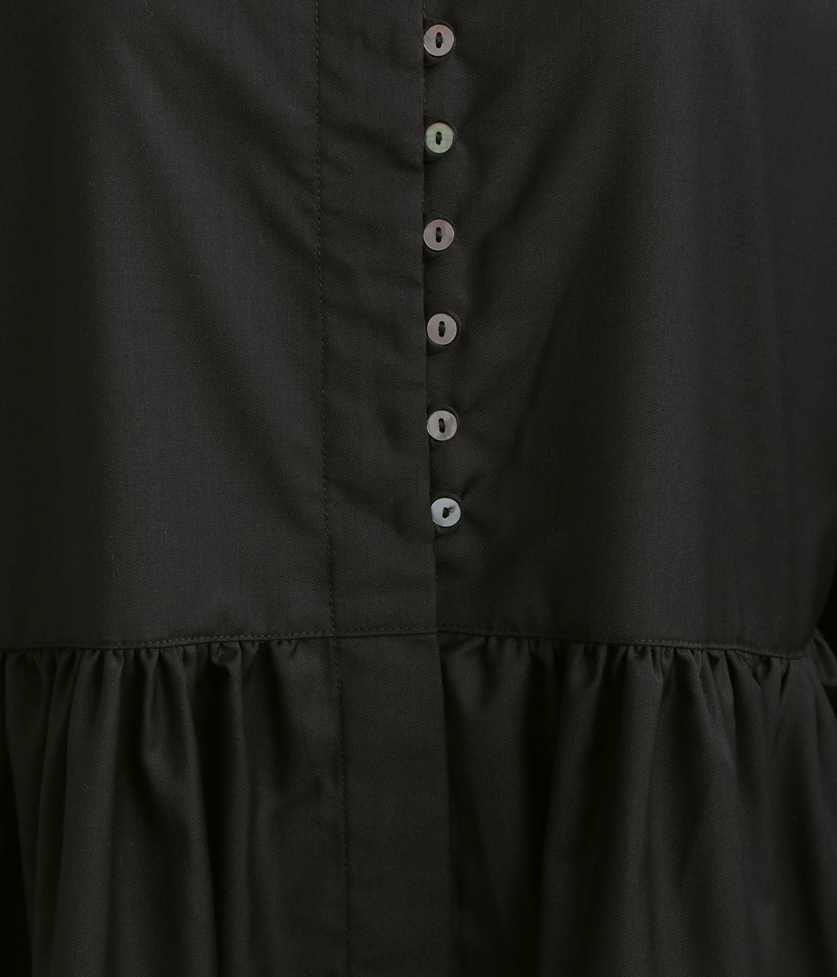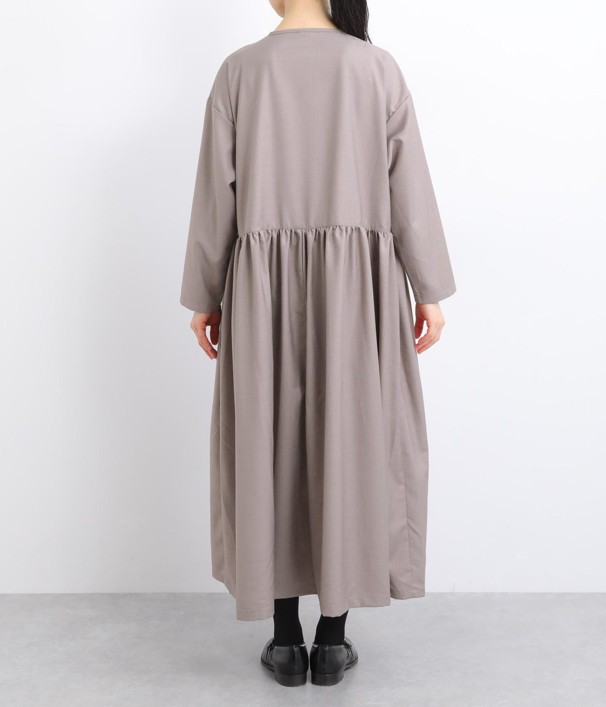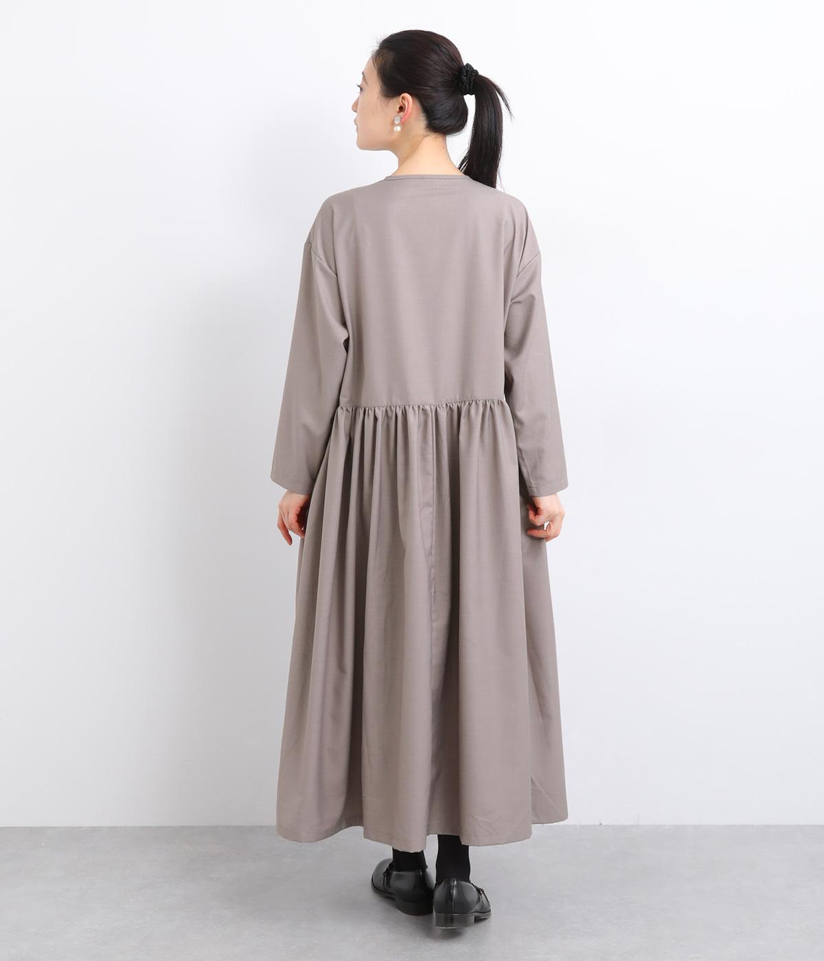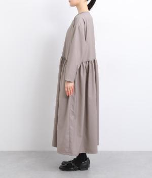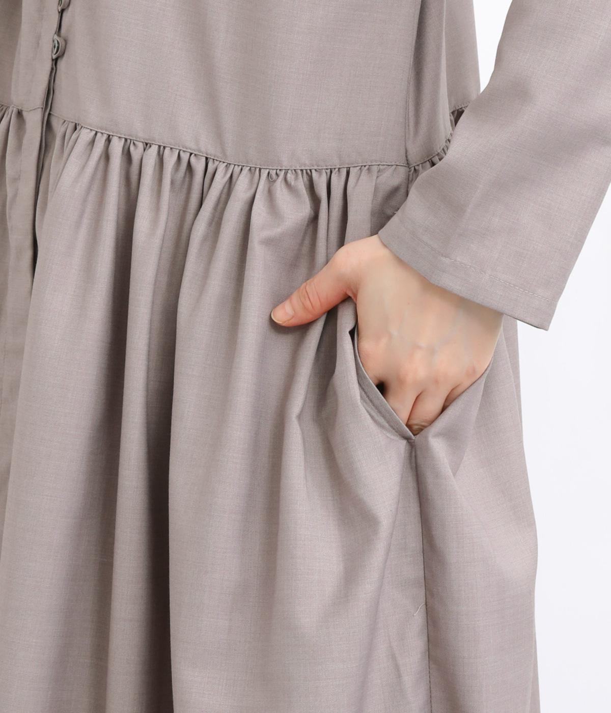 前あき仕様に細かなボタンをずらりと並べ、クラシックな雰囲気にまとめました。ウエストから入れたギャザーがほどよいボリューム感を生み、立体的でやさしい印象に。甘すぎないシルエットで、デイリーにもお出かけにも活躍する着まわしに便利なデザインです。