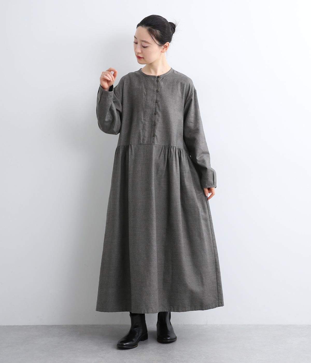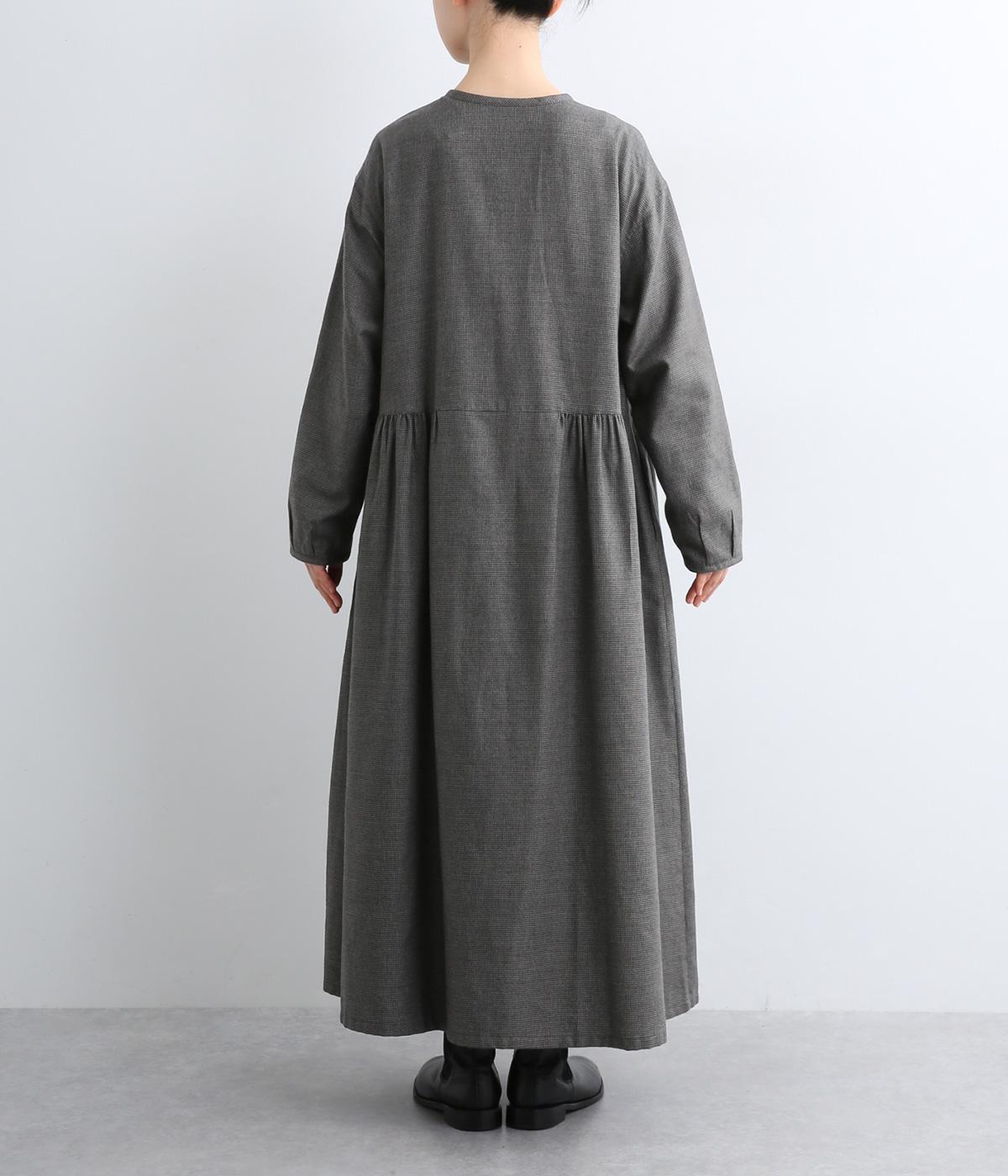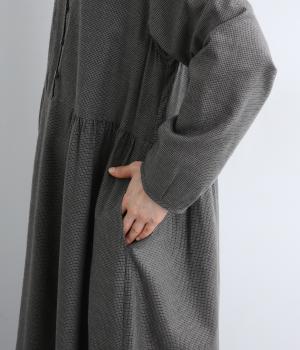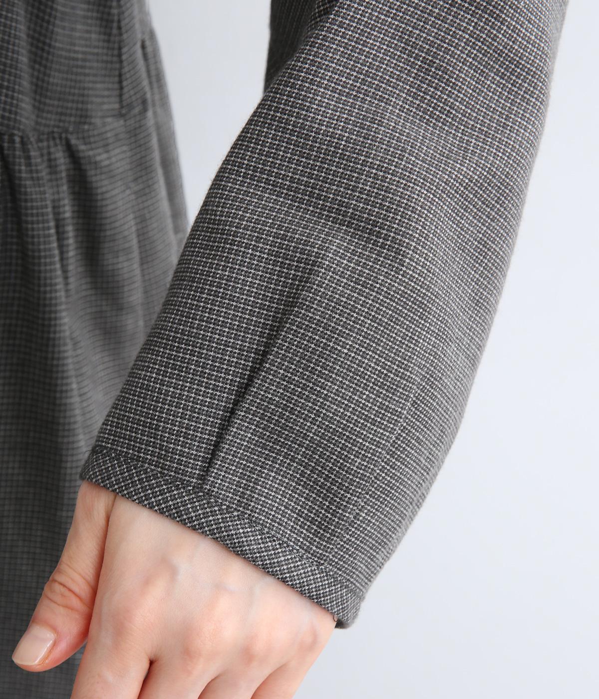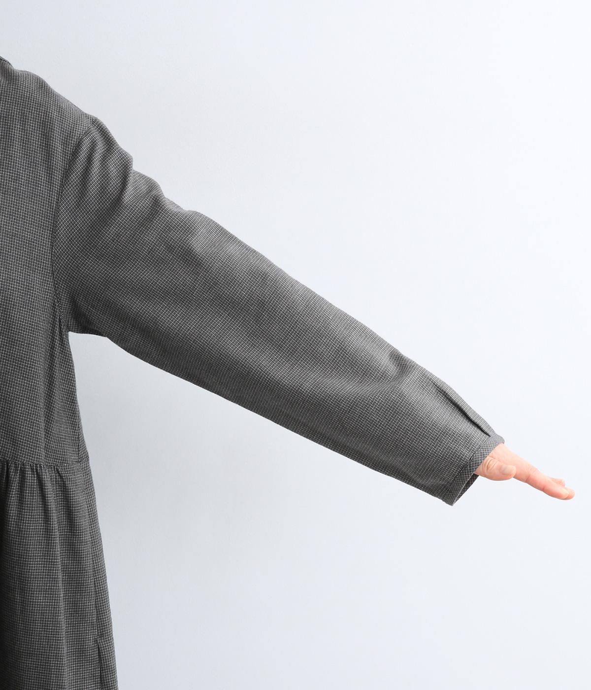 ウエスト位置に切り替えを入れ両サイドにギャザーを施して、ふんわりとしたボリュームを出したワンピース。小さなループボタンを並べたフロントのデザインと控えめなチェック柄が、大人らしい上品なムードを運んでくれます。袖口にタックを入れてすっきりとさせた袖のシルエットもポイントです。