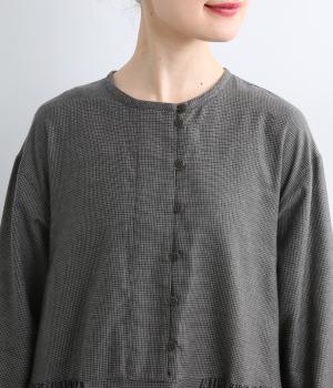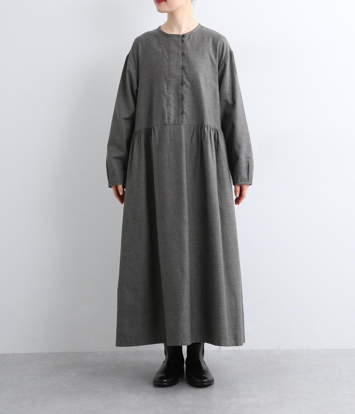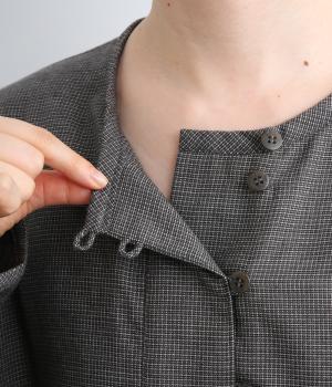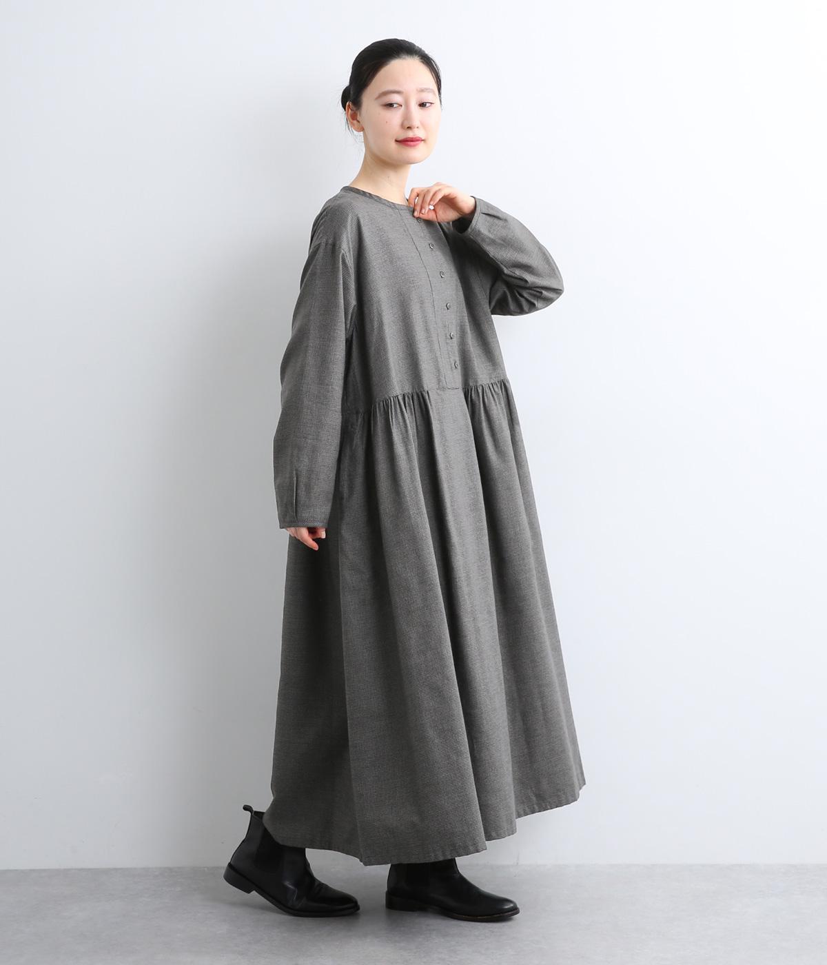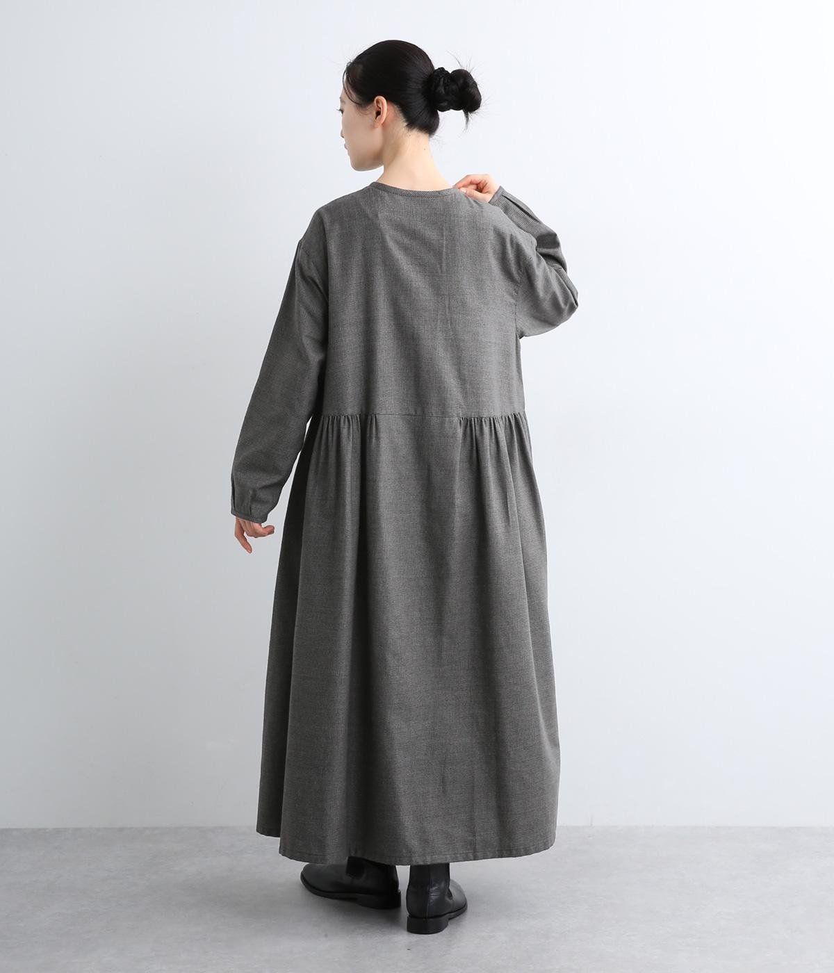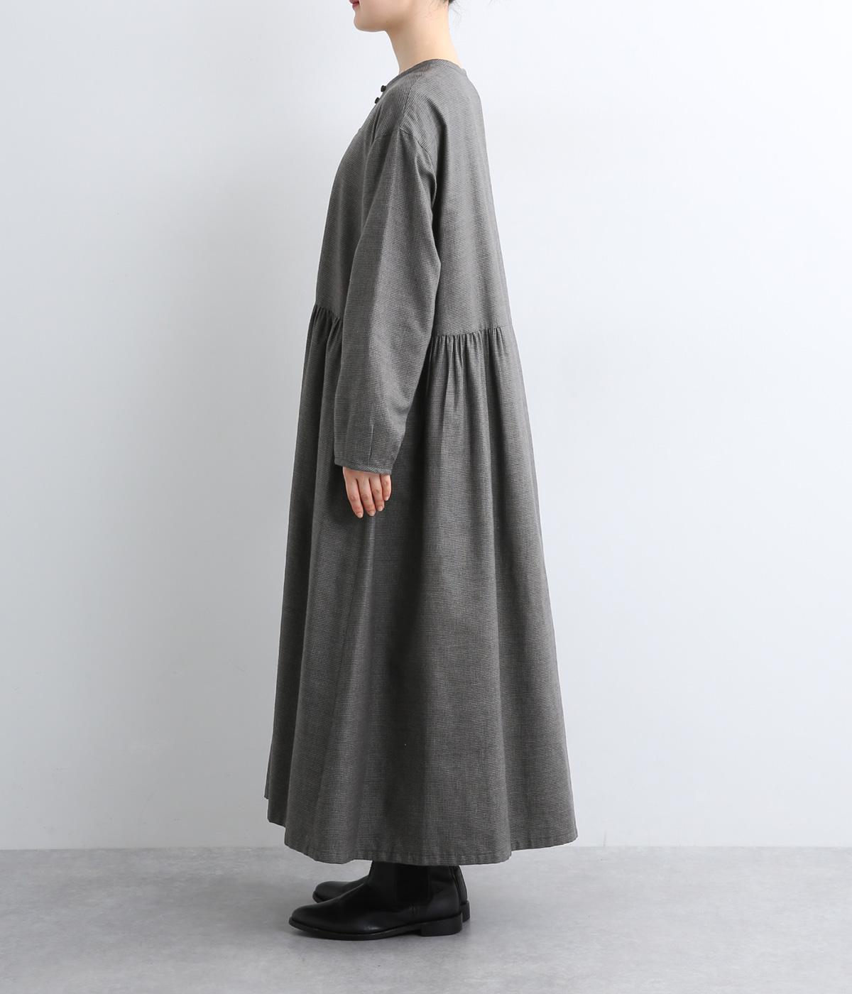 ウエスト位置に切り替えを入れ両サイドにギャザーを施して、ふんわりとしたボリュームを出したワンピース。小さなループボタンを並べたフロントのデザインと控えめなチェック柄が、大人らしい上品なムードを運んでくれます。袖口にタックを入れてすっきりとさせた袖のシルエットもポイントです。