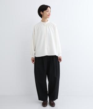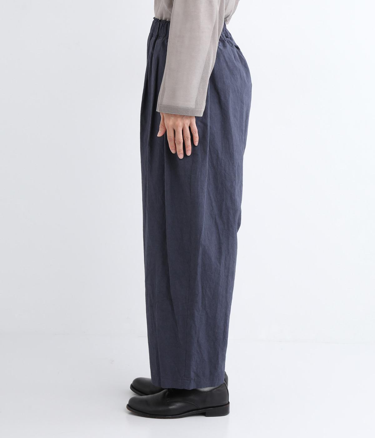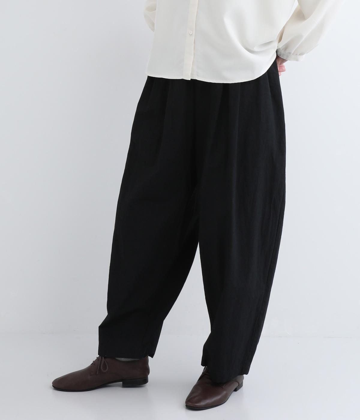 ウエストにタックをとり股上深めのゆったりとしたシルエットに仕上げたテーパードパンツ。裾に向かってきゅっと細くし、全体のバランスをすっきりと整えています。とても軽い生地感が足さばきのよさをアップ。ウエストはお腹まわりにやさしくフィットする総ゴム仕様です。