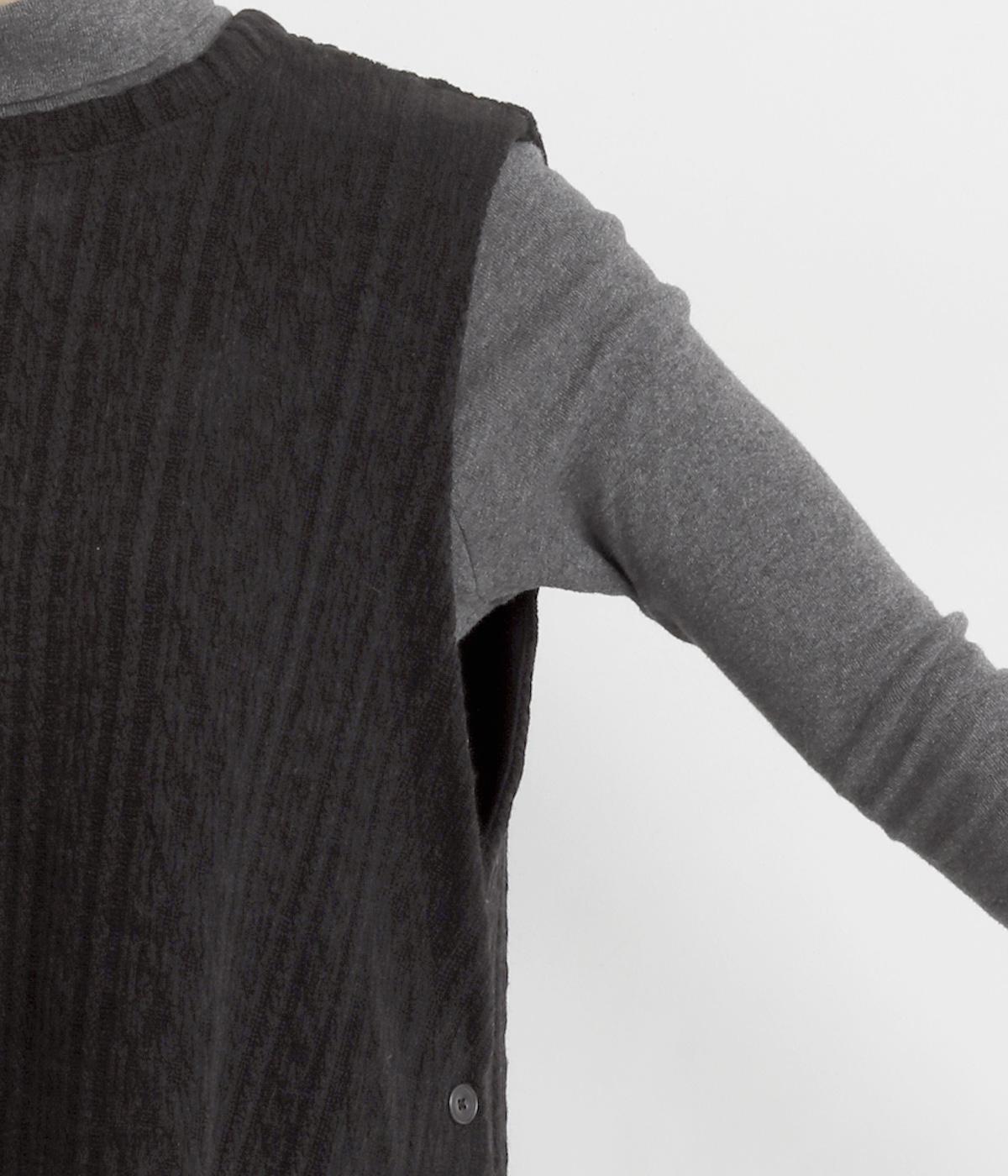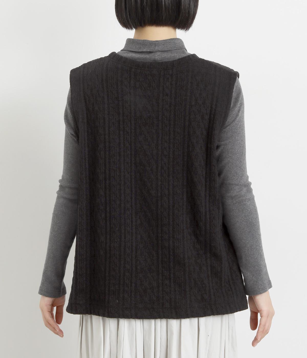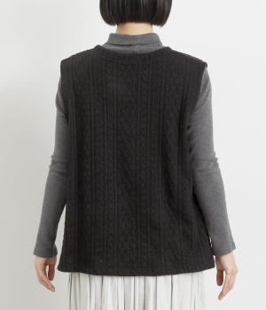 サイドにボタンをあしらい、スタイリングに合わせてあけ閉めできるベストです。ケーブル柄編みでさり気なく表情をつけつつ、アイテム合わせしやすいデザインに。アームホールも広く、ボリュームトップスとも好相性。