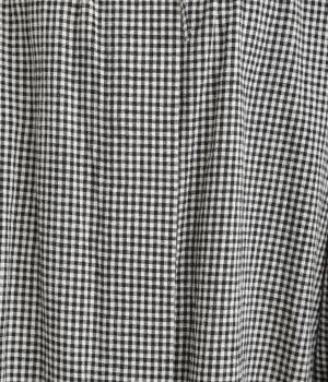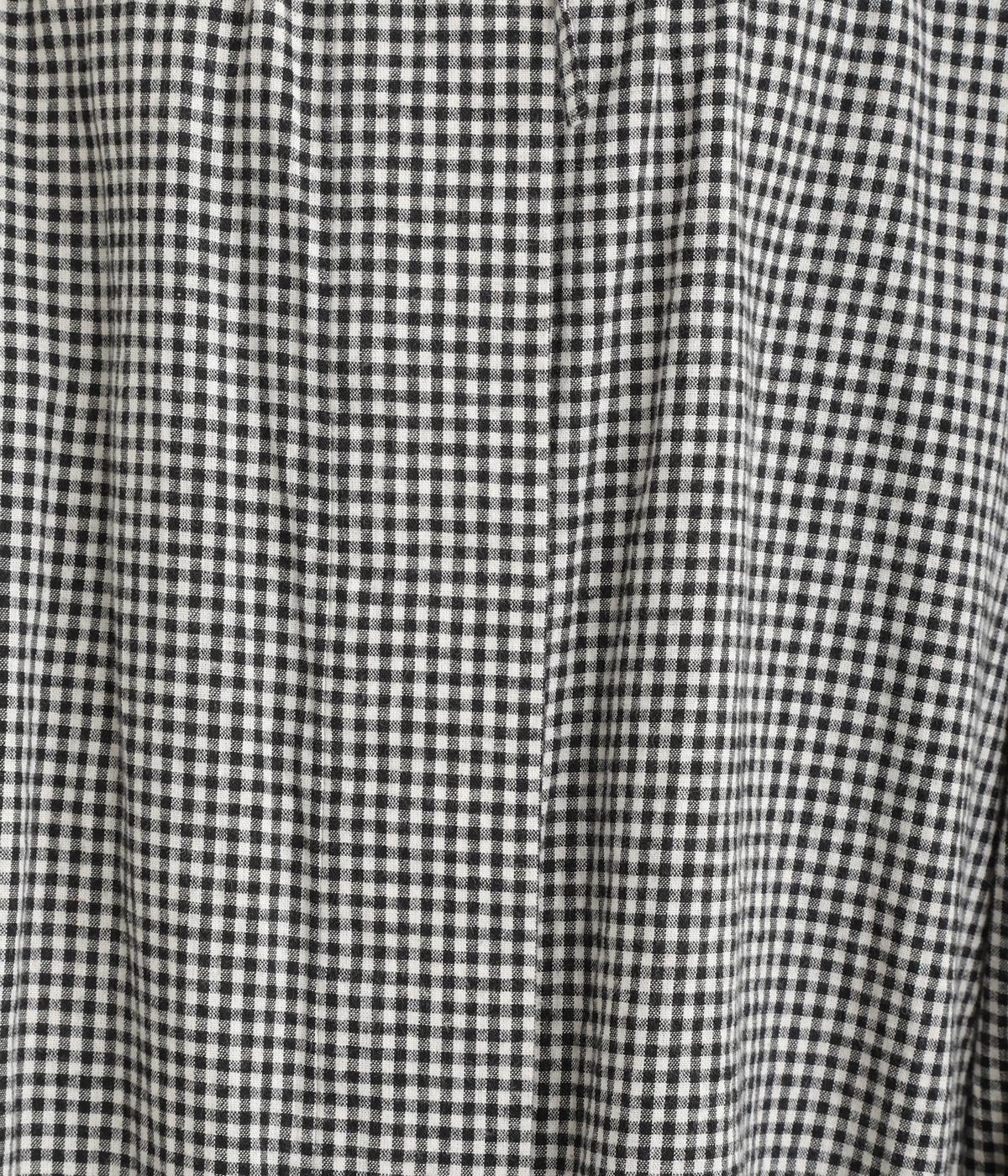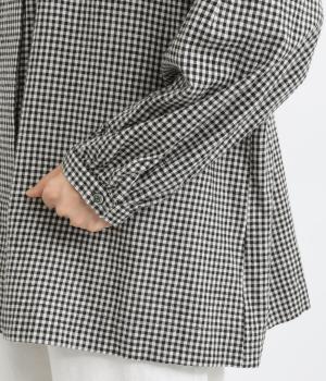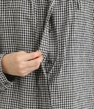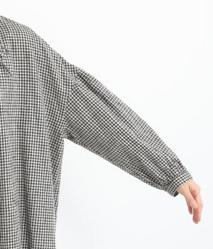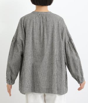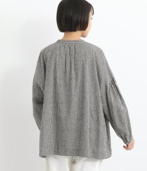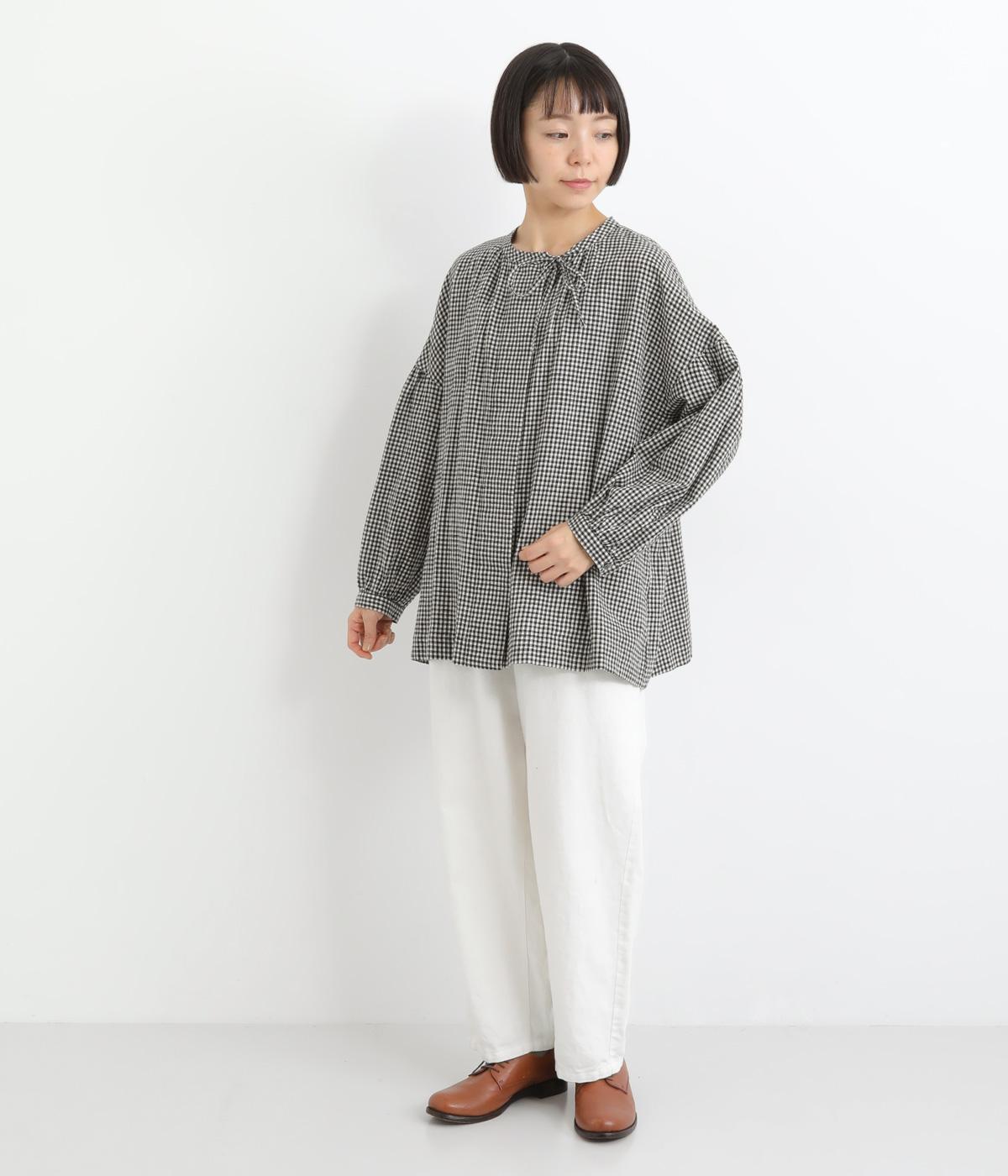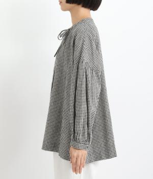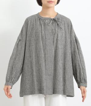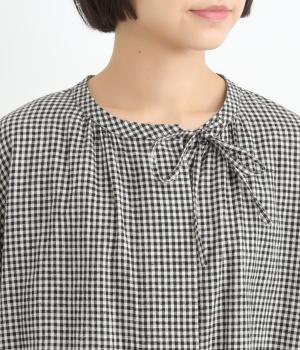 比翼仕立てですっきりまとめたブラウスは、襟ぐりのリボンでさり気なく大人かわいいエッセンスを追加。スモッグ風のゆったりとしたシルエットに細かなギンガムチェック柄で、ナチュラルスタイルのポイントになる一枚。ふっくらとした袖も雰囲気◎です。