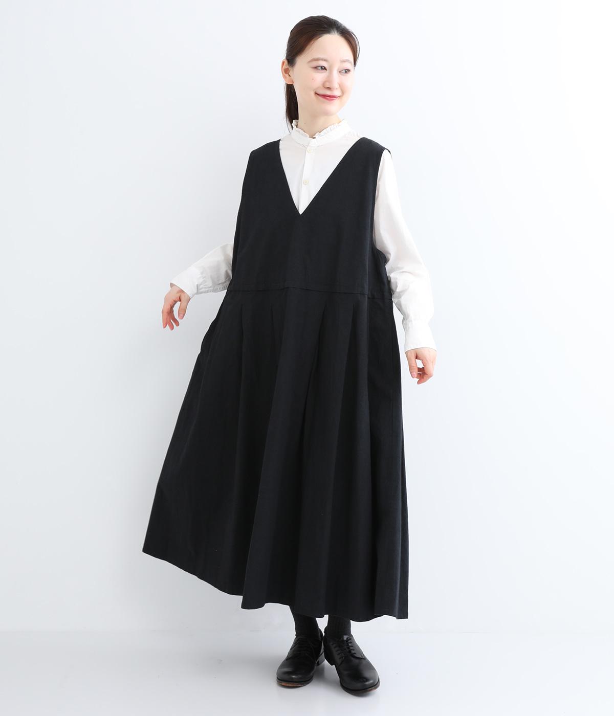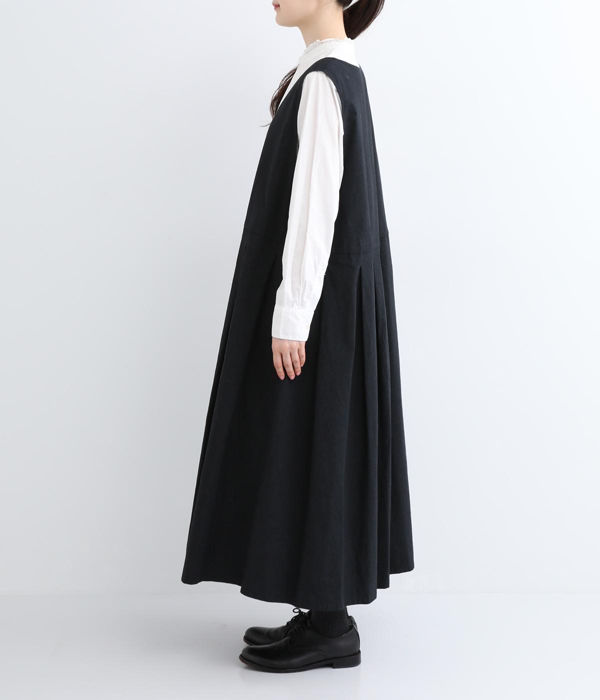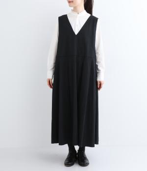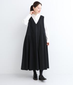 ウエスト切り替え位置にタックをほどこし、ふわりとしたシルエットがフェミニンなジャンパースカート。深めのVネックと広めに開けたアームホールが着脱のしやすさをアップさせます。スタイリング次第でカジュアルにもきれいめにも着こなせ、シーズンレスにたのしめる一着です。