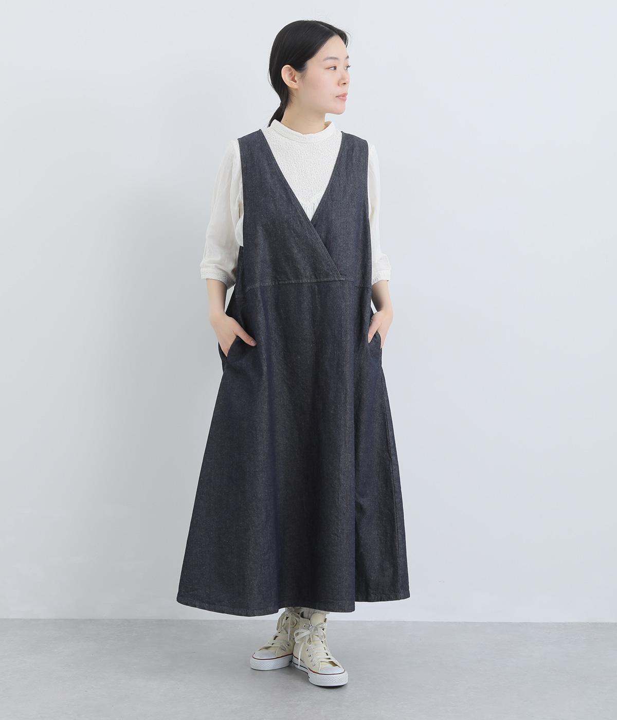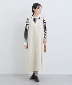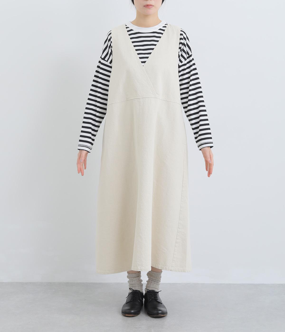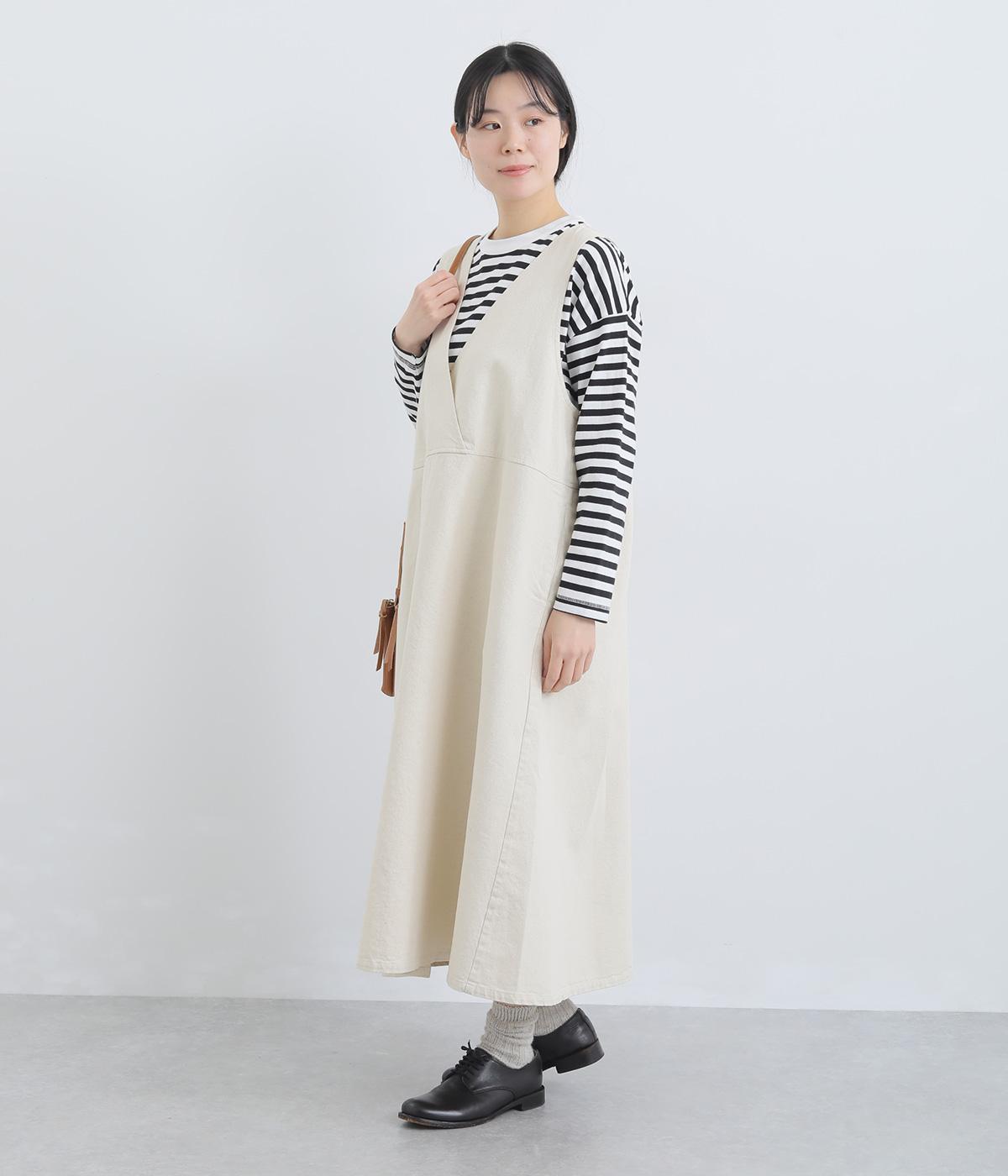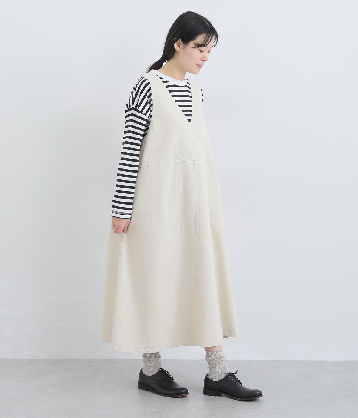 カシュクールのように重ねたVネックがほんのり大人顔な一枚。窮屈さのないフレアシルエットは広がりすぎずすとんと落ち、アンクルの見える着丈で適度な抜け感も意識しました。ゆったりしたアームホールでトップスも合わせやすく着まわし力も◎。
