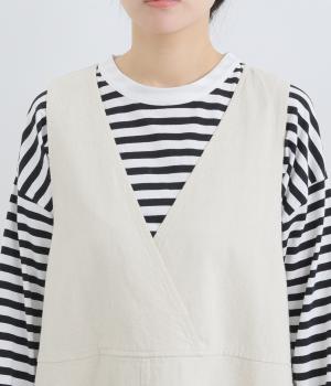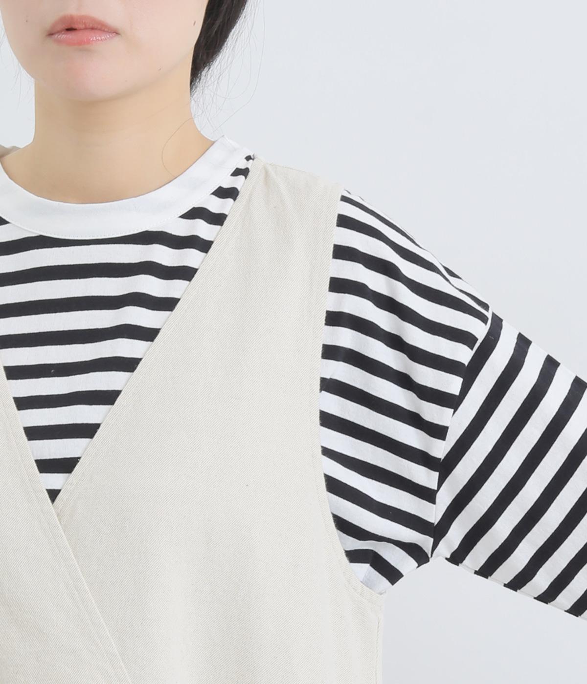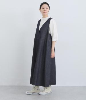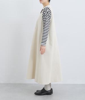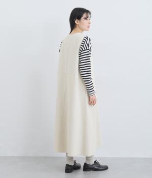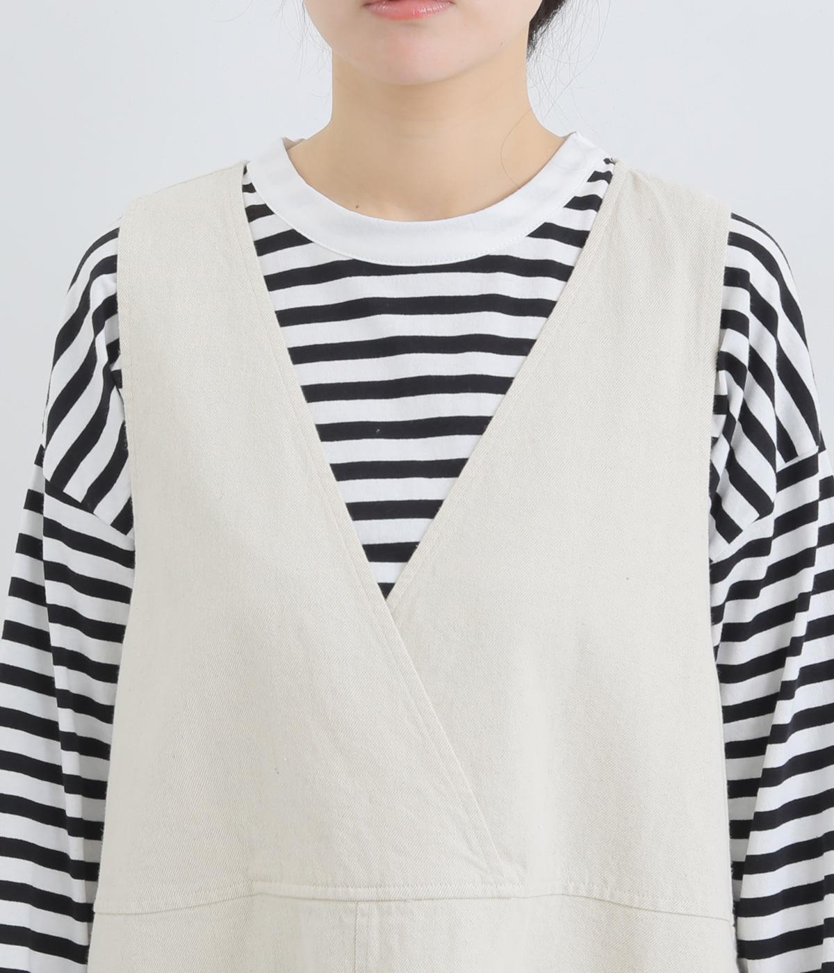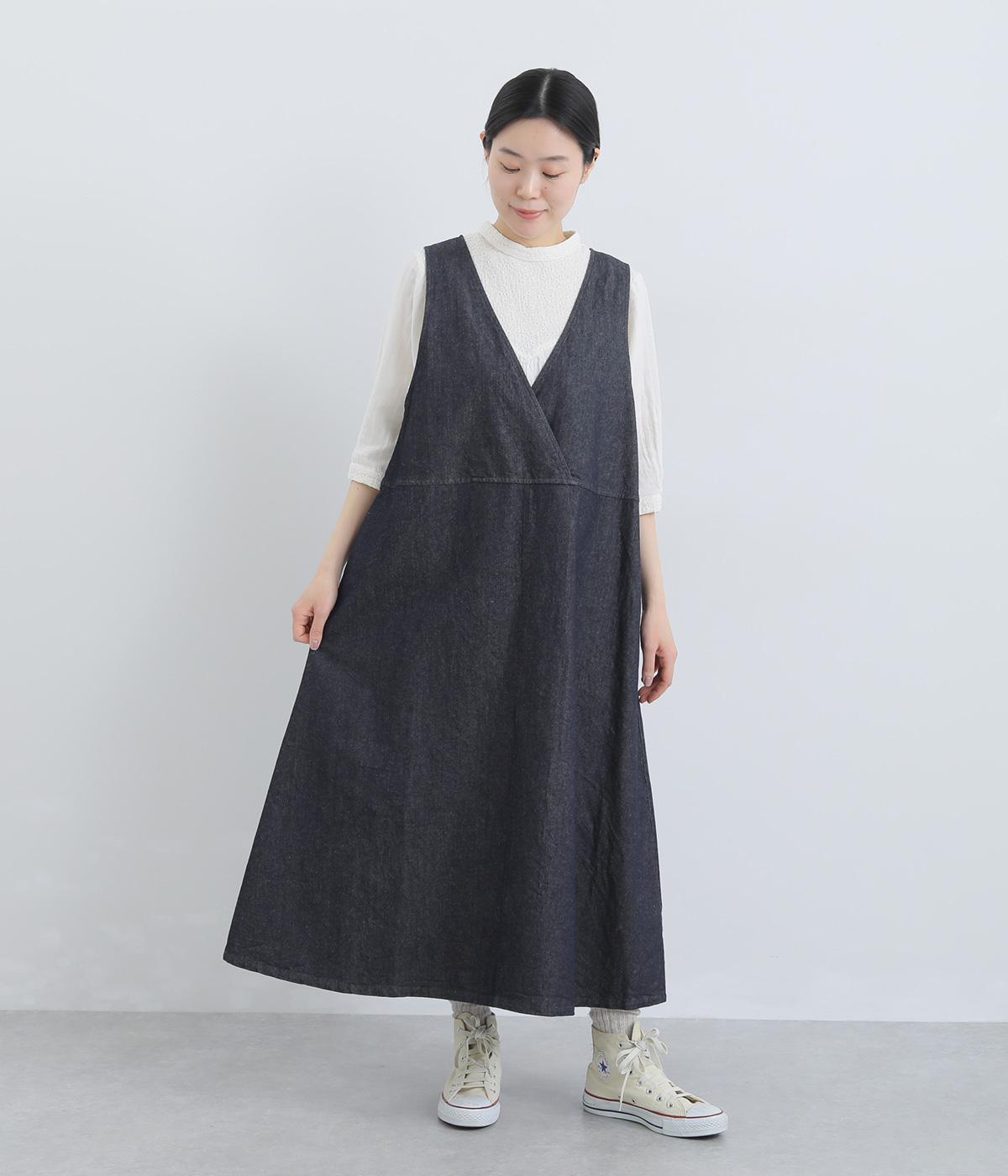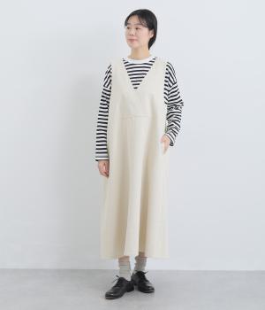 カシュクールのように重ねたVネックがほんのり大人顔な一枚。窮屈さのないフレアシルエットは広がりすぎずすとんと落ち、アンクルの見える着丈で適度な抜け感も意識しました。ゆったりしたアームホールでトップスも合わせやすく着まわし力も◎。